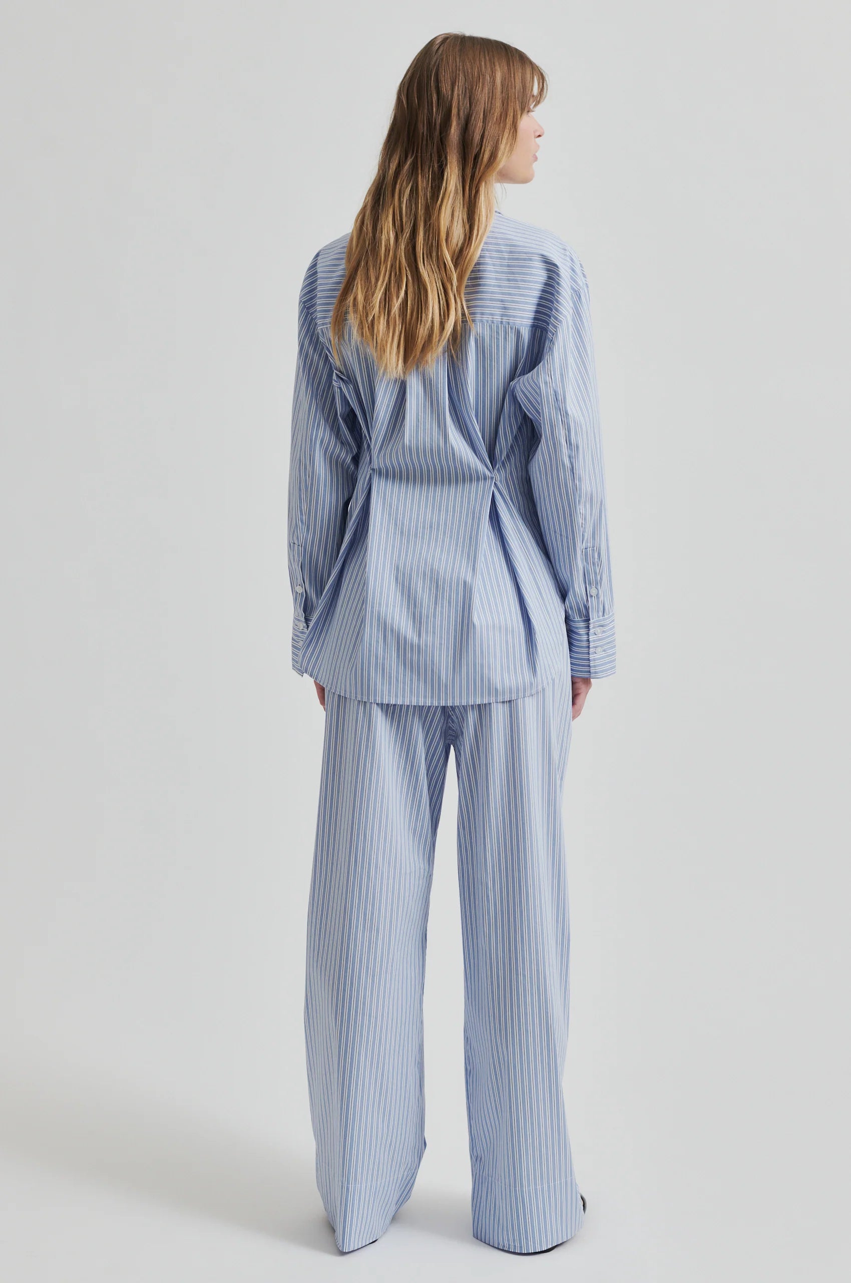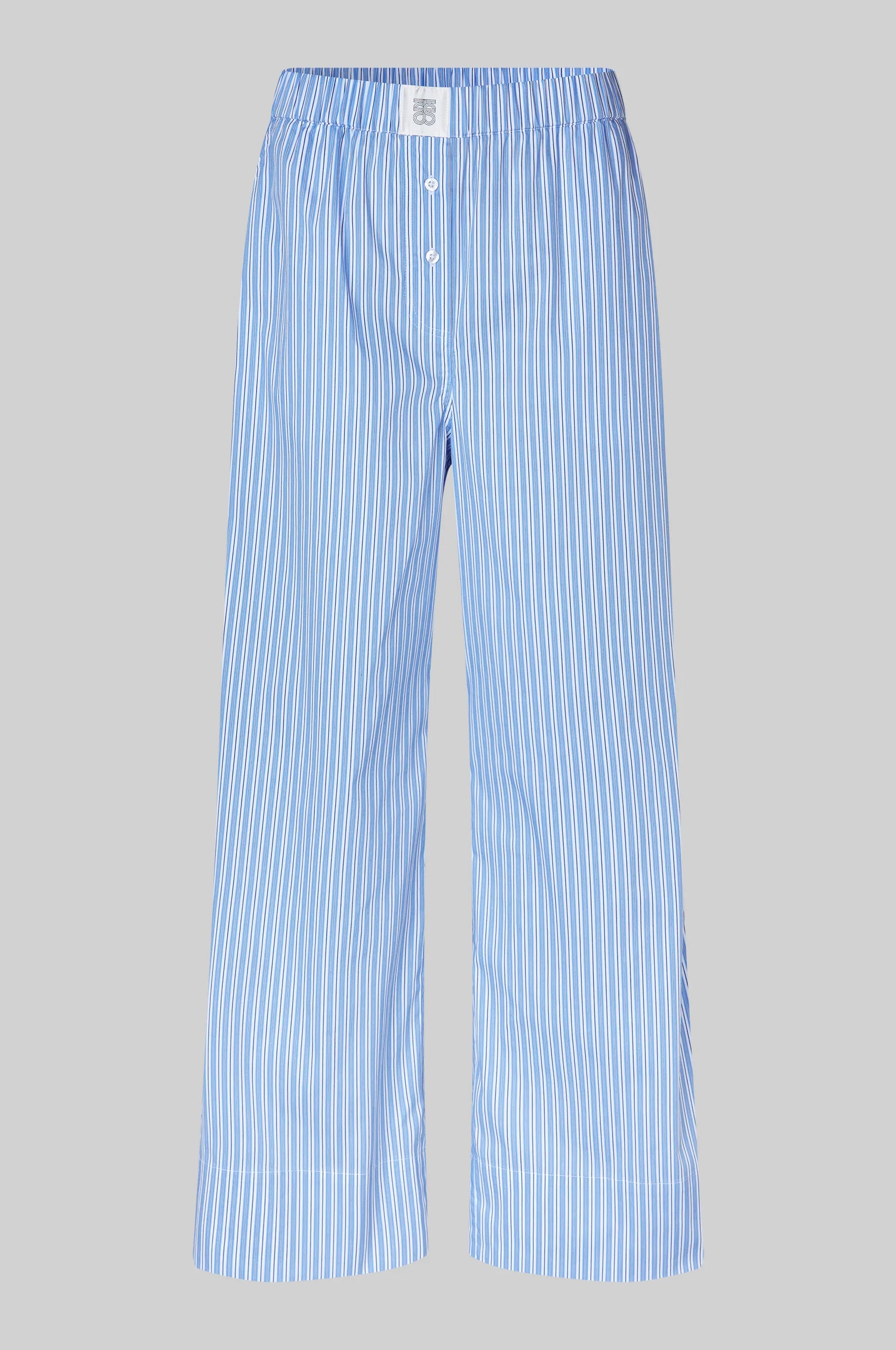 Els pantalons estan confeccionats en una barreja de cotó lleugera i suau amb ratlles per tota la peça. Amb cintura elàstica revestida i tanca de bragueta decorativa i botó amb logo. Dues butxaques inclinades al davant. Cintura mitjana amb camal recte i relaxat.