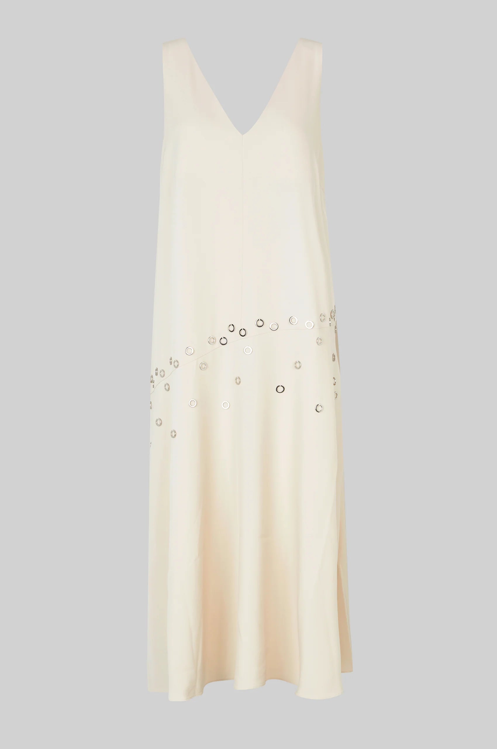 El vestit està confeccionat en un teixit llis i drapejat amb traus repartits en diagonal per davant i per darrere. Amb escot de bec i tirants amb peces llargues de teixit que continuen a l'esquena. Fenedura en un costat. Tall regular a la part superior amb faldilla lleugerament més folgada.CARACTERÍSTIQUES DEL PRODUCTE
