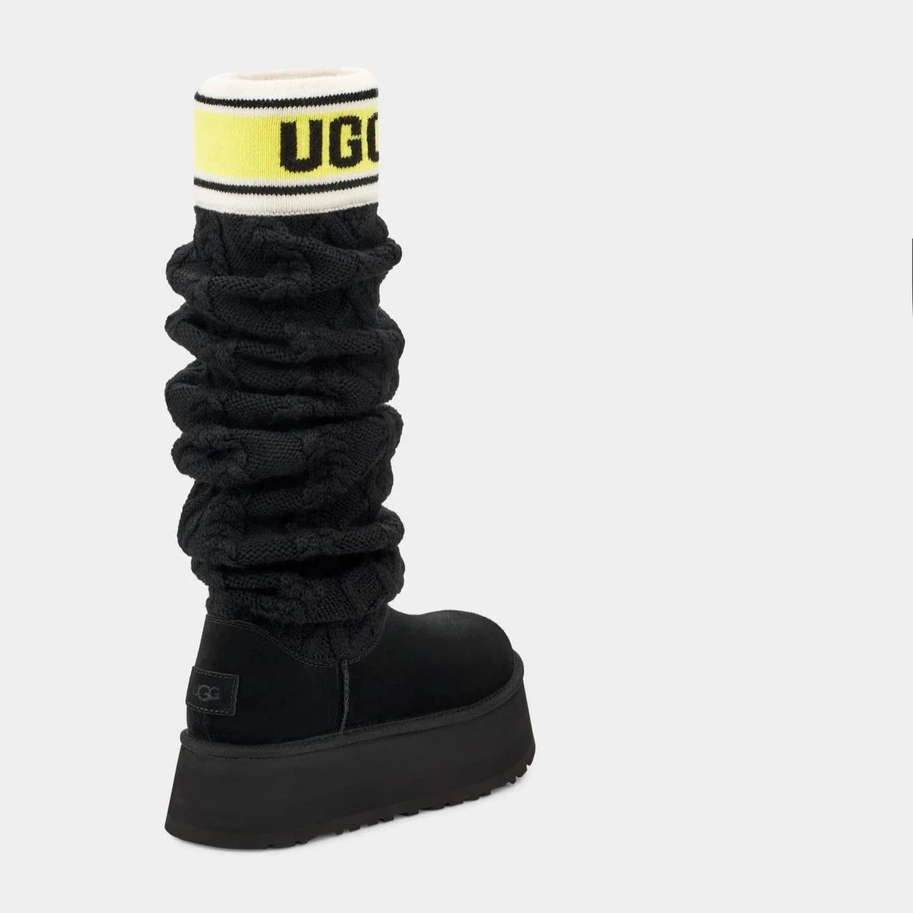 En part legging acollidor, en part plataforma aquesta bota et manté abrigada i té un aspecte ferotge. El suau teixit de punt per cable superior s'estén 23” fins a la cama i es remata amb una pelfa UGG ® logotip. L'entresola de plataforma lleugera està acabada amb la nostra sola SugarSole™, fabricada amb canya de sucre renovable alimentada amb aigua de pluja a lloc d'EVA derivada del petroli Combina-les amb pantalons curts per expressar-te sense límits o amb una faldilla llarga per a una capa extra de calidesa.