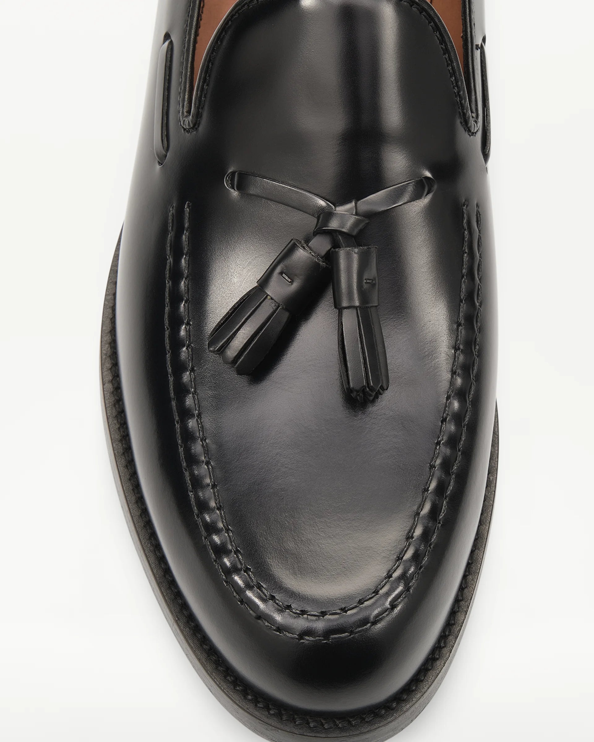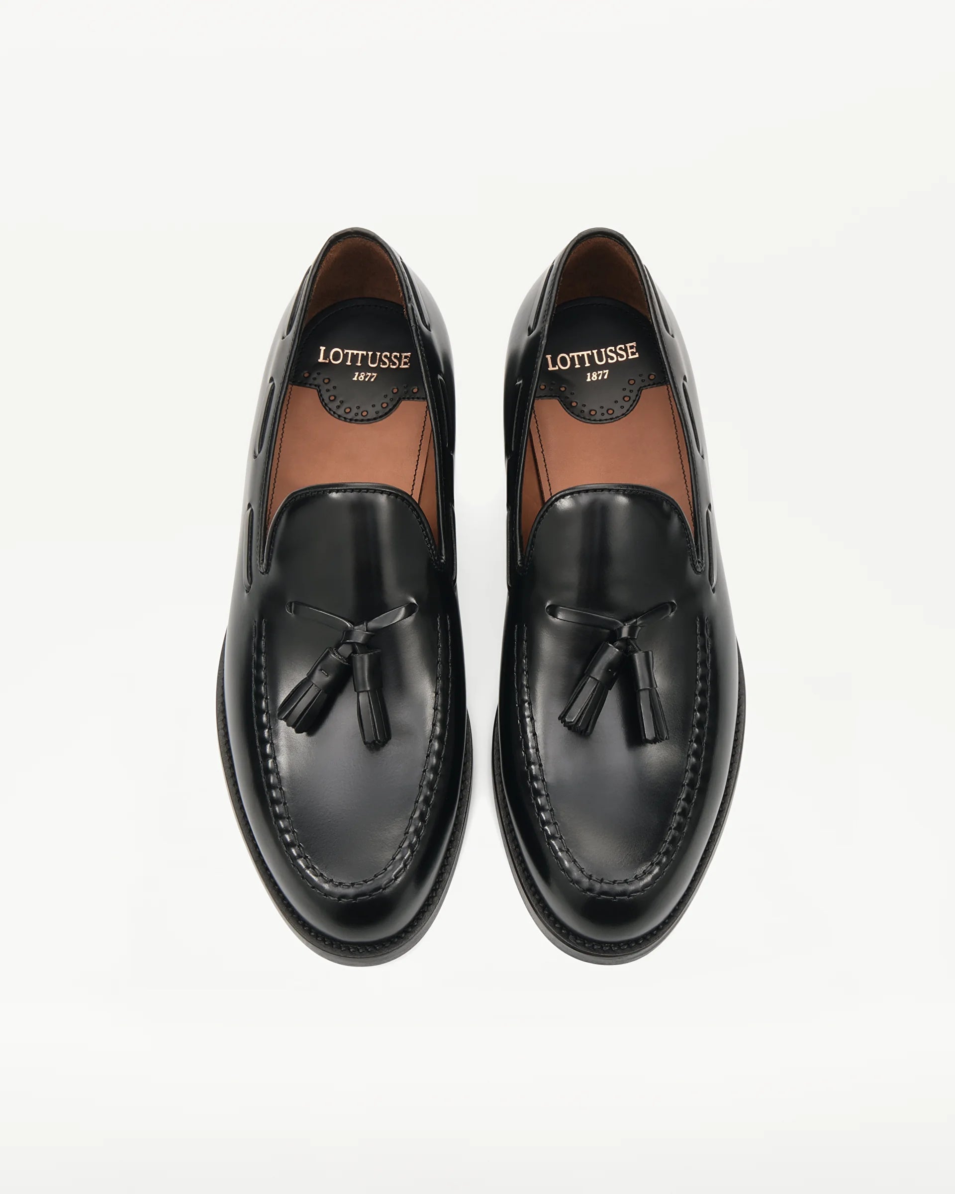 Aquests sofisticats mocasins per a home de Lottusse estan elaborats en autèntica pell de boví d'alta qualitat amb un luxós acabat brillant. El seu còmode disseny sense cordons permet posar-los i treure'ls amb la màxima comoditat. El seu elegant estil, amb detalls ornamentals i dues borles decoratives de pell, és perfecte per a esdeveniments formals i entorns professionals. El color negre tradicional aporta un look clàssic.