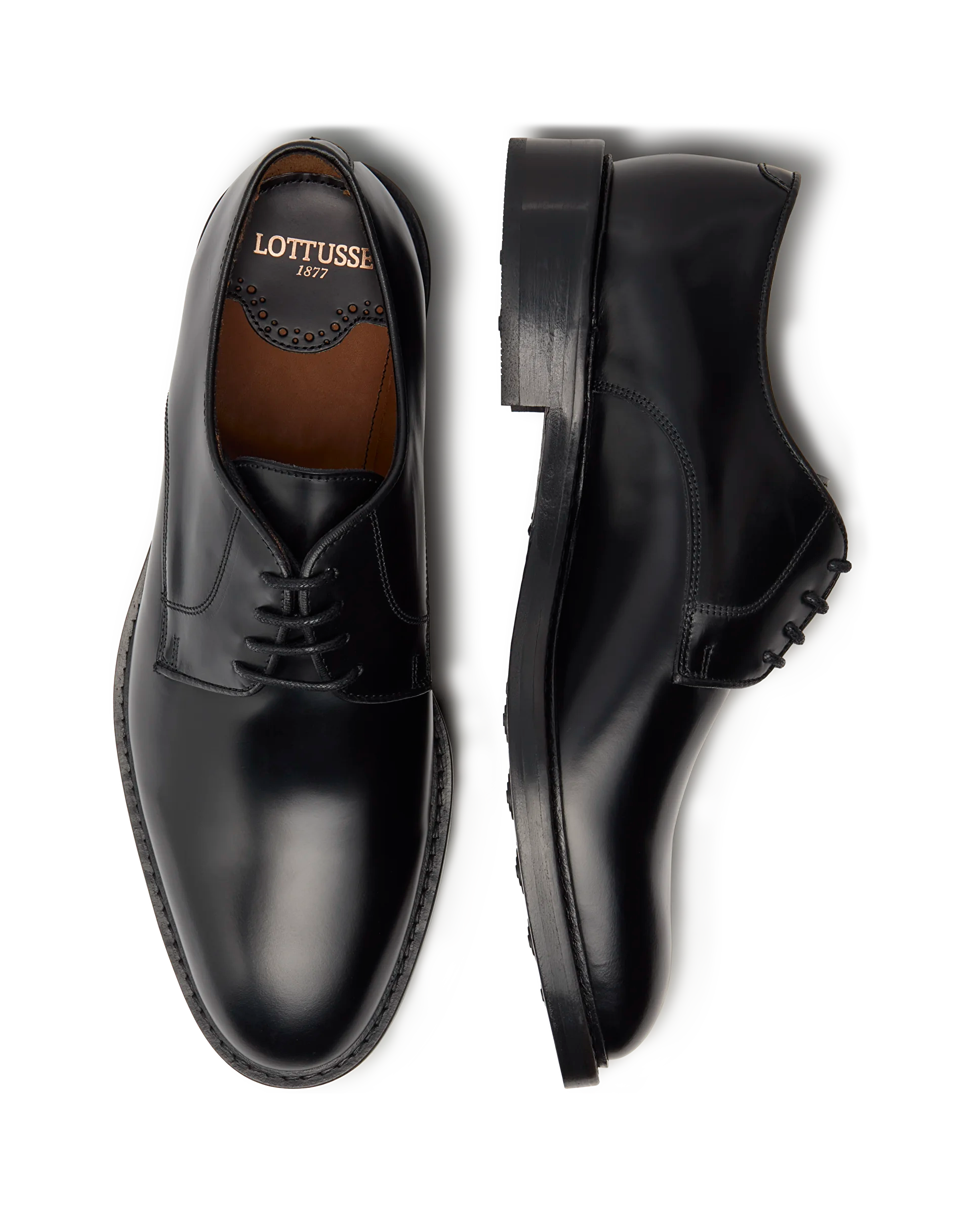 Aquesta sabata derbi per a home de Lottusse és lelecció perfecta per als que busquen sofisticació i comoditat. Confeccionat en pell de boví suau i flexible amb un luxós acabat brillant, aquesta sabata destaca pel seu estil tradicional derbi i el seu clàssic color negre.