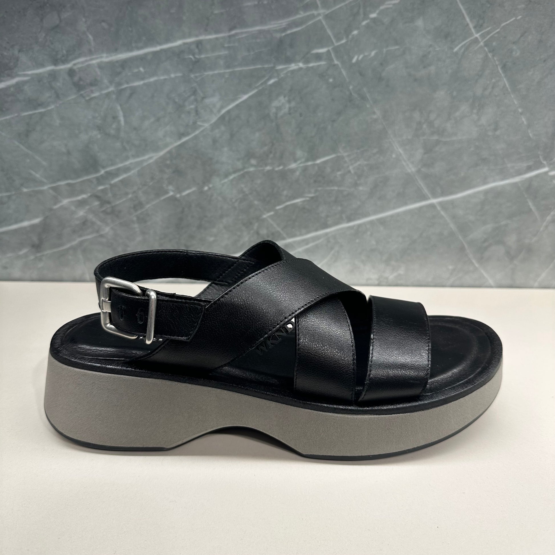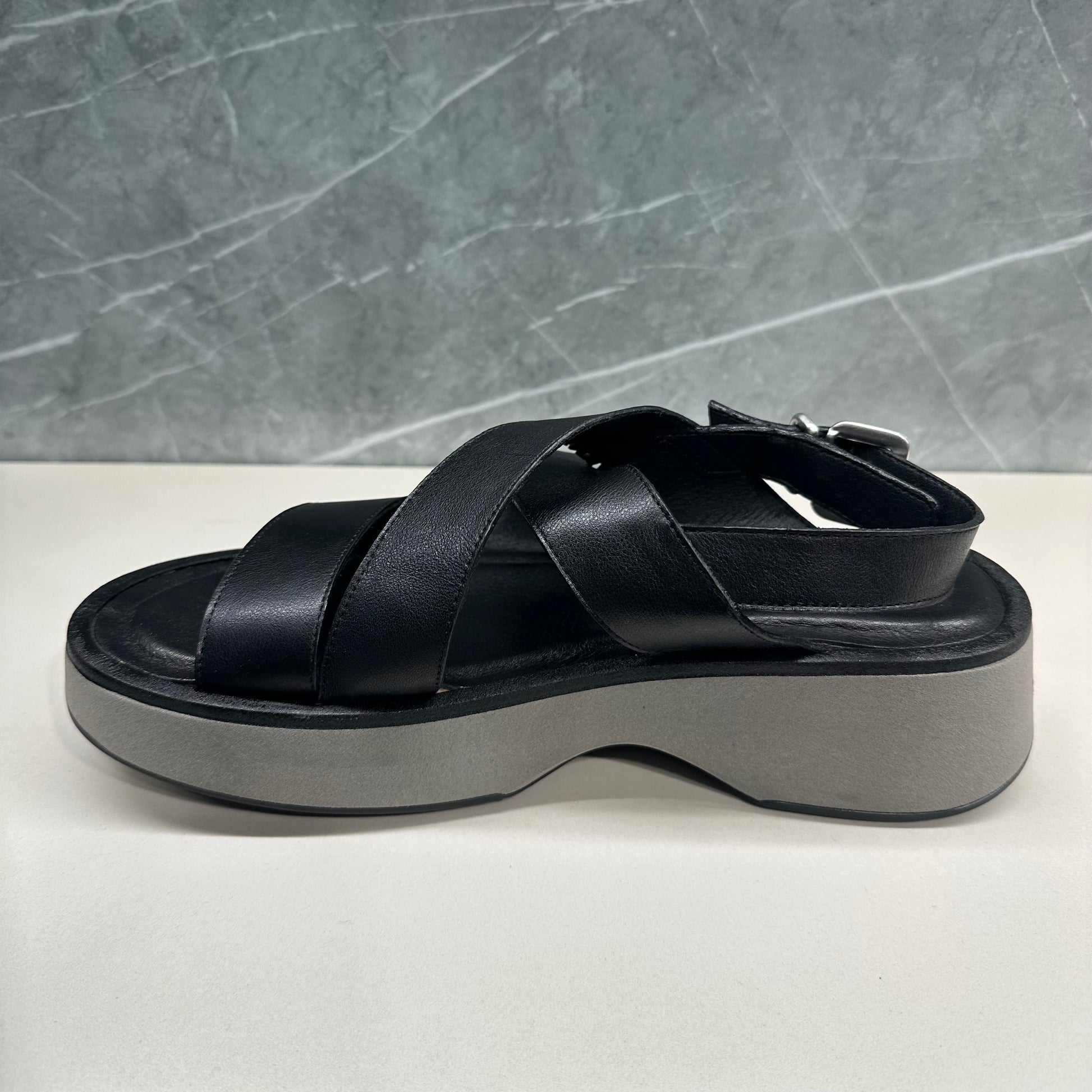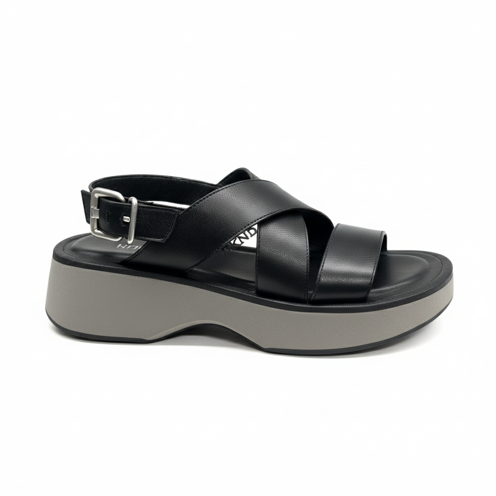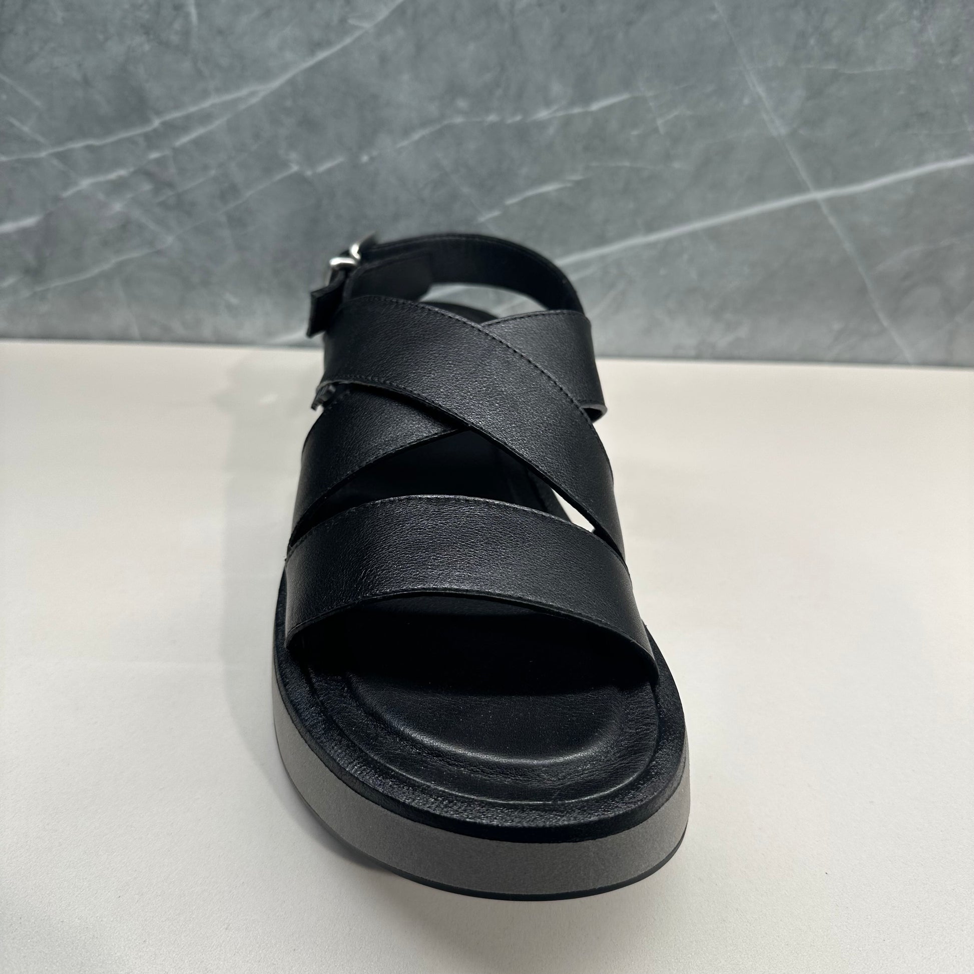 Flache schwarze Ledersandalen. Das Obermaterial besteht aus gekreuzten Riemen und verfügt über ein bequemes, modernes Plateau, das ihm ein einzigartiges und futuristisches Aussehen verleiht.