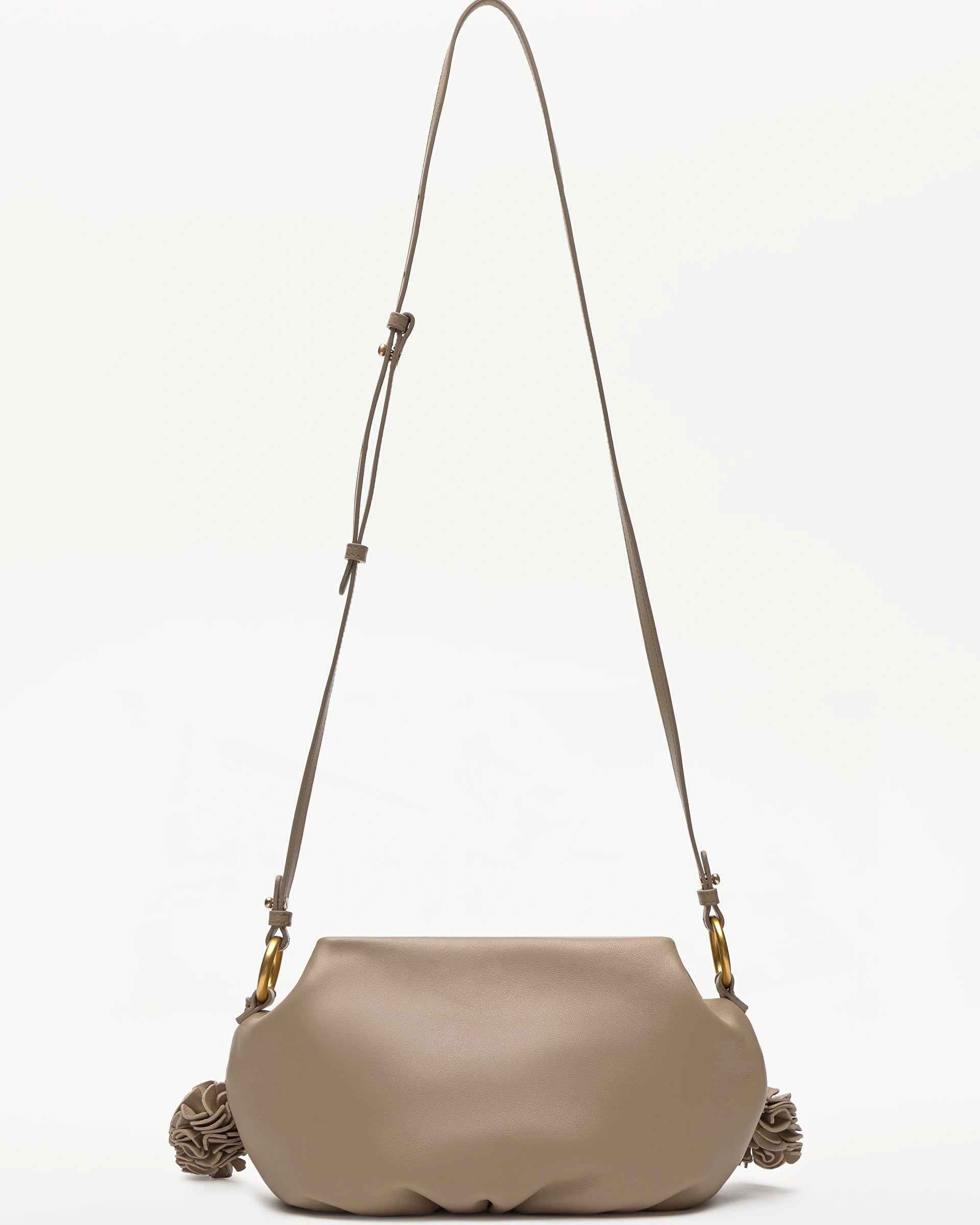 La línea Joy de Lottusse, epítome de felicidad y comodidad, es ideal para uso diario y ocasiones especiales, destacándose por su ligereza y suavidad. Esta colección convierte cada bolso en una joya única con sus fornituras y ornamentos de piel, junto a su diseño distintivo de formas redondeadas y pliegues, reflejando el estilo inconfundible de Lottusse. Este bolso de hombro estilo bombonera, es un bolso muy cómodo de tamaño medio. Tiene un asa crossbody ajustable. Cierre con fuelle y magnético. Fornituras de latón en acabado oro envejecido. Adornos florares de piel en ambos lados. Base ovalada con fruncido y vivo de piel. Color claro muy versátil y forro interior de algodón 100%. Cada bolso Joy promete no solo embellecer tus conjuntos sino también ofrecer un placer inigualable al tacto.