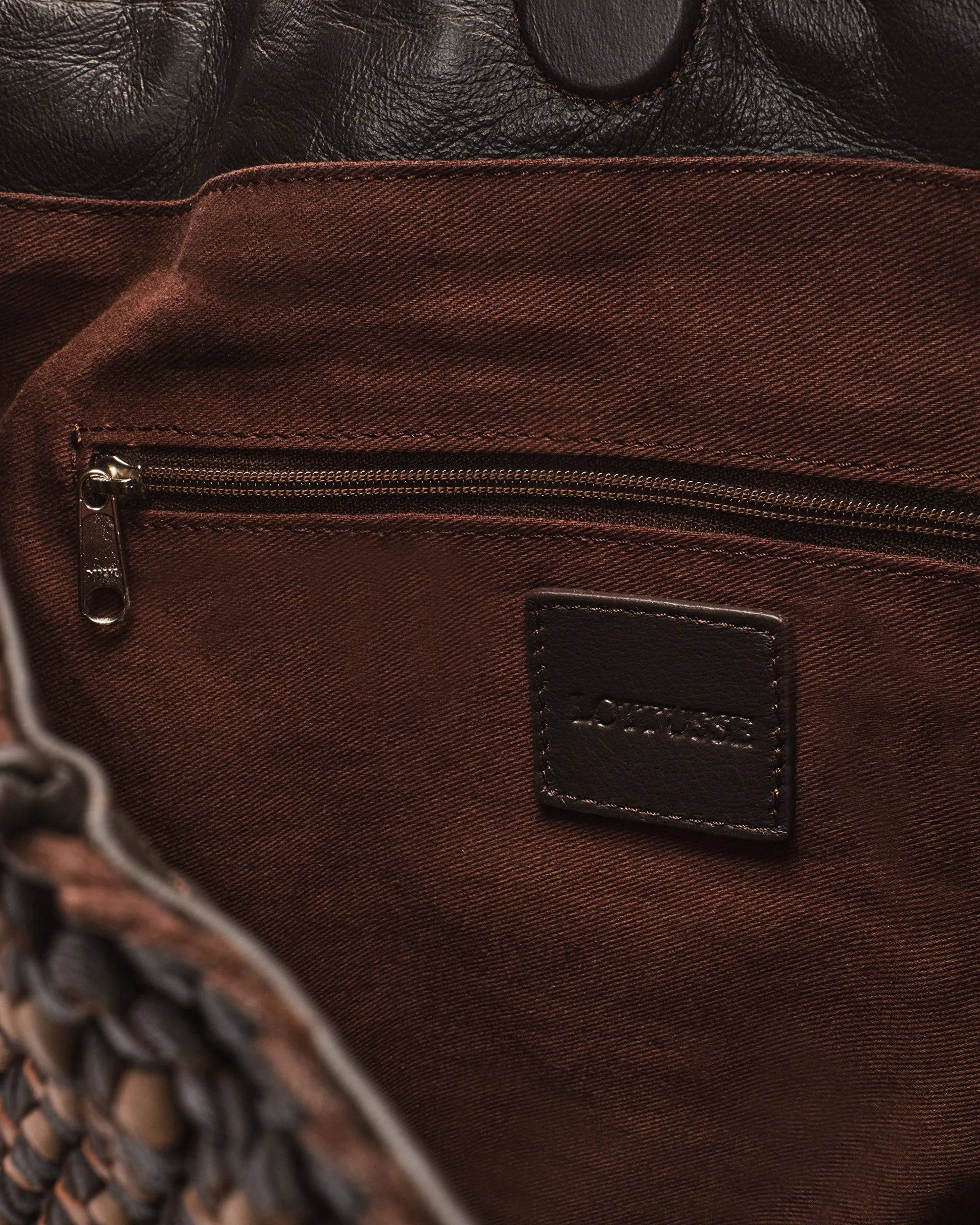 Sumérgete en la elegancia atemporal con el exclusivo bolso Hobo de la línea Noodbag. Este exquisito bolso, trenzado a mano con piel de cordero de la más alta calidad, presenta una forma rectangular que irradia sofisticación y estilo. Viene presentado en un versátil color Moka y con un cómodo cierre magnético..