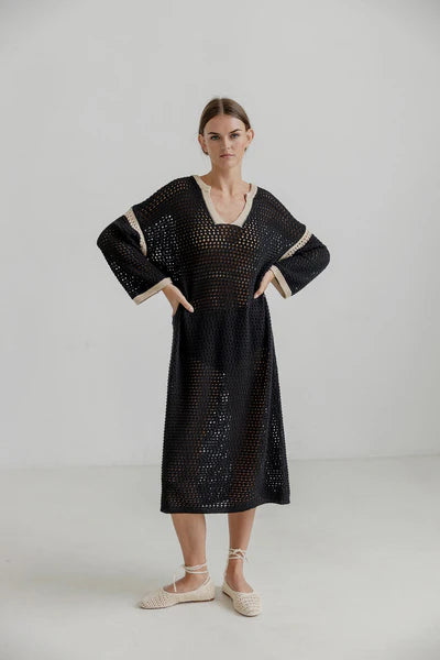 ALISTAIR is a long knit dress made from soft cotton acrylic. The cotton is Ecotec and made in Italy. The dress features an openwork knit pattern and contrasting trims on the neckline and sleeves. Wear it as a tunic or as a summer beach dress .