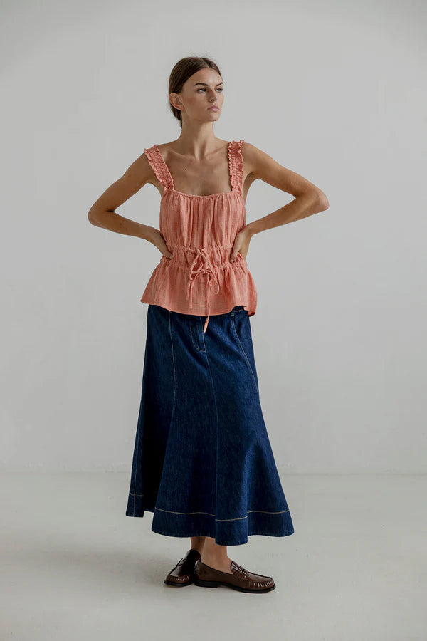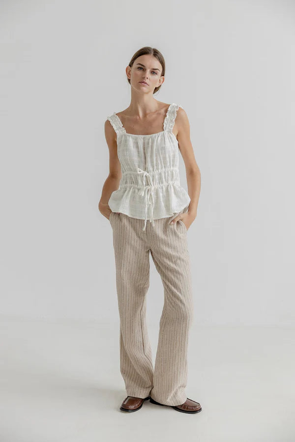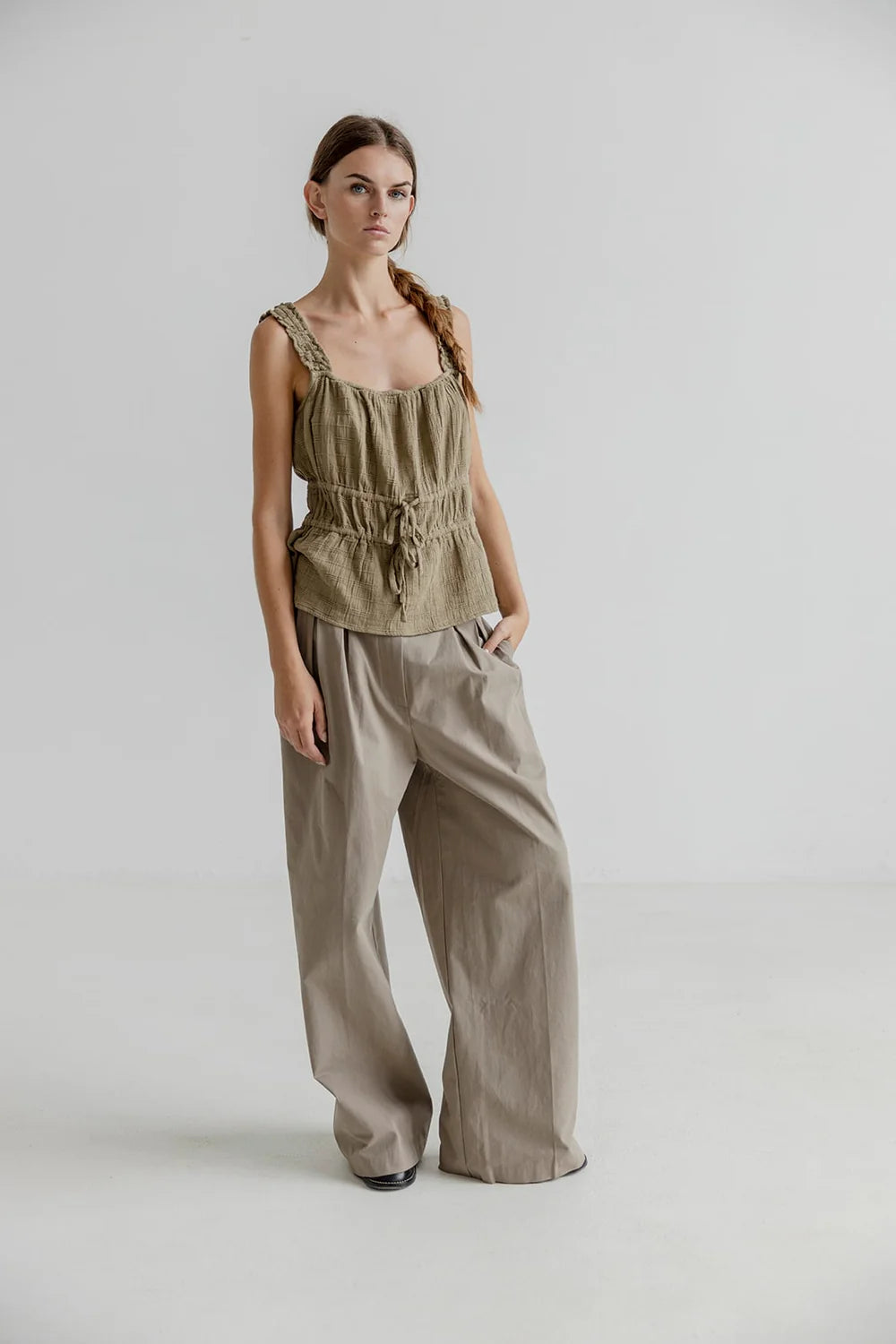 Tallis is a sleeveless blouse with lots of beautiful details. The straps have elastic gathers that give them a ruffled feel and are super comfortable. The blouse has a loose fit with two closures at the waist and drawstrings to adjust it to your liking. The fabric is super soft and delicate , and has a lightweight feel.