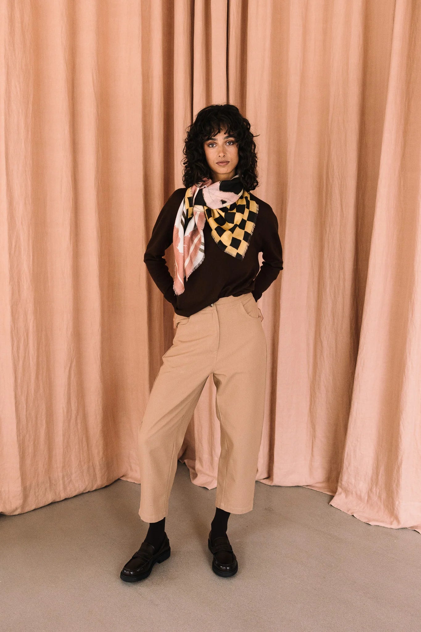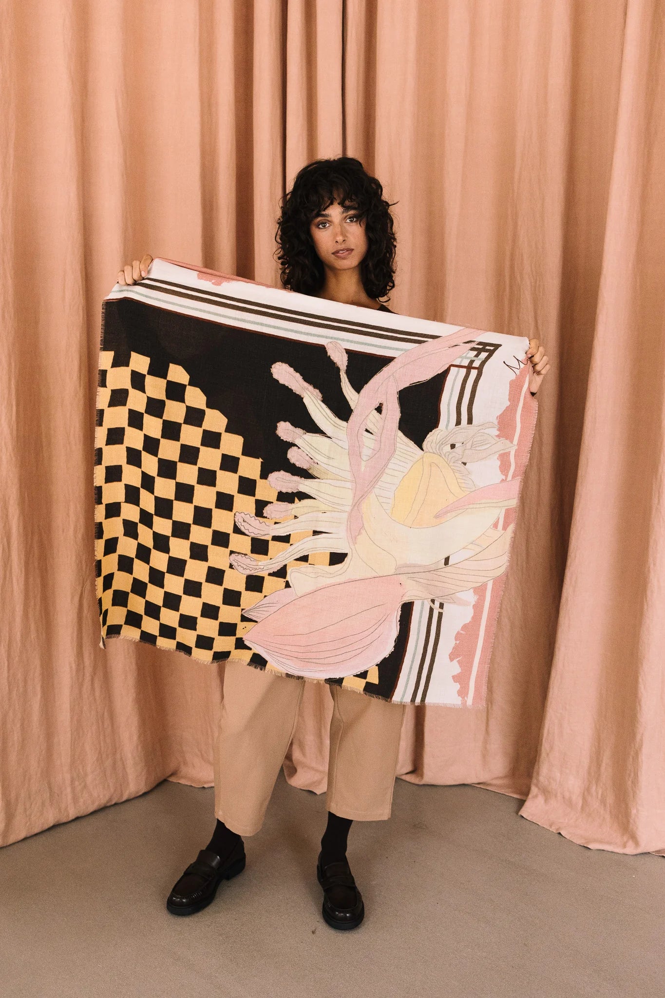 Pañuelo 100% lana, tejido cuidadosamente seleccionado y con estampado realizado a mano. Perteneciente a la Colección "Autumn-Winter 25"