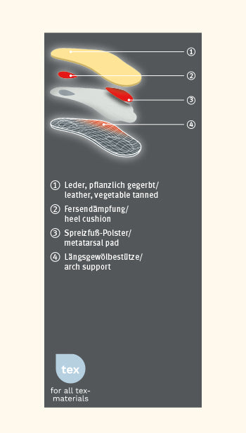 The short, vegetable-tanned cowhide insole gives your feet the freedom they need, as it is stripped down to the essentials and requires no leather in the forefoot area. Perfect for greater comfort even with narrow or open shoes. As simple as that.