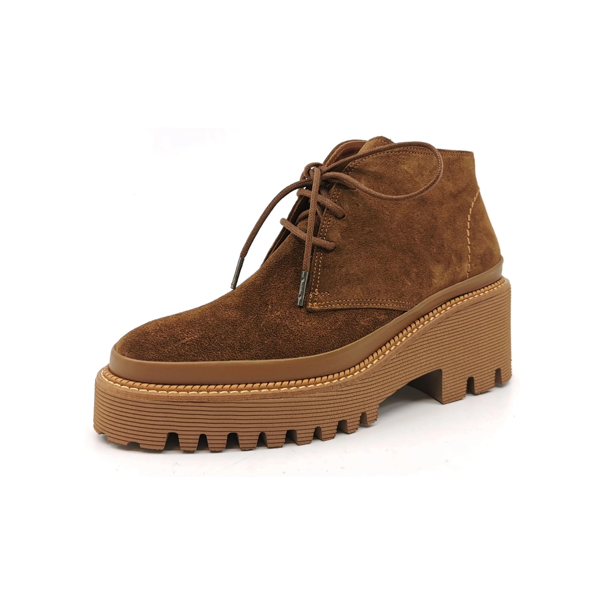 Botín de plataforma Carmen confeccionado a mano en piel velour color toffee. Cierre mediante cordones a tono. Piso extra ligero de goma antideslizante con tecnología light weight. Plantilla ortopédica y extraíble. Detalle de vira realizada en piel a tono. Altura plataforma 5,5, altura delantera 3,5 cm.