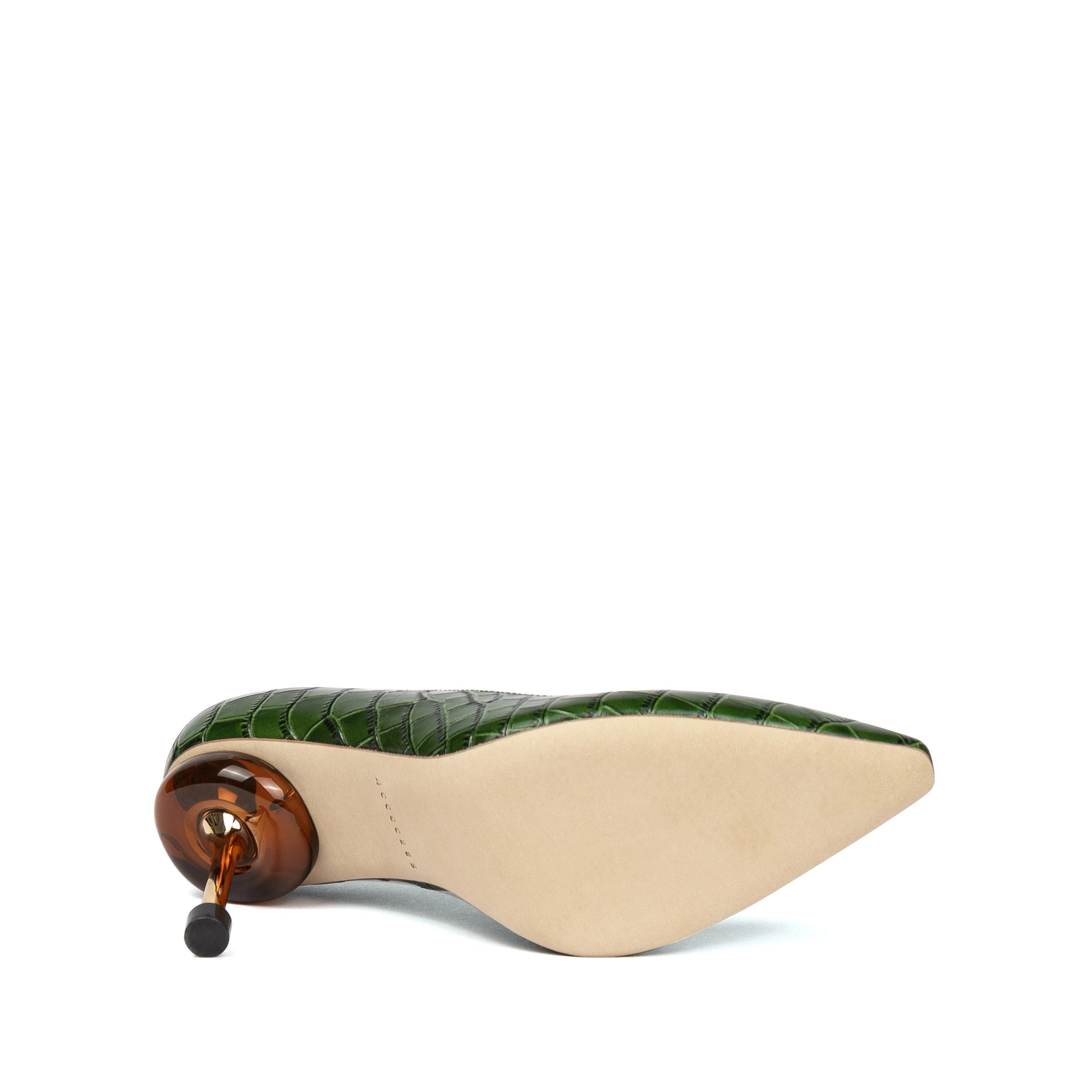 The Osha Mora Hi Pine dress shoes from 4CCCCEES are a sophisticated and modern style statement. Made from an elegant green leather print, they feature a pointed toe that adds a refined and formal air. The design is highlighted by a single heel in gold metal with a brown resin detail, which gives it a touch of distinction and originality.