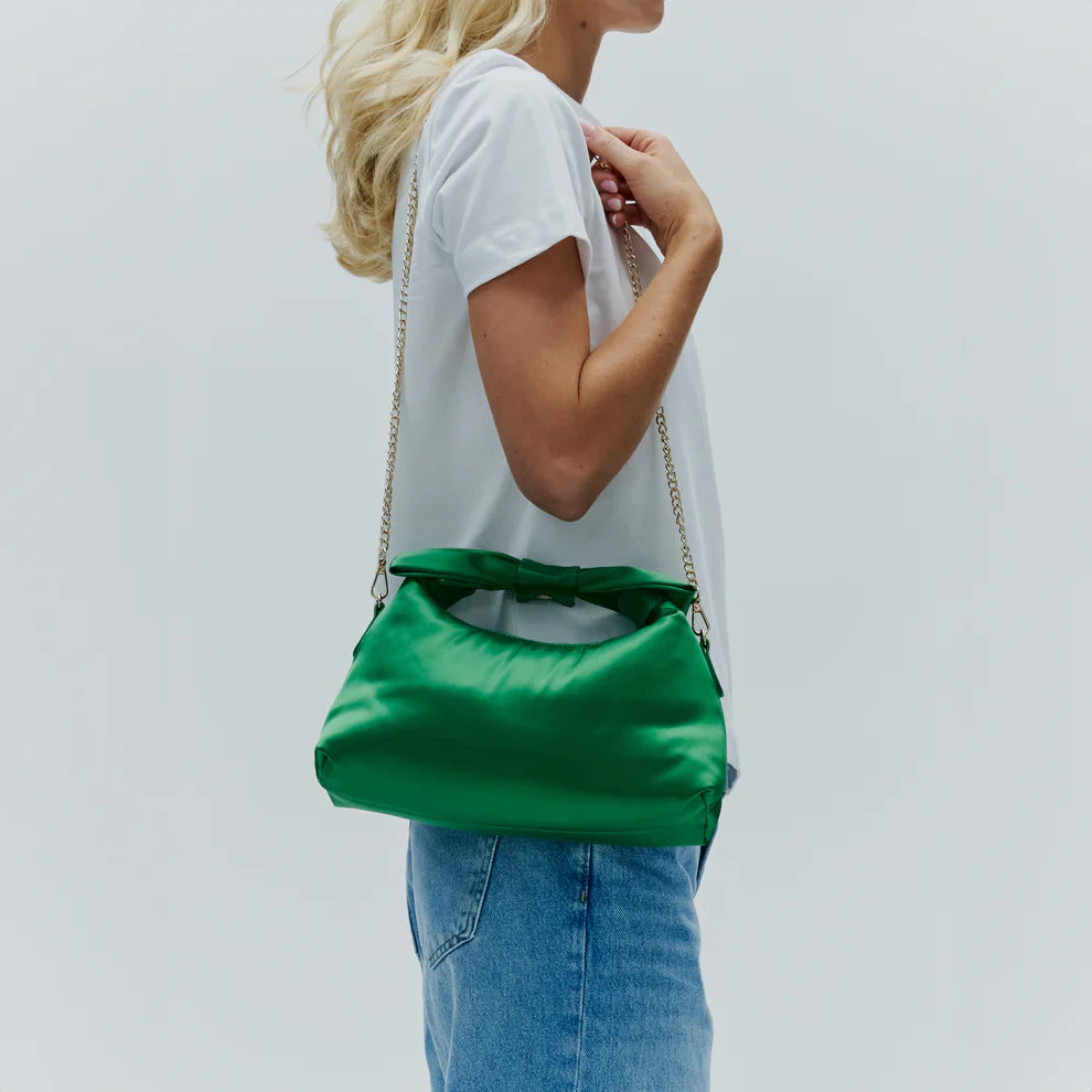 Dandy in a green satin style with a bow detail. The bow on handle is detachable. The bag consists of one main compartment. The bag has gold details and comes with a detachable chain strap.