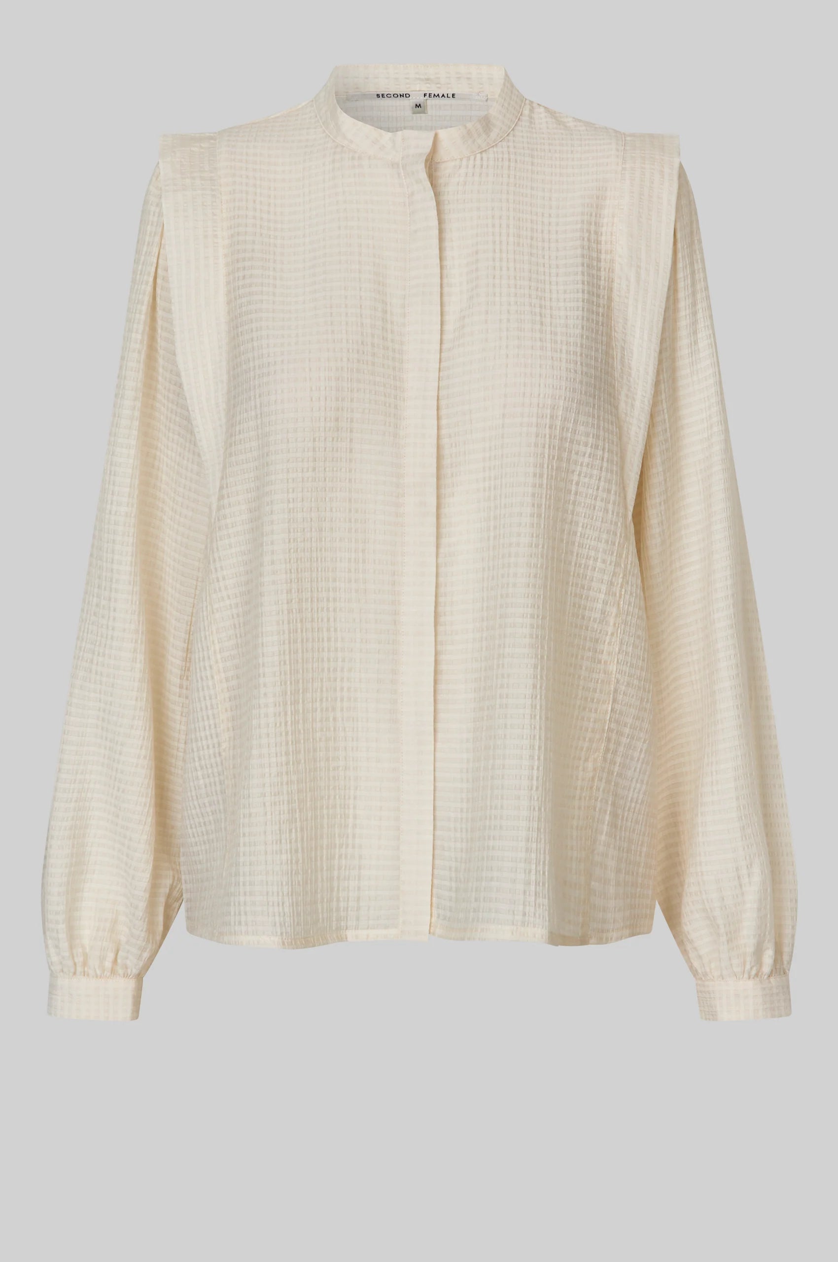 The Second Female Provence Shirt is crafted from a lightweight viscose blend with a seersucker structure and a delicate semi-sheer check pattern. Featuring a round neck design and concealed buttoning at the front, this shirt offers a sophisticated and modern touch. Structured shoulder detailing and long sleeves with buttoned cuffs add a refined feel to this regular fit garment, ideal for any occasion.
