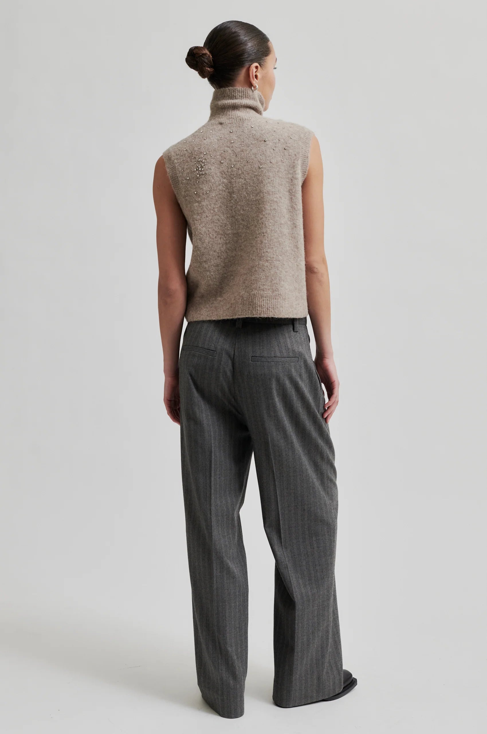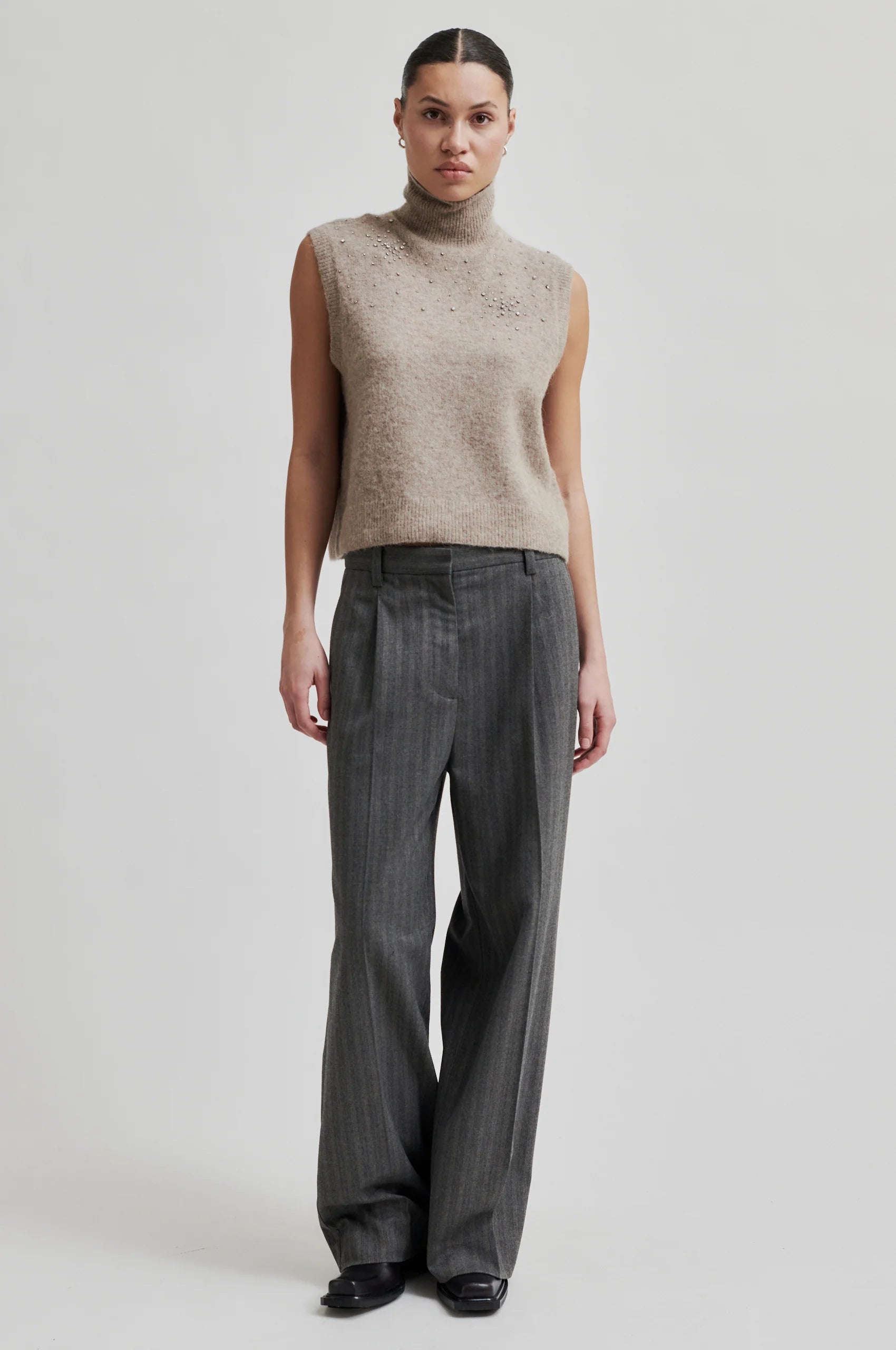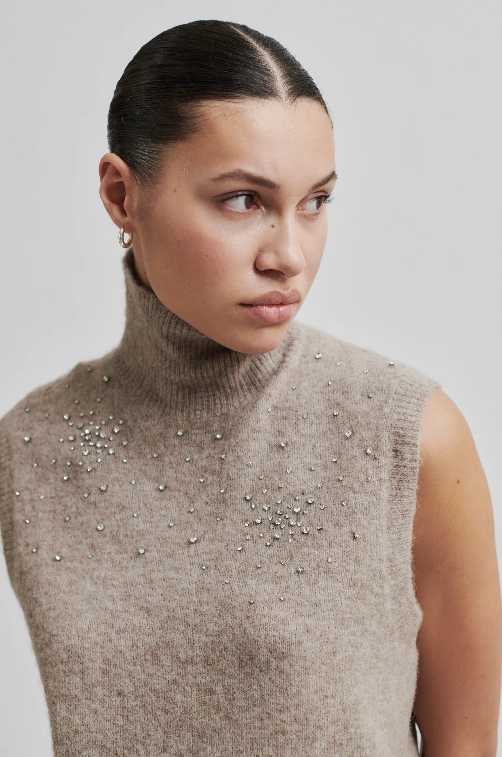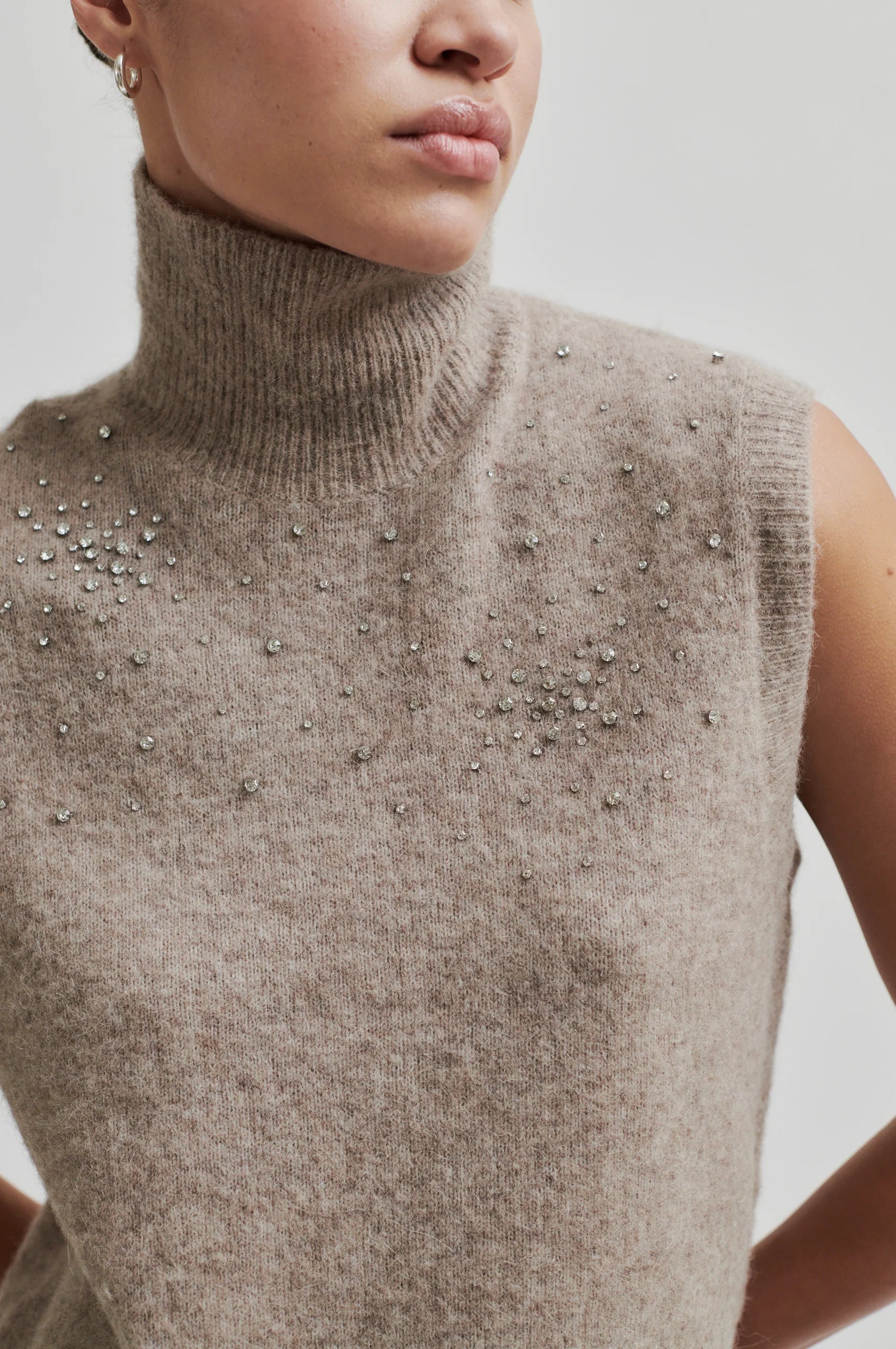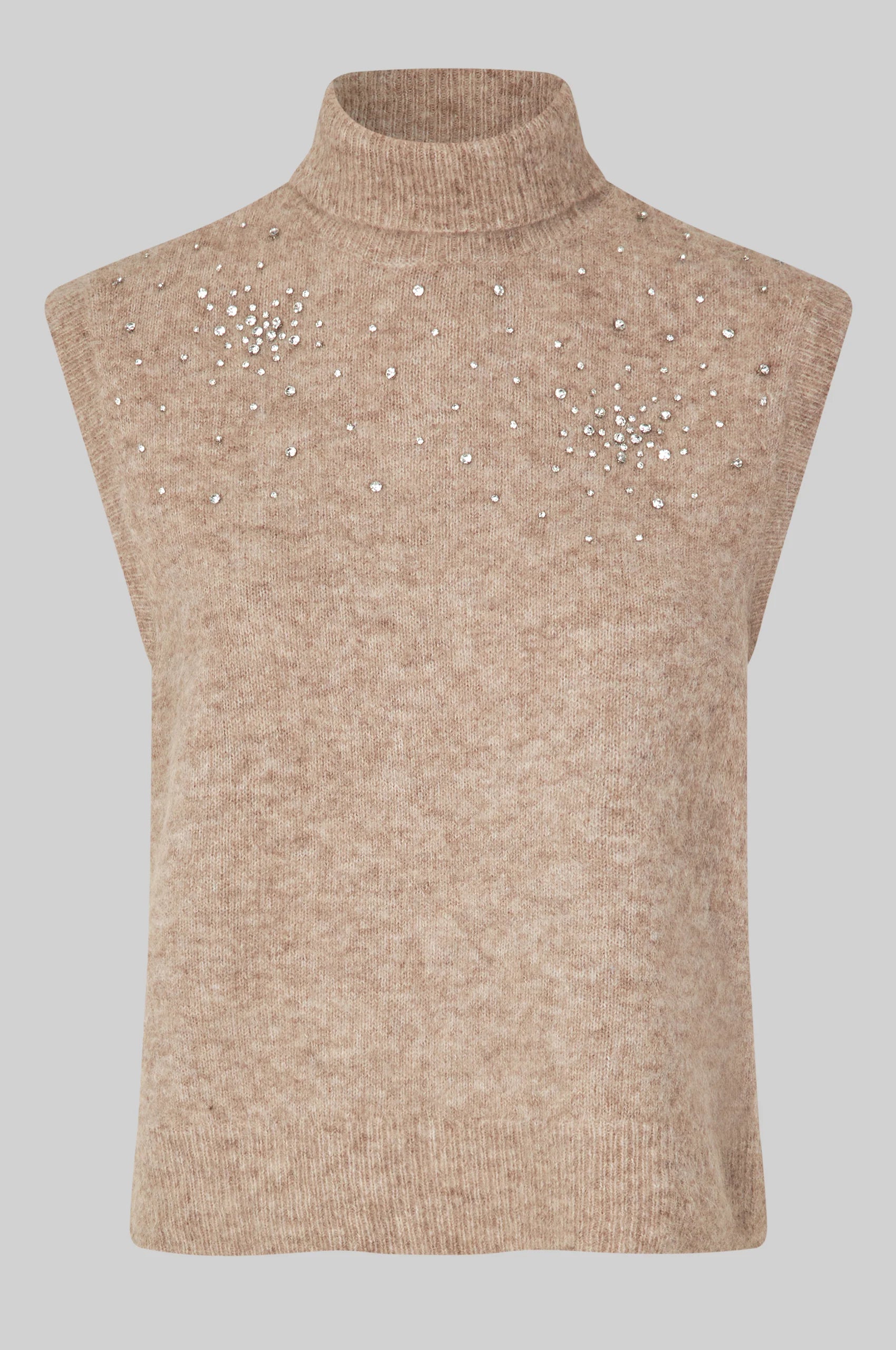 The Second Female Sparkling Knit Vest combines comfort with a touch of sophistication. This sleeveless jumper is crafted from a soft and stretchy alpaca and merino blend, making it an ideal piece for colder days. Embellished with small rhinestones scattered across the chest and shoulders, it brings a subtle yet elegant sparkle to any outfit. With a ribbed high neck, ribbed armholes and bottom hem, this vest offers a regular and flattering fit, perfect for layering with blouses or lightweight jumpers.
