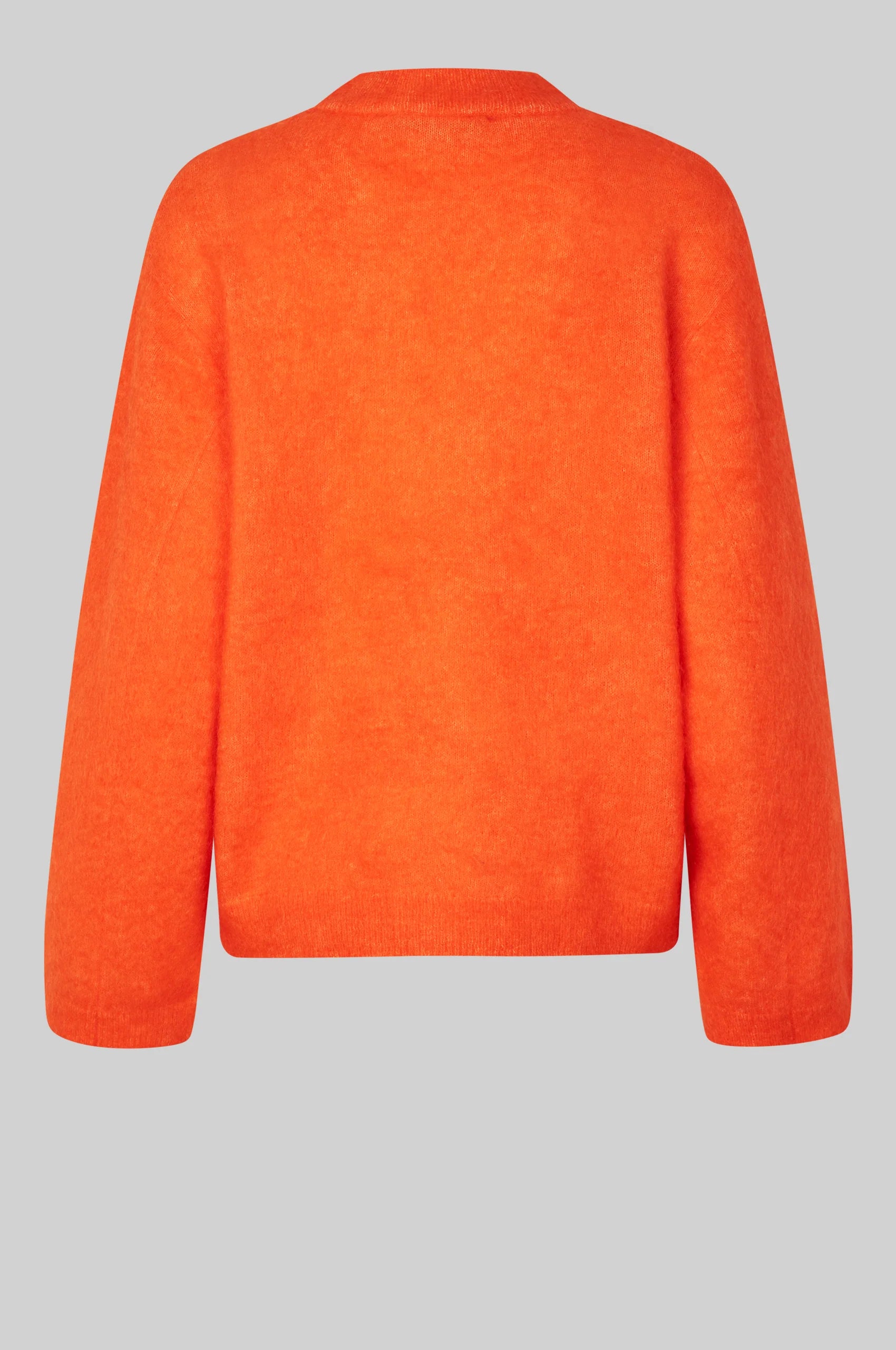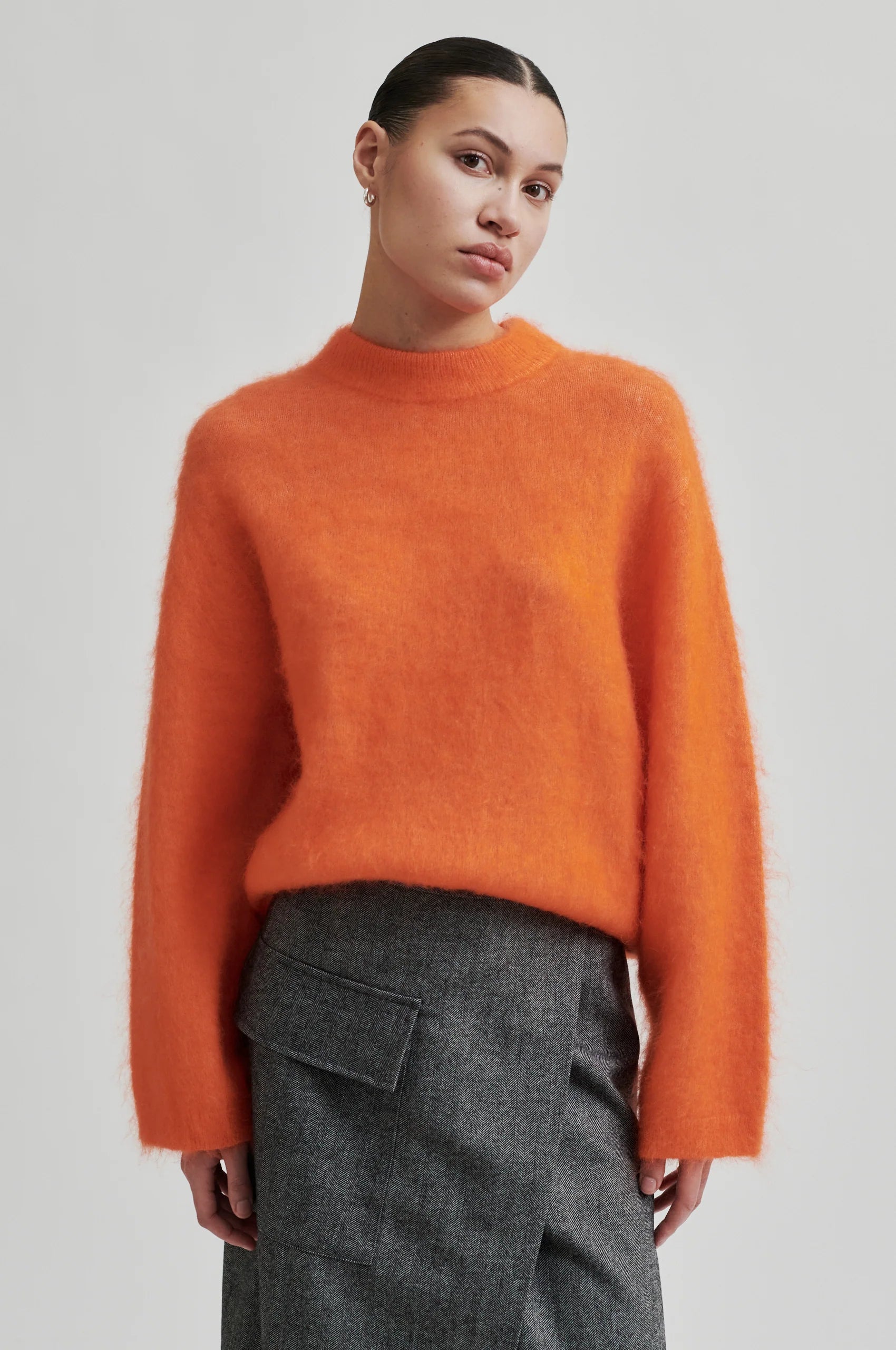 The Anneleen Knit O-Neck from Second Female combines comfort and elegance in a cozy, slouchy pullover. Made from a luxurious blend of mohair, wool, and polyamide, this piece features a relaxed fit and fluffy texture, perfect for cooler seasons. With its vibrant "Pureed Pumpkin" color, round neckline, and dropped shoulders, it adds a touch of sophistication to any casual or dressy outfit. Ribbed details on the neck, cuffs, and hem enhance the cozy, wide silhouette.
