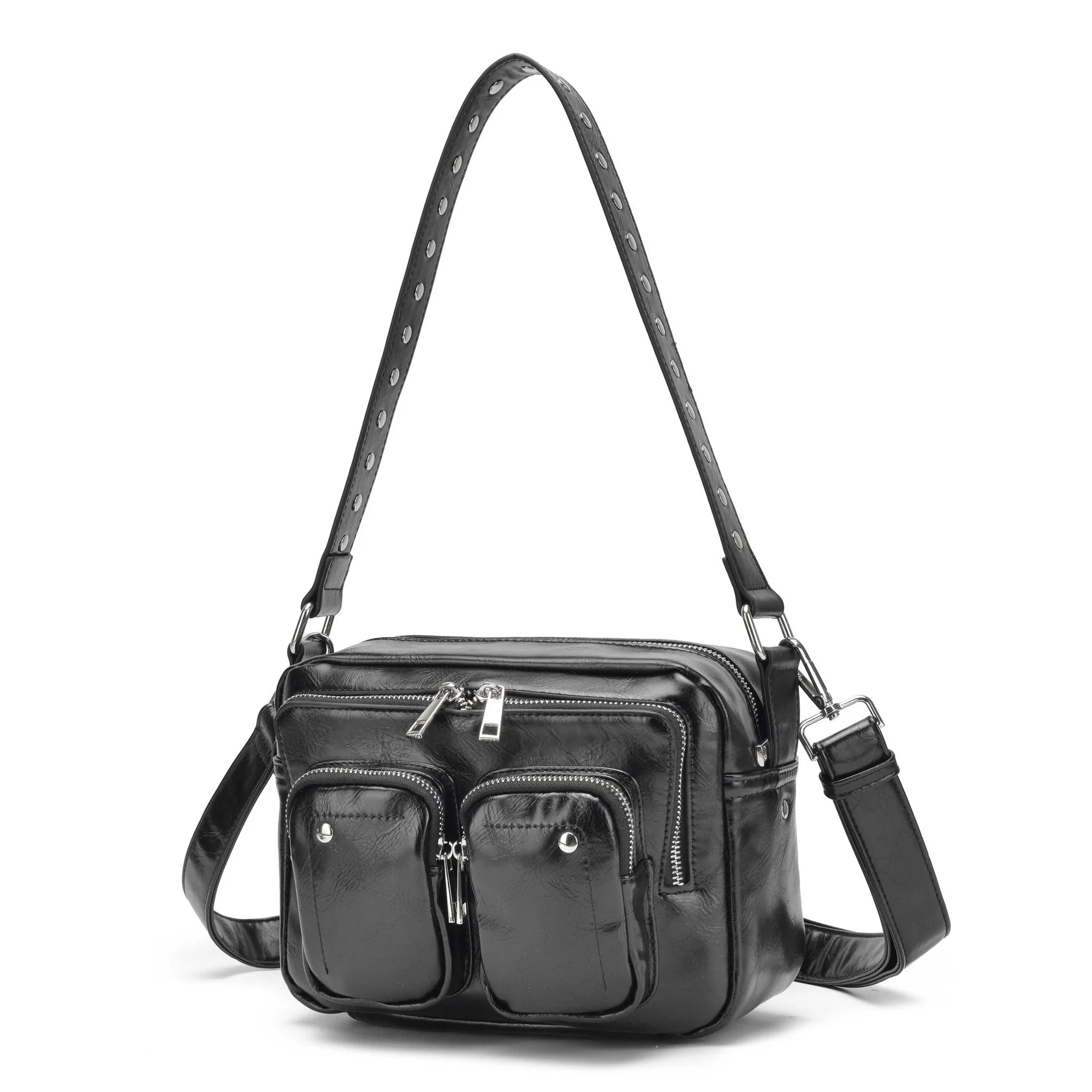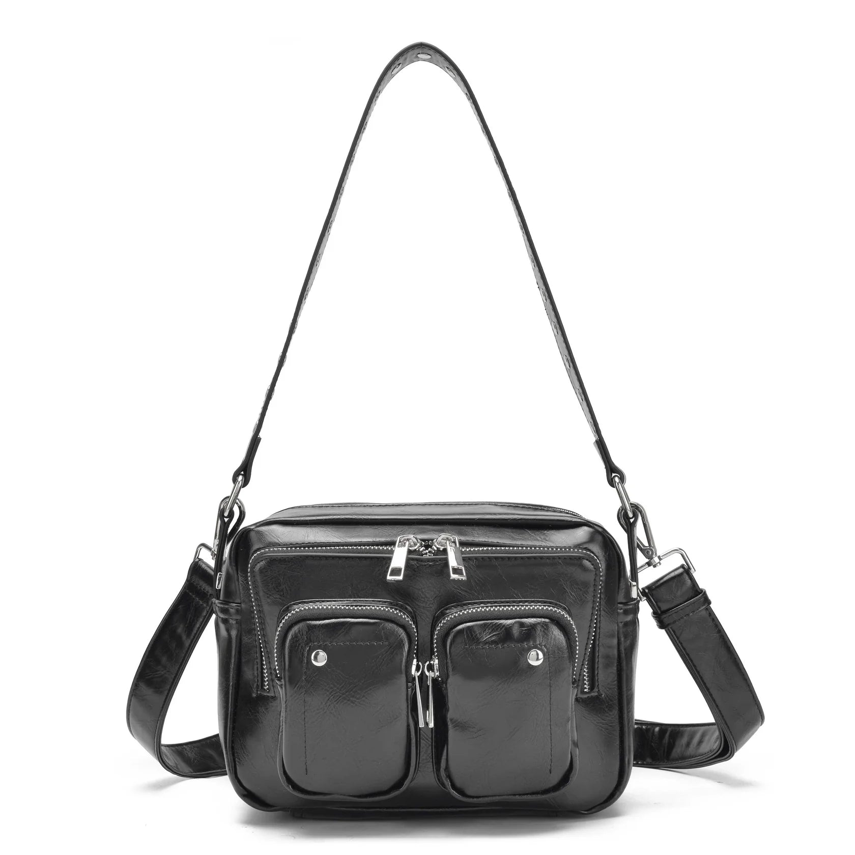 The Núnoo Ellie Wrinkle Bag in black is an ideal choice for those looking for a versatile everyday accessory . Crafted from recycled PU , this bag features two handy front pockets , a spacious main compartment and a smaller compartment, all with zip closure for added security. It includes one fixed strap and one adjustable, detachable strap , making it perfect to suit any style. or need.