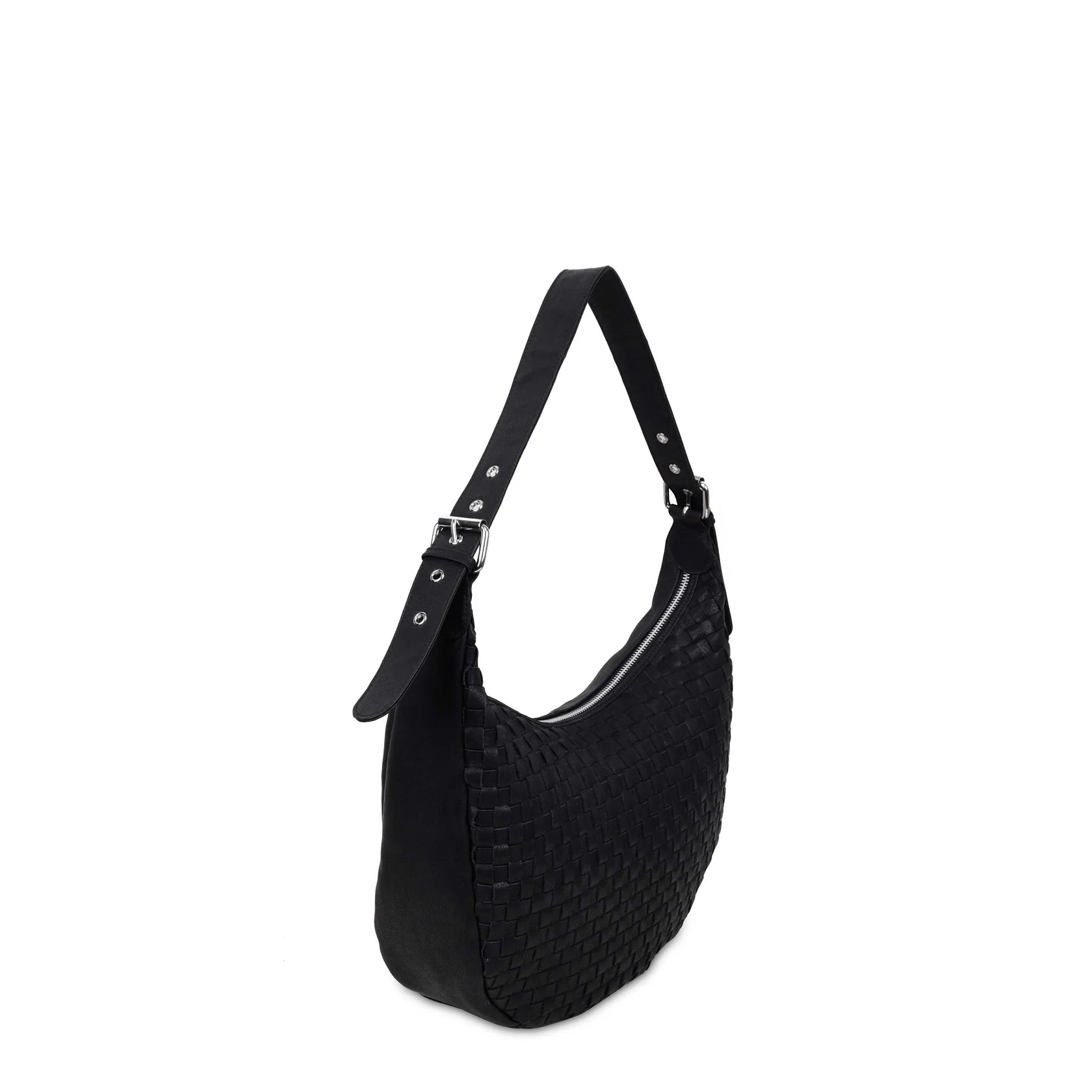 The Núnoo Small Stella bag in a black braided style is a stylish and practical accessory. Designed with an adjustable shoulder strap, this bag is perfect for comfortable carrying throughout the day. The zip closure ensures that all your belongings are well protected. Crafted from a combination of high-quality leather and cotton, its braided style adds a sophisticated and modern touch.