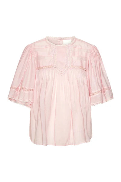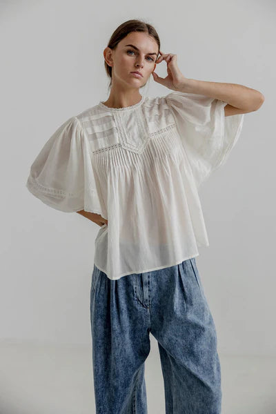 GALORE is a boho shirt with rich embroidery and pleats, crafted from lightweight organic cotton. It features loose sleeves and a button closure at the neck.