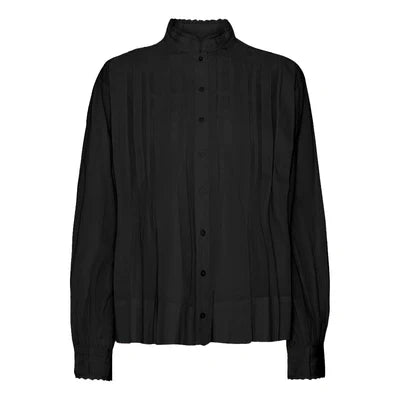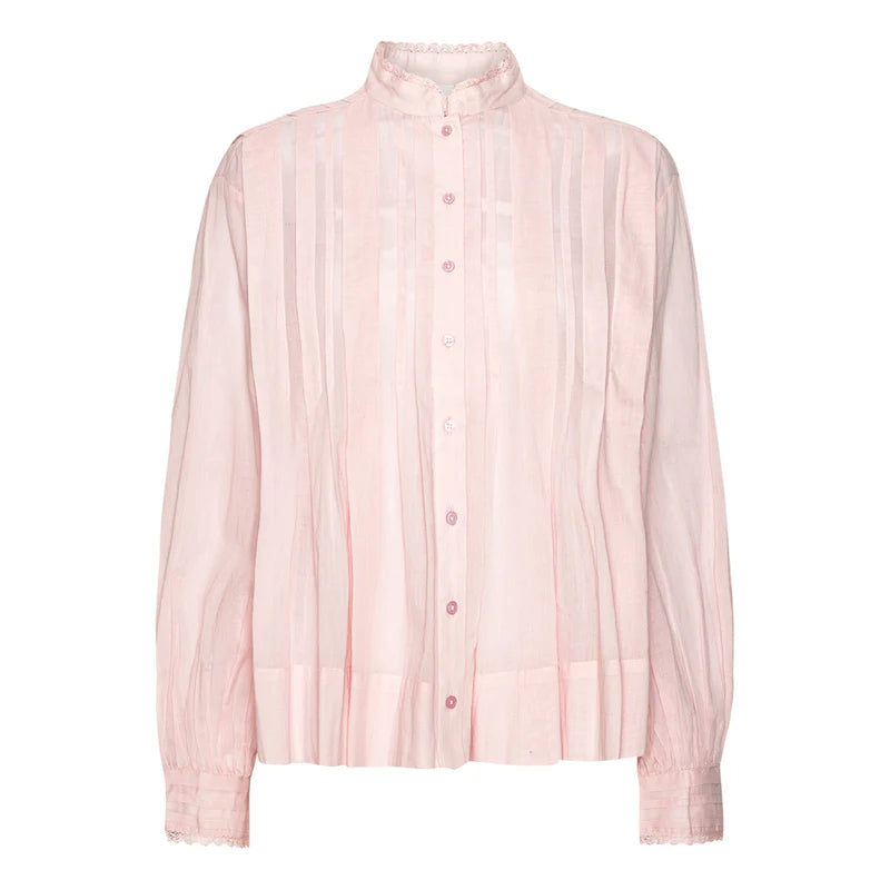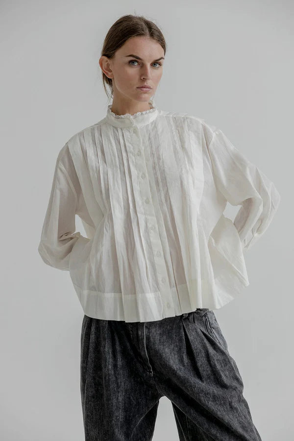 GISELE is a long-sleeved bohemian shirt with rich pleats at the front and back. It features embroidery on the collar and cuffs and is made from lightweight, flowy organic cotton.