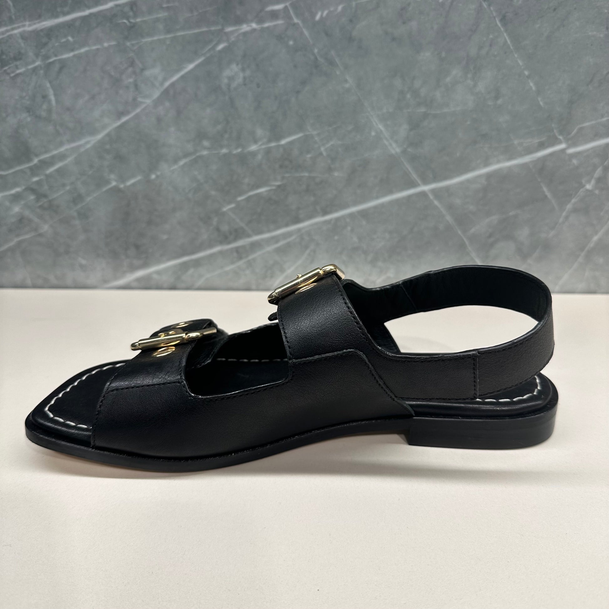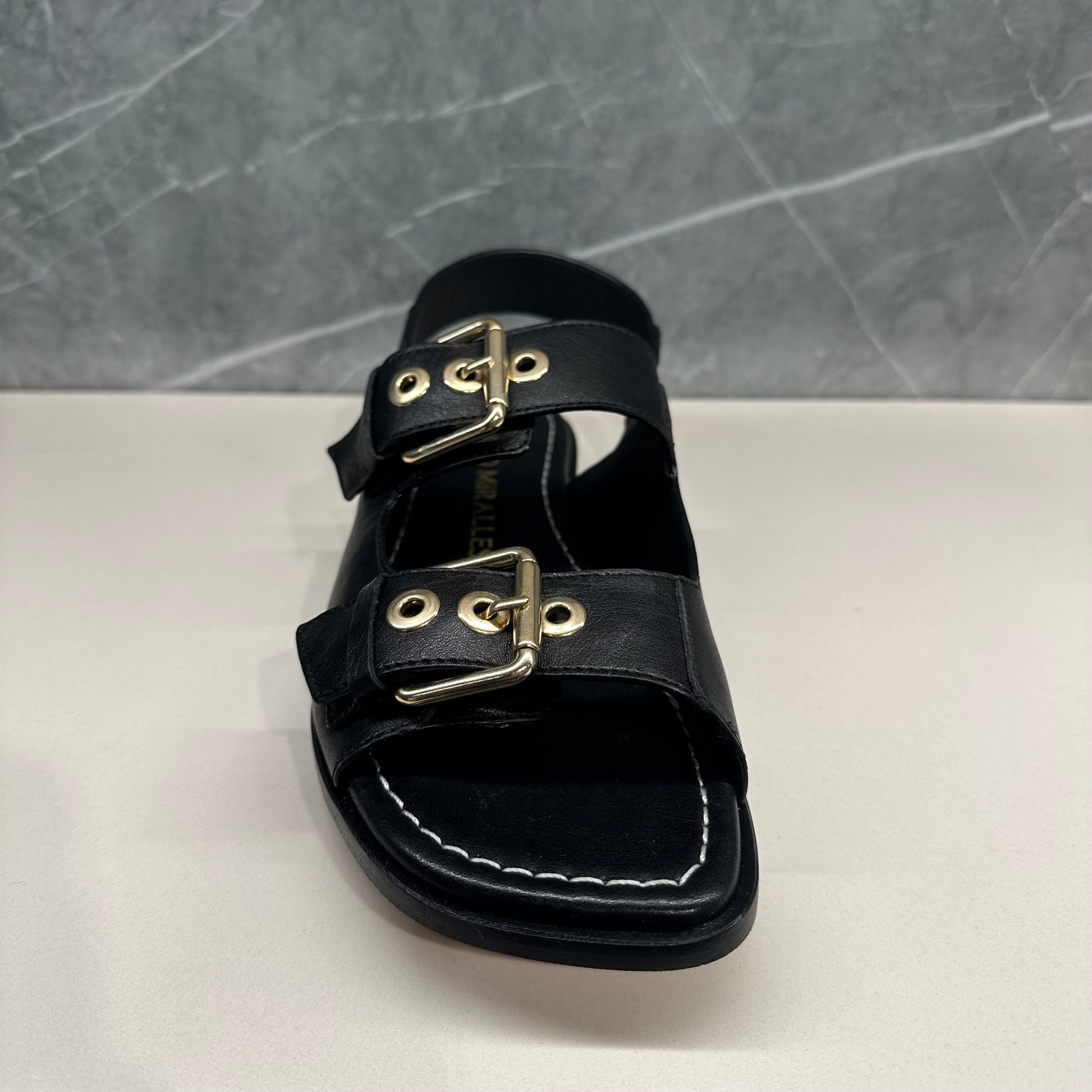 Sandalias planas de piel en color negro. Confeccionadas con los mejores materiales y rematadas con hebillas elegantes para conseguir un diseño reluciente.