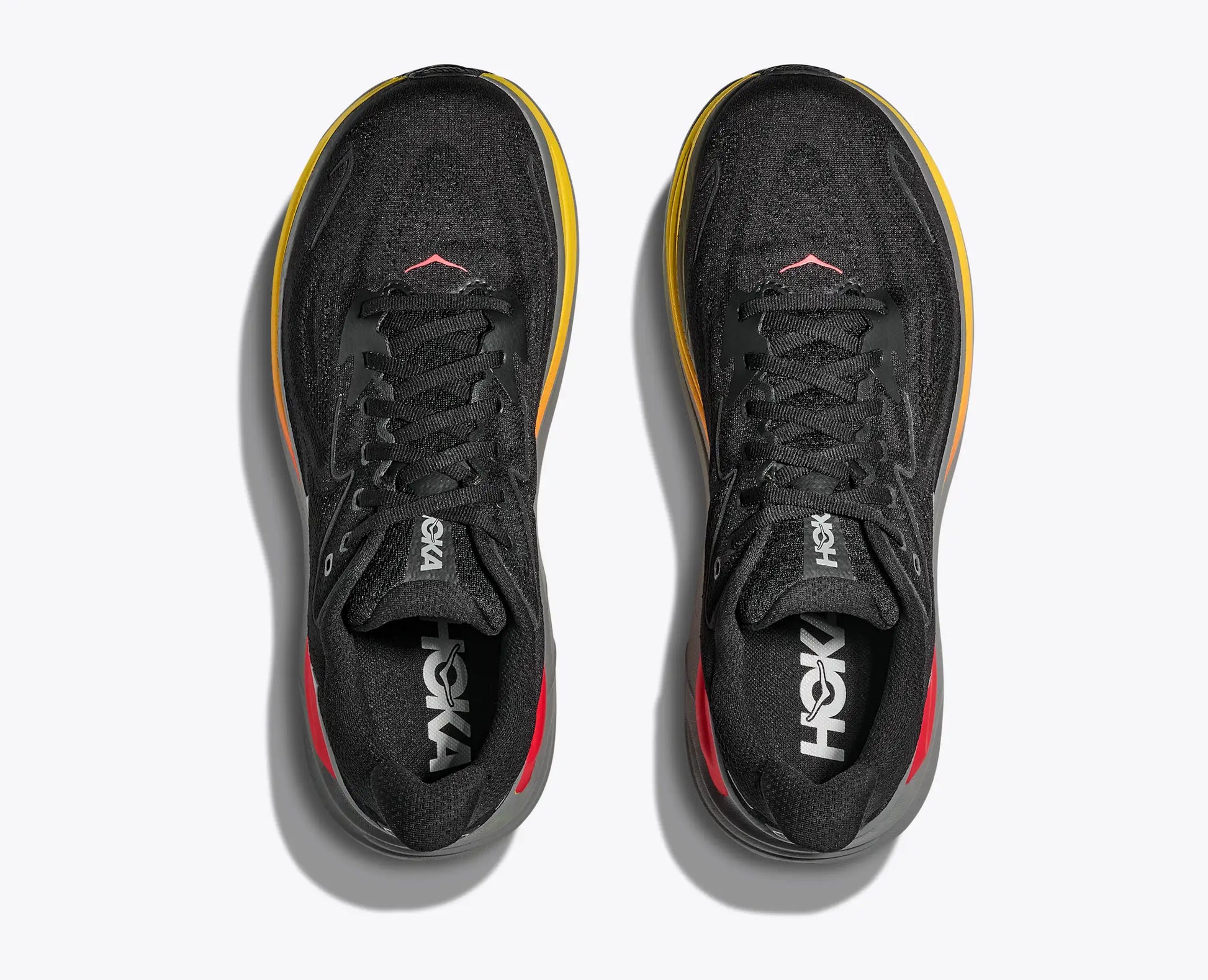 Las HOKA Clifton 10 Black/Galactic Grey combinan estilo y rendimiento en un diseño moderno y confortable. Este modelo en negro con detalles tipo llama roja y amarilla sobre la suela gris destaca por su empeine transpirable de tejido jacquard y entresuela de espuma CMEVA, ofreciendo amortiguación ultraligera y estabilidad neutra, ideal para corredores urbanos y caminatas diarias.