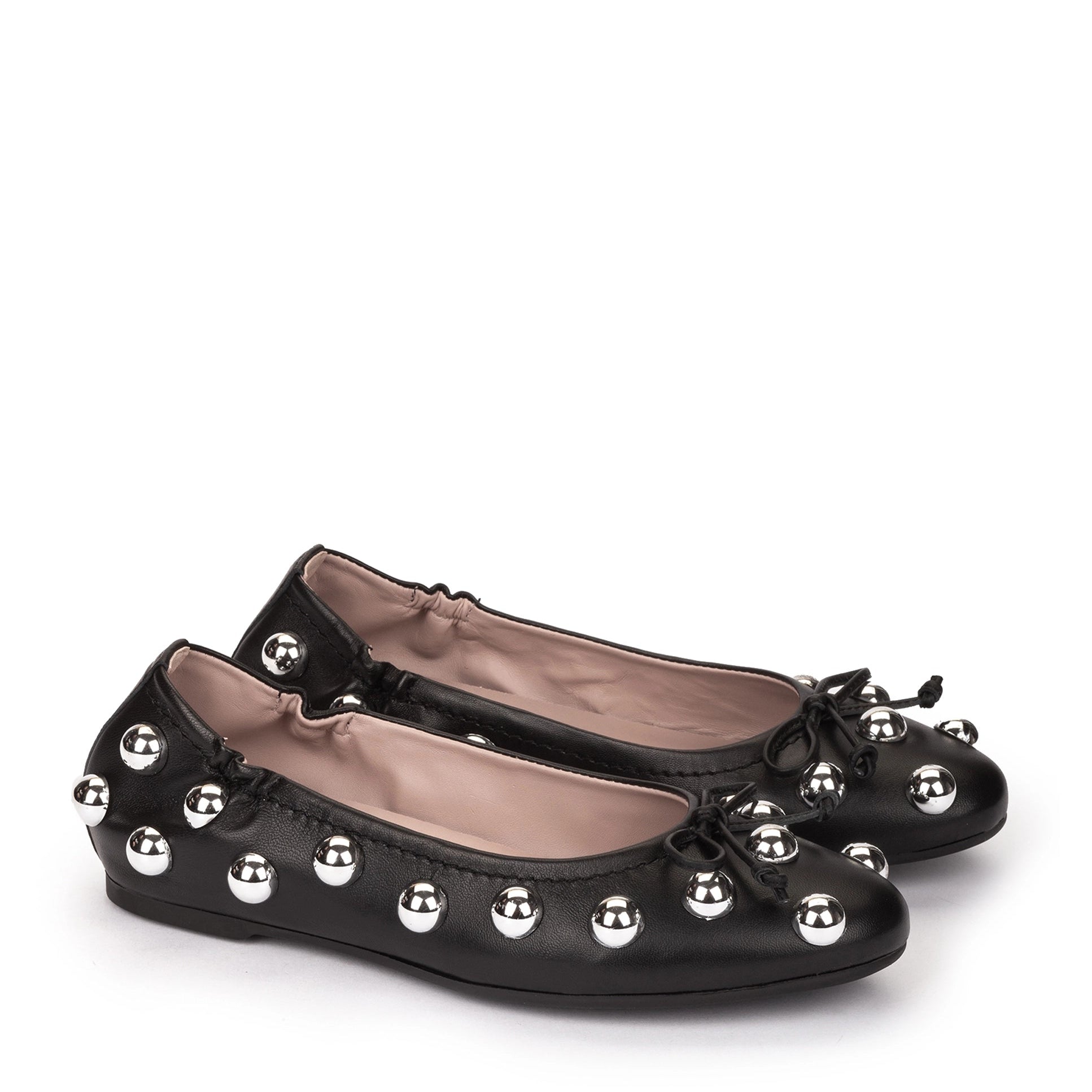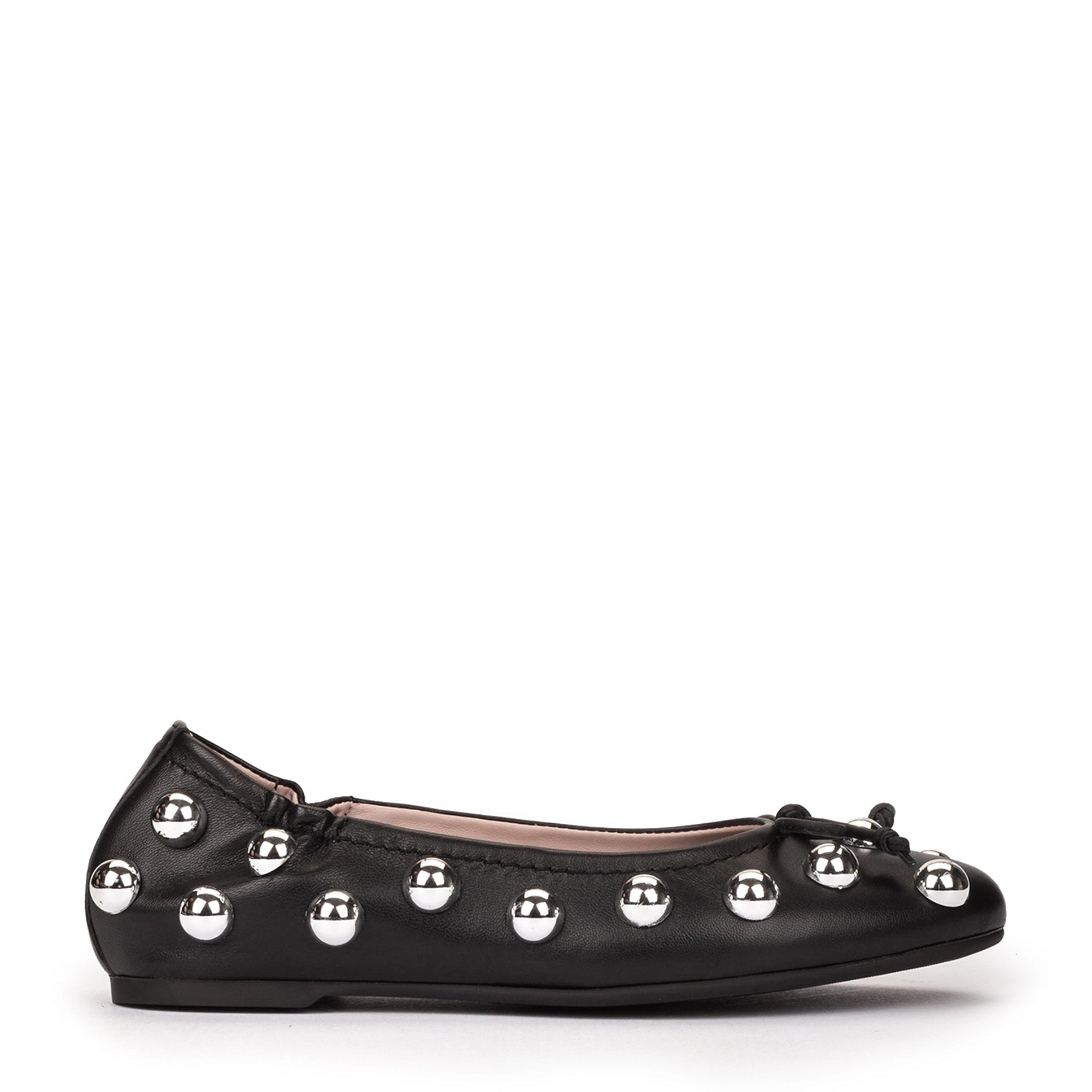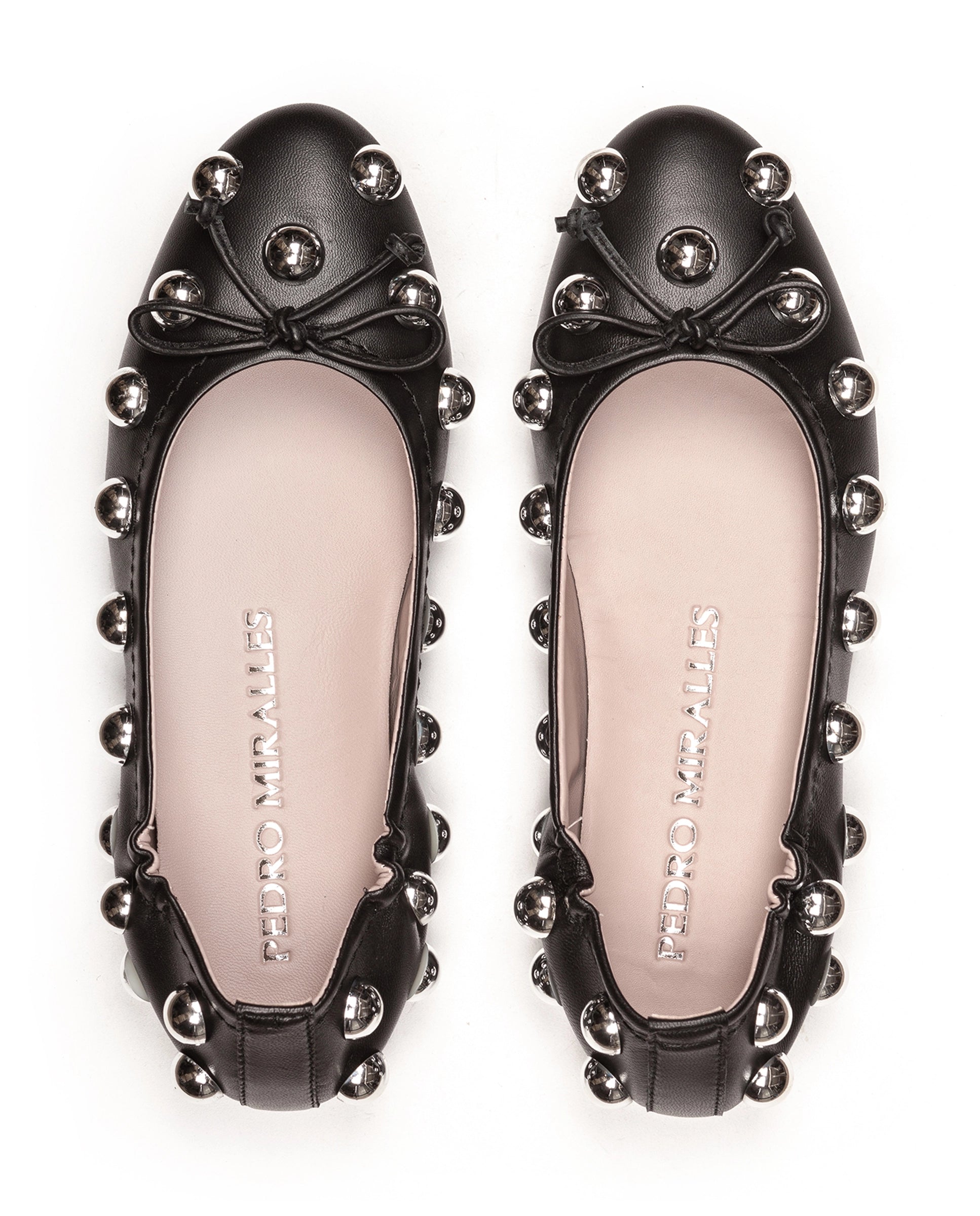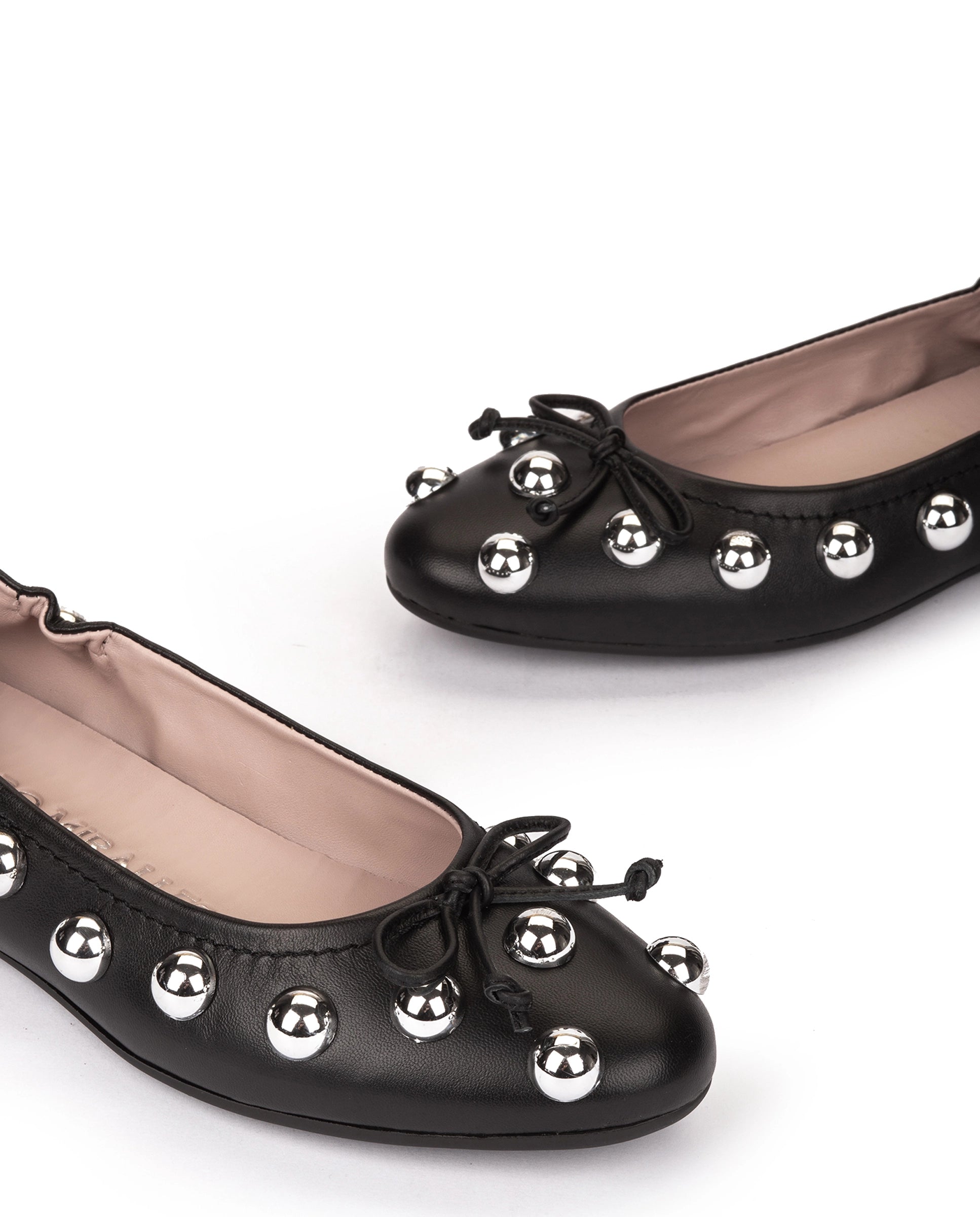 Bailarinas planas de piel en color negro. Destacan por su delicada decoración de bolas metalizadas, que añade un toque moderno y elegante. Su plantilla extraíble y acolchada las convierten en la elección ideal para lucir en el día a día.