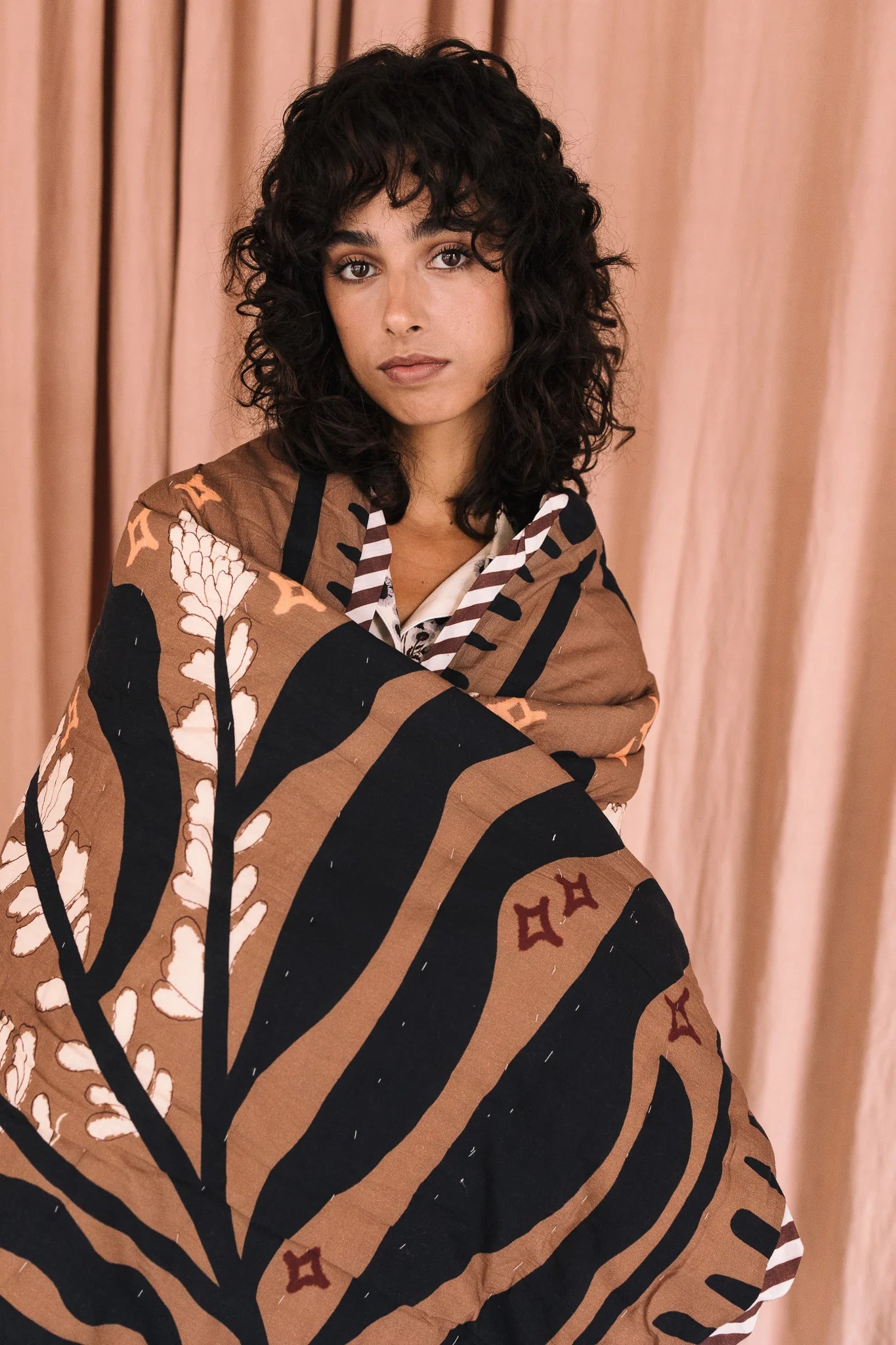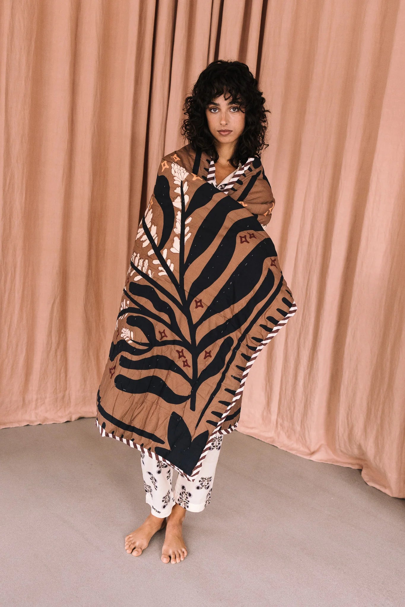 Plaid reversible 100% algodón, tejido cuidadosamente seleccionado y con estampado realizado a mano. Relleno de guata 100% algodón. Perteneciente a la Colección "Autumn-Winter 25" Talla 100x200cm