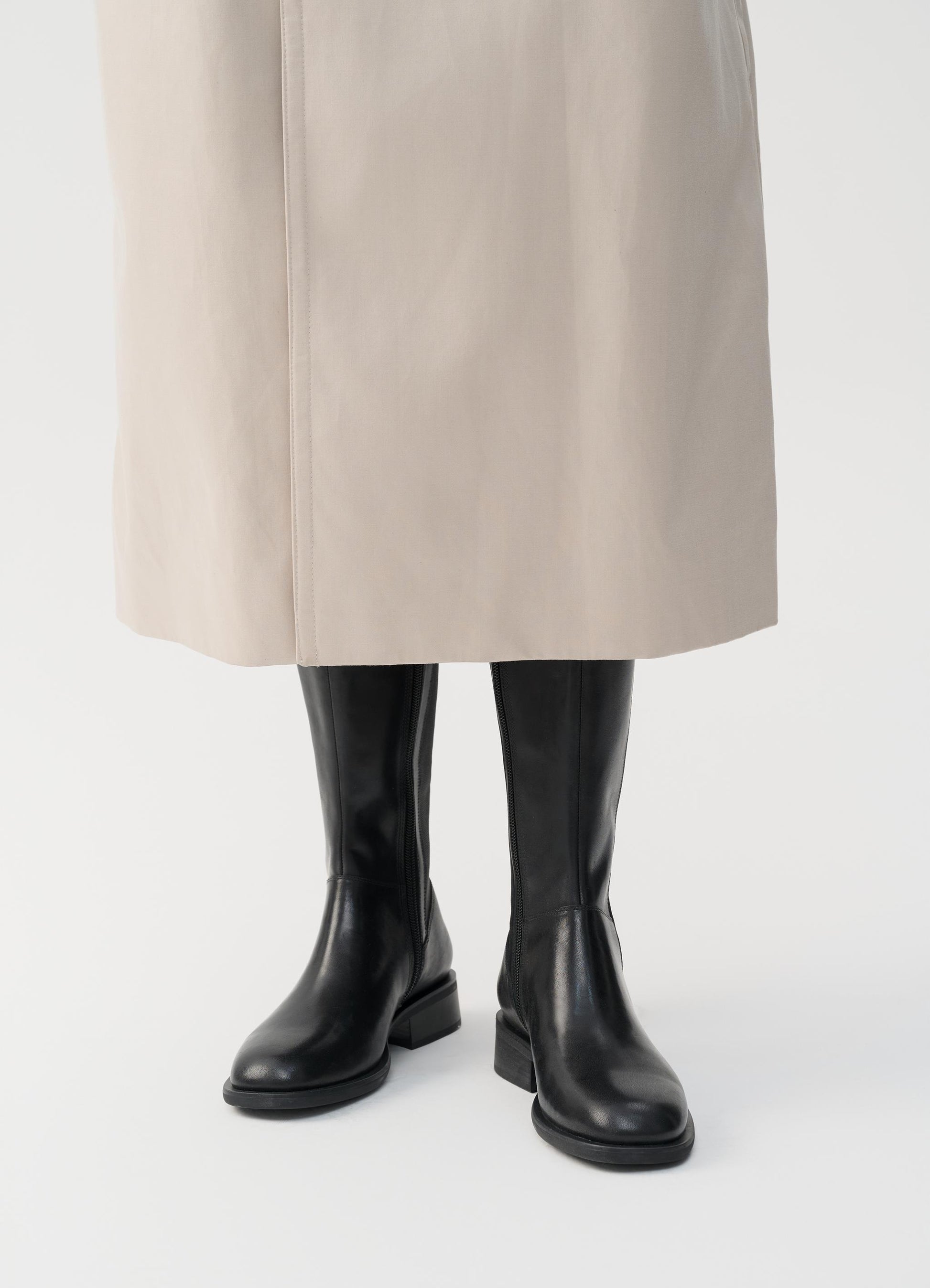 Sheila es un modelo de botas altas refinadas de estilo clásico. Confeccionadas en cuero negro de alta calidad, estas botas presentan una puntera redondeada, paneles elásticos en la parte trasera y un cierre de cremallera en el lateral para facilitar su uso. El tacón bajo de 38 mm aporta un toque de elegancia sin sacrificar la comodidad. Además, cuentan con lengüetas traseras como detalle adicional.