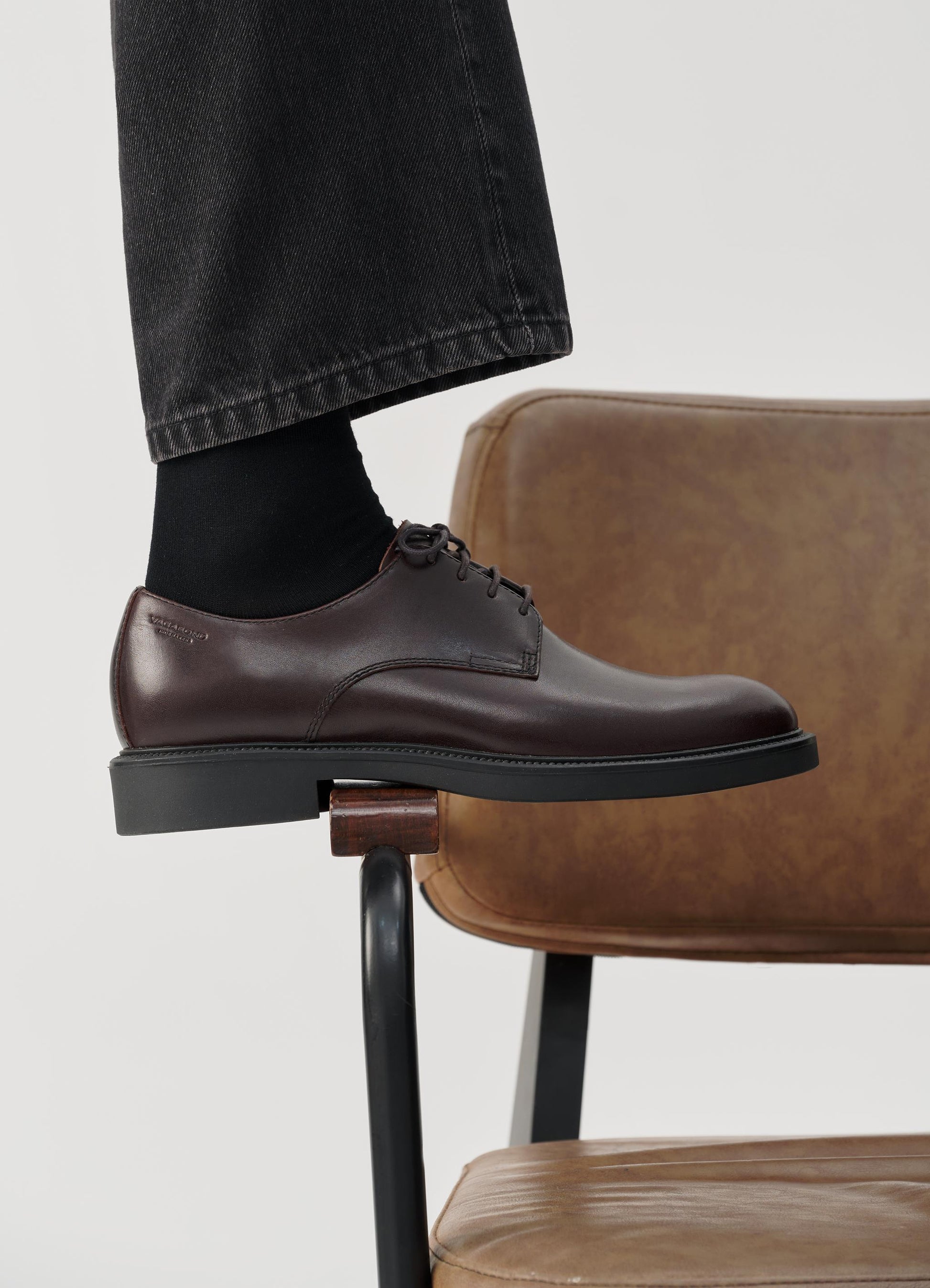 Los zapatos derby para hombre ALEX M de VAGABOND son una reinterpretación contemporánea de un clásico atemporal. Están confeccionados en cuero marrón oscuro de primera calidad, con puntera almendrada y cierre de cordones, lo que los convierte en una opción versátil tanto para ocasiones formales como para looks más casual. Su tacón robusto de 33 mm añade carácter y comodidad.