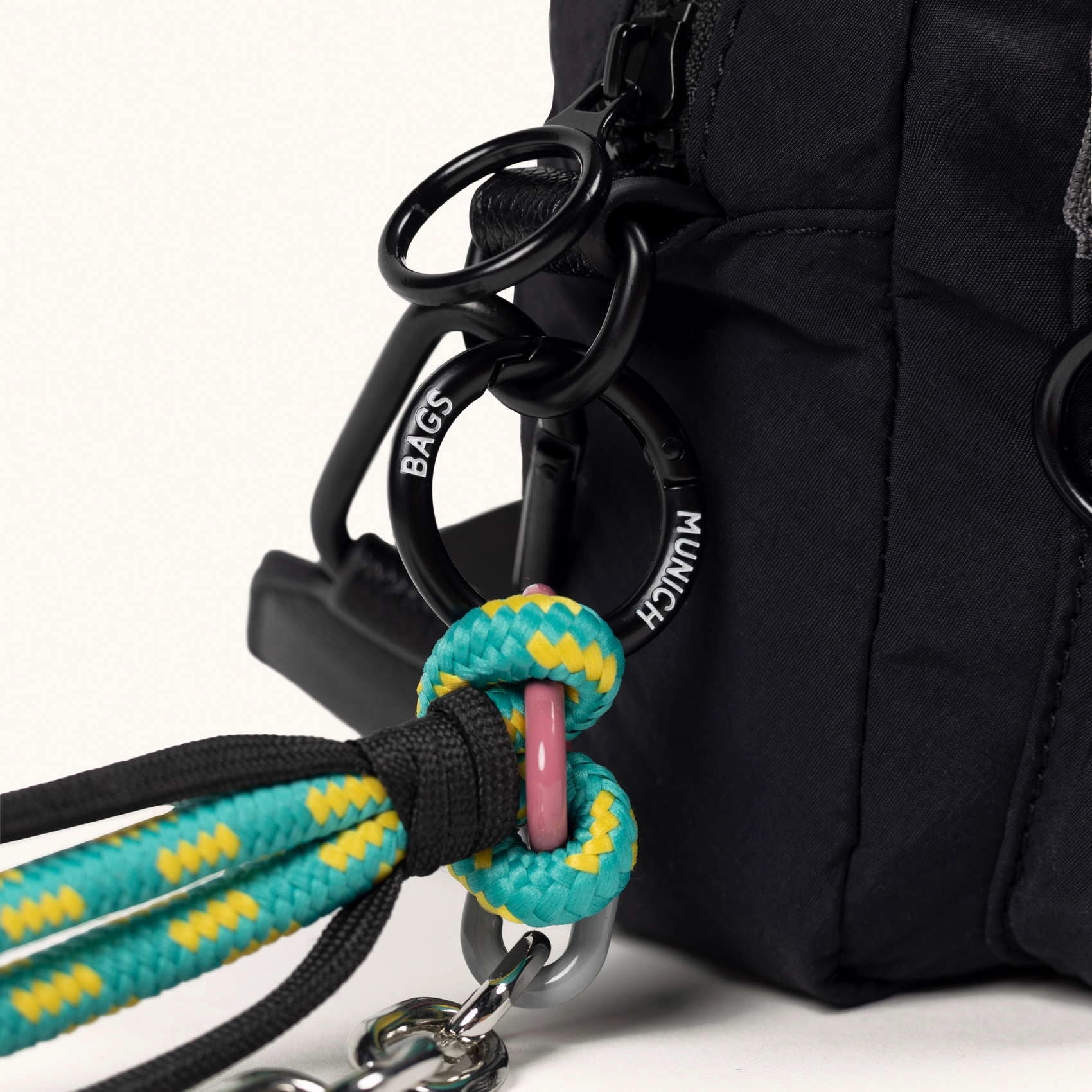 Bolso bandolera fabricado con en poliamida reciclada. Compartimento principal y bolsillo frontal con cremallera. Llavero extraible fabricado con cuerdas y cadenas. Trasera con bolsillo con cremallera. Asa de de algodón regulables y extraibles.