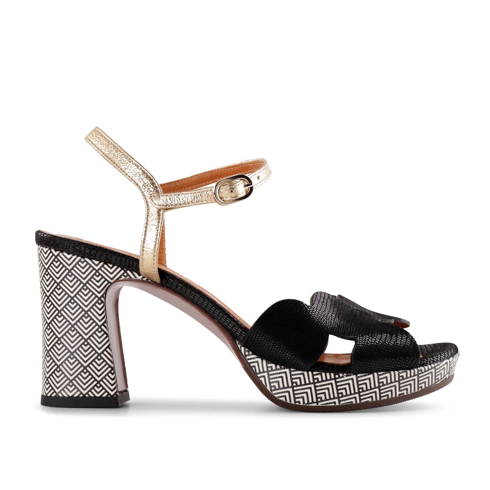 Zapato de piel en combinación de negro y platino, con detalles elegantes en espiga. Perfecto para realzar un look sofisticado y moderno, ideal para eventos formales o estilismos exclusivos.