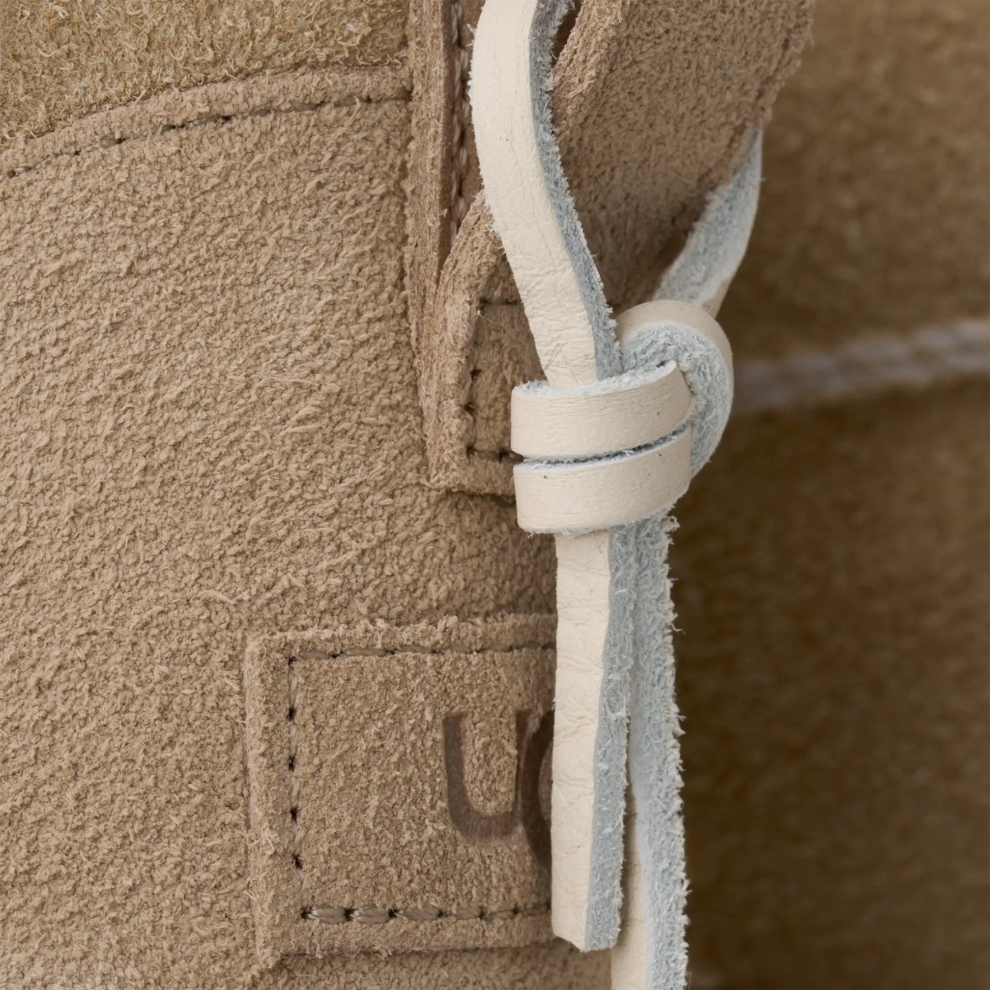 • Costuras decorativas, borla de piel, tirador trasero y bandeleta de ante