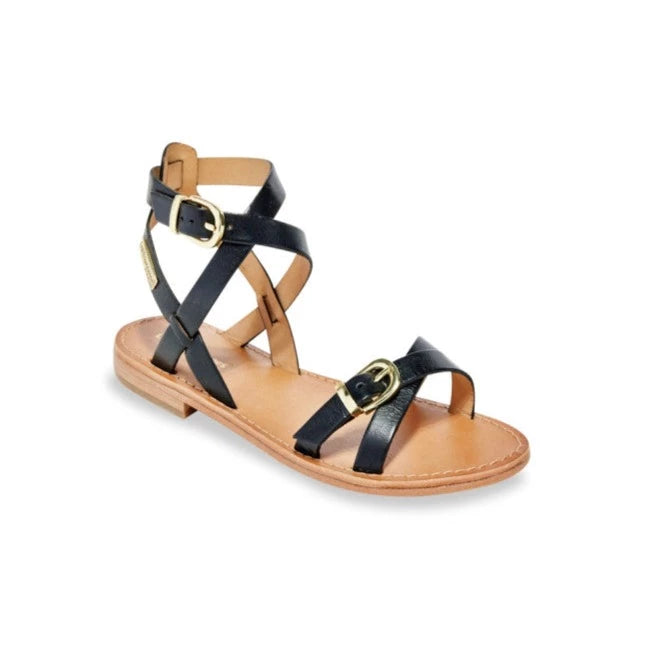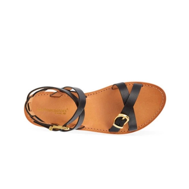 ¡Descubre nuestras elegantes sandalias tipo griegas planas, elaboradas con fina piel vacuna en tonalidad negra y diseñadas para atarse al tobillo!