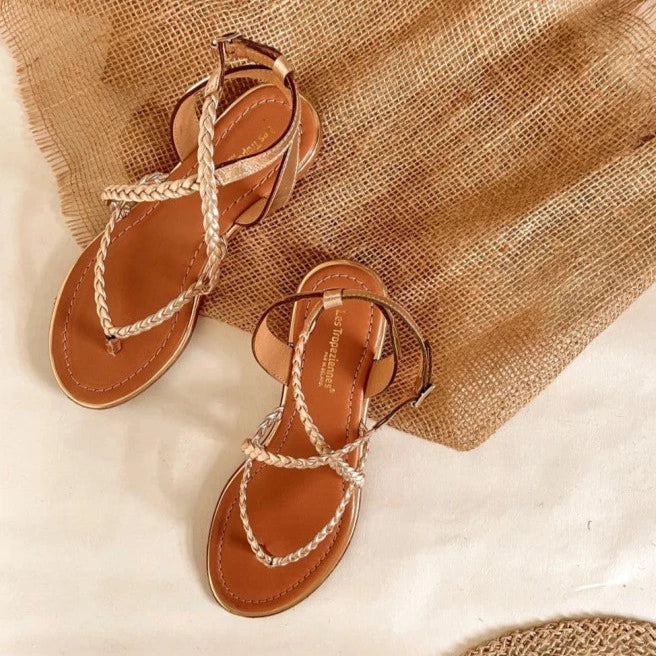 ¡Descubre nuestras espectaculares sandalias planas estilo griego en tonalidad dorada, elaboradas con exquisitas trenzas de piel!