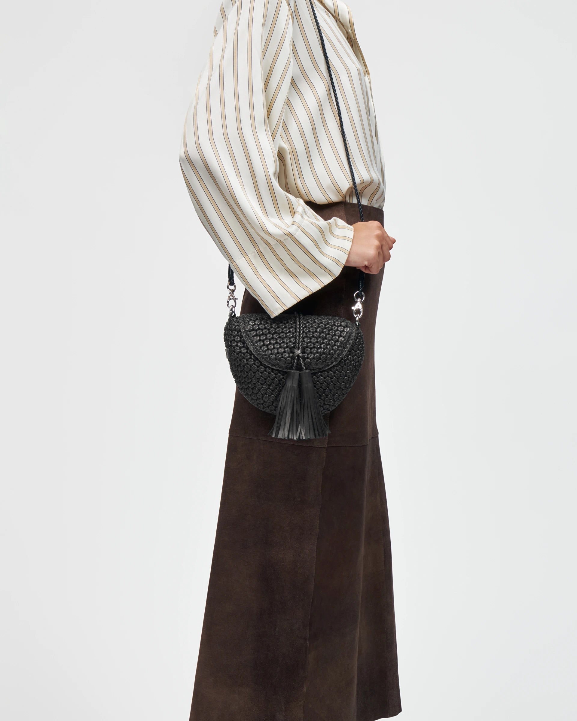 Los bolsos de esta colección Lottusse Noodbag están confeccionados con las técnicas de trenzado de piel distintivas de nuestra marca, en las que se trenzan tiras de piel a mano para crear un complejo diseño con forma de flor. Este modelo en concreto se ha confeccionado en piel de cordero merino soft en un negro clásico. Además, puede llevarse cruzado para mayor seguridad.