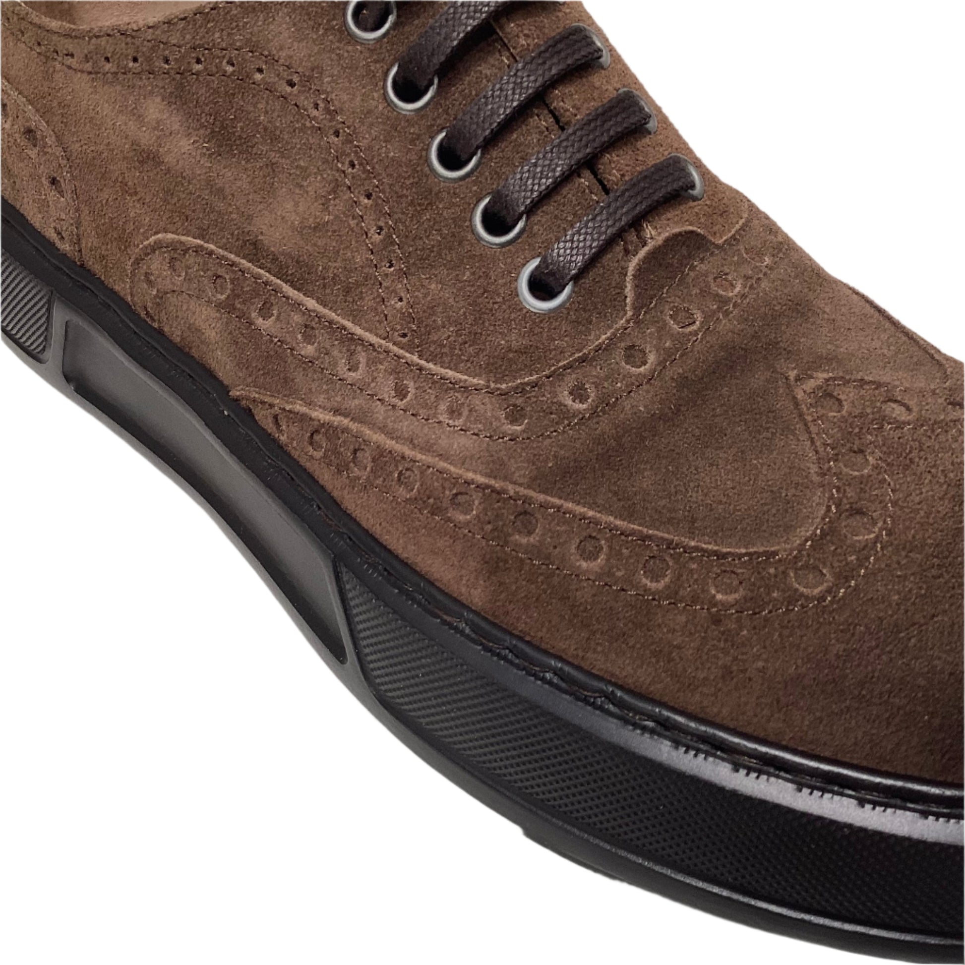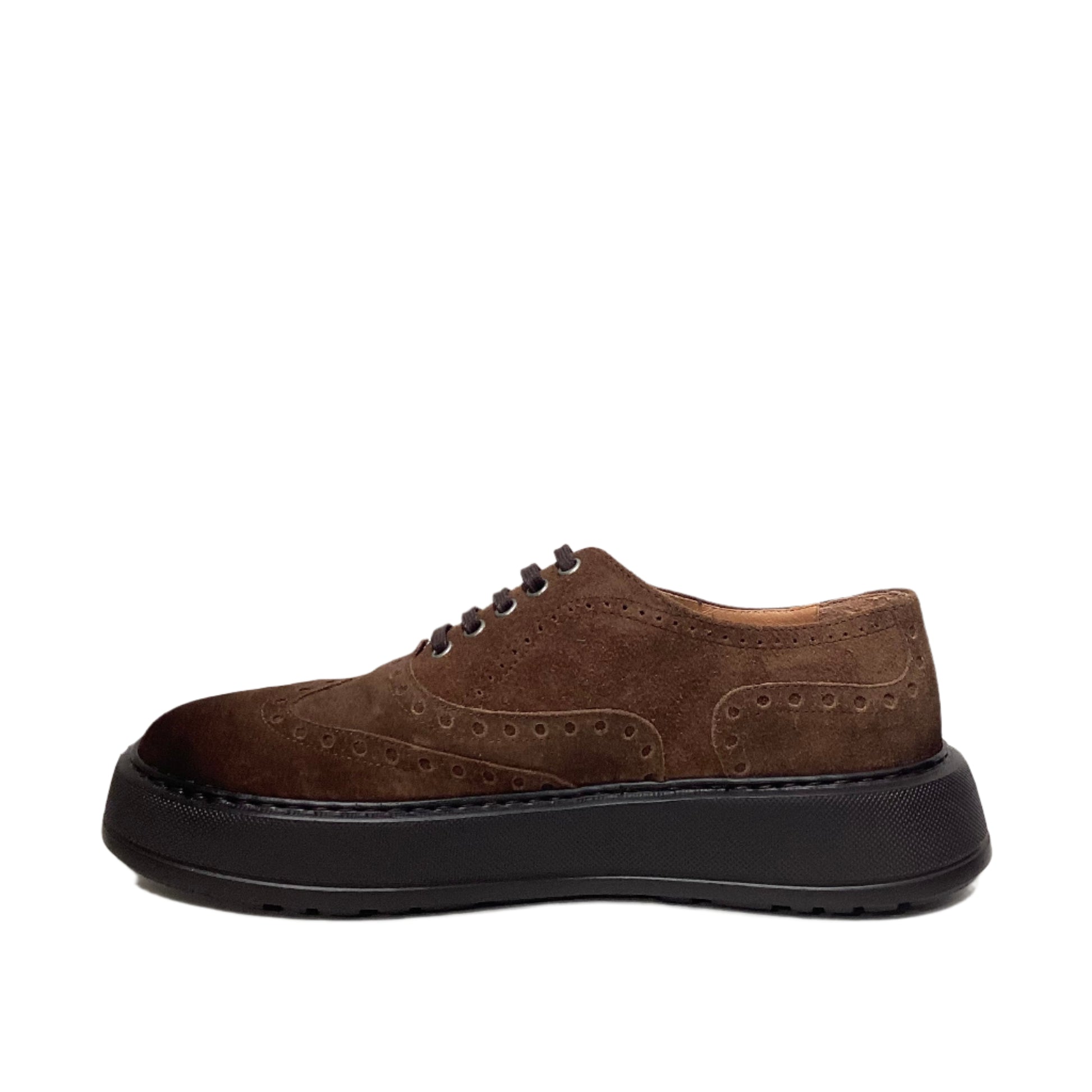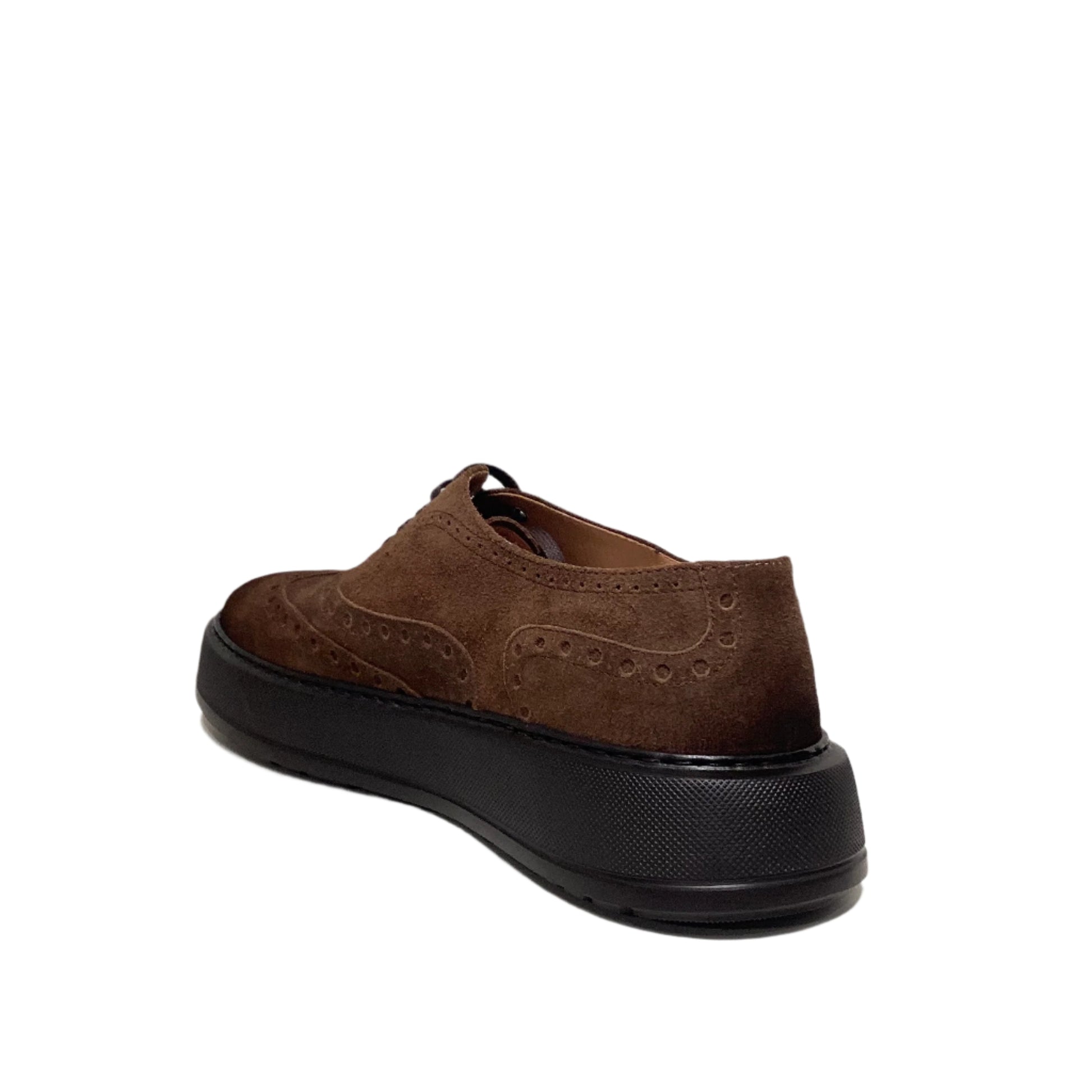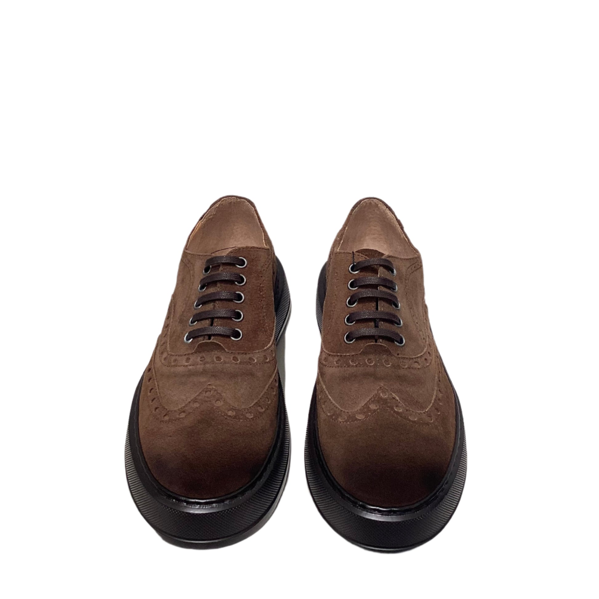 Este zapato es un modelo tipo derby casual con detalles brogue, fabricado en serraje marrón oscuro. Presenta perforaciones decorativas (wingtip) que aportan un toque elegante, mientras que su suela gruesa y negra de estilo chunky le da un aire moderno y urbano.