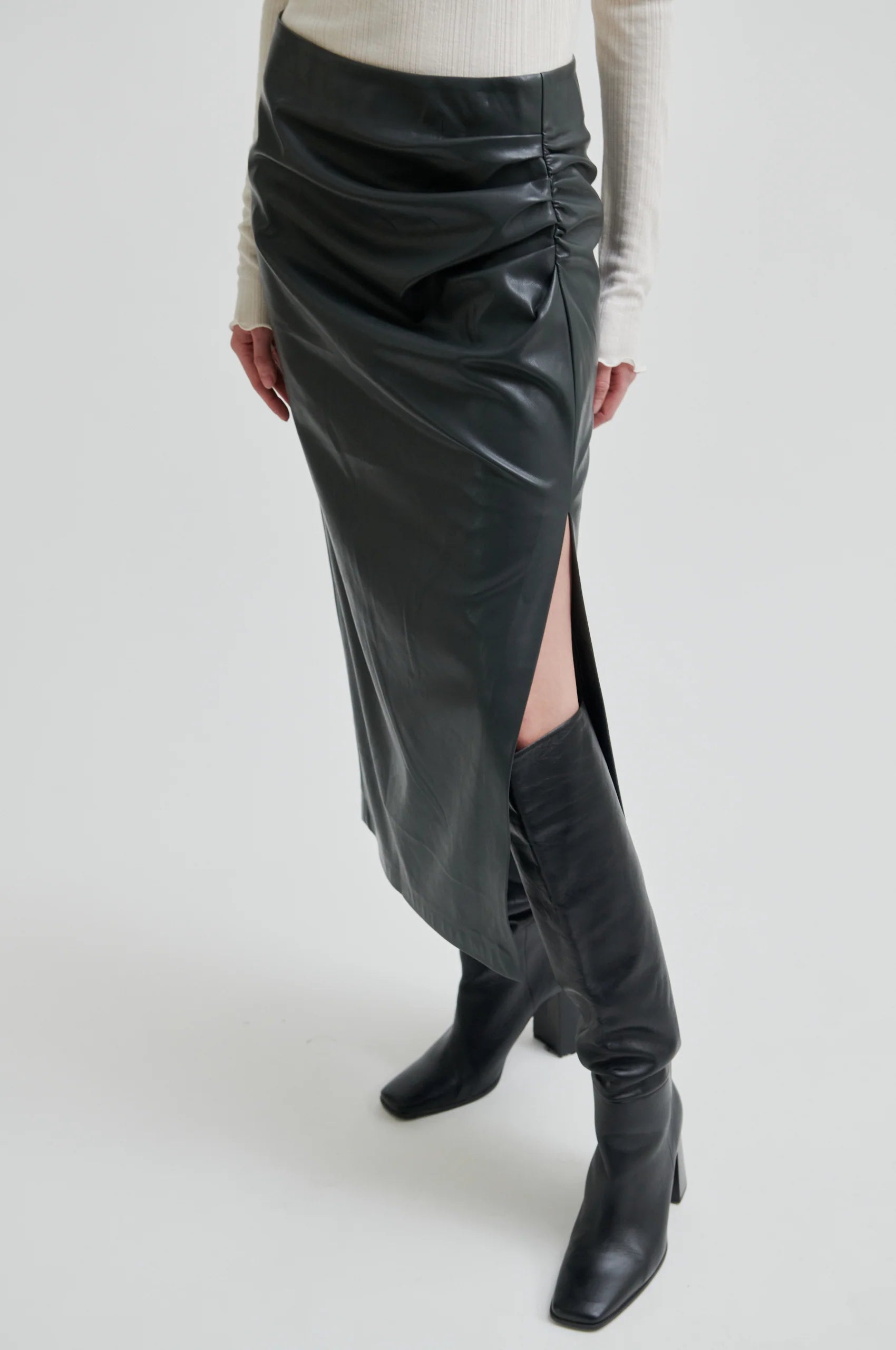Falda de piel sintética Second Female. Confeccionada en piel sintética lisa. Cierre con cremallera lateral oculta. Costura fruncida en la espalda que crea un ajuste favorecedor. Abertura profunda en la espalda. Corte recto y entallado.CARACTERÍSTICAS DEL PRODUCTO