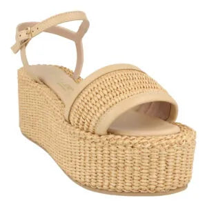 Sandale en raphia et cuir mélangés, avec semelle en caoutchouc et plateforme en raphia.