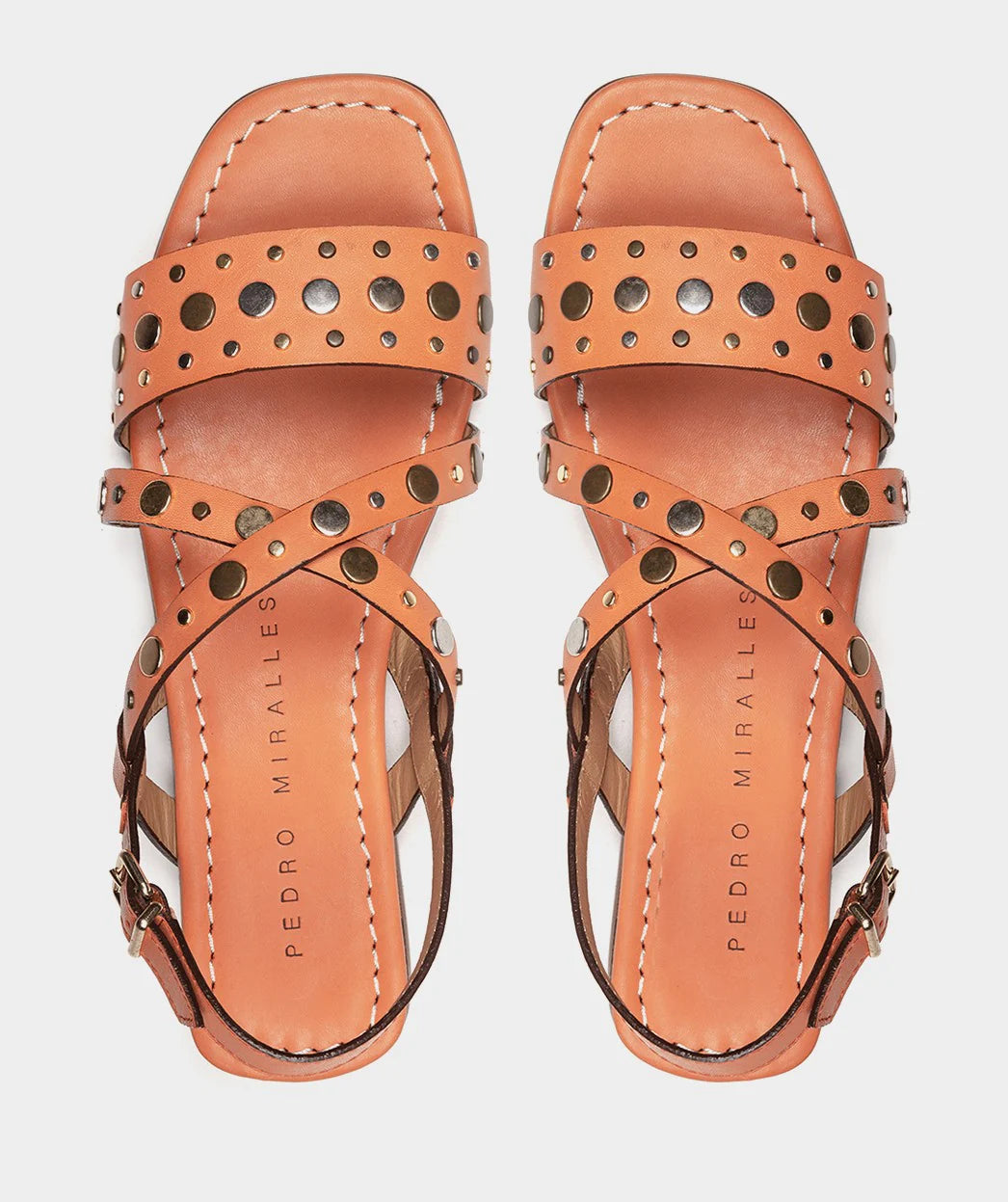 Sandali bassi in pelle arancione. Questo modello è stato realizzato con borchie rotonde di diverse dimensioni che conferiscono un tocco unico e glamour. Sii favolosa questa stagione con i sandali Alcudia!