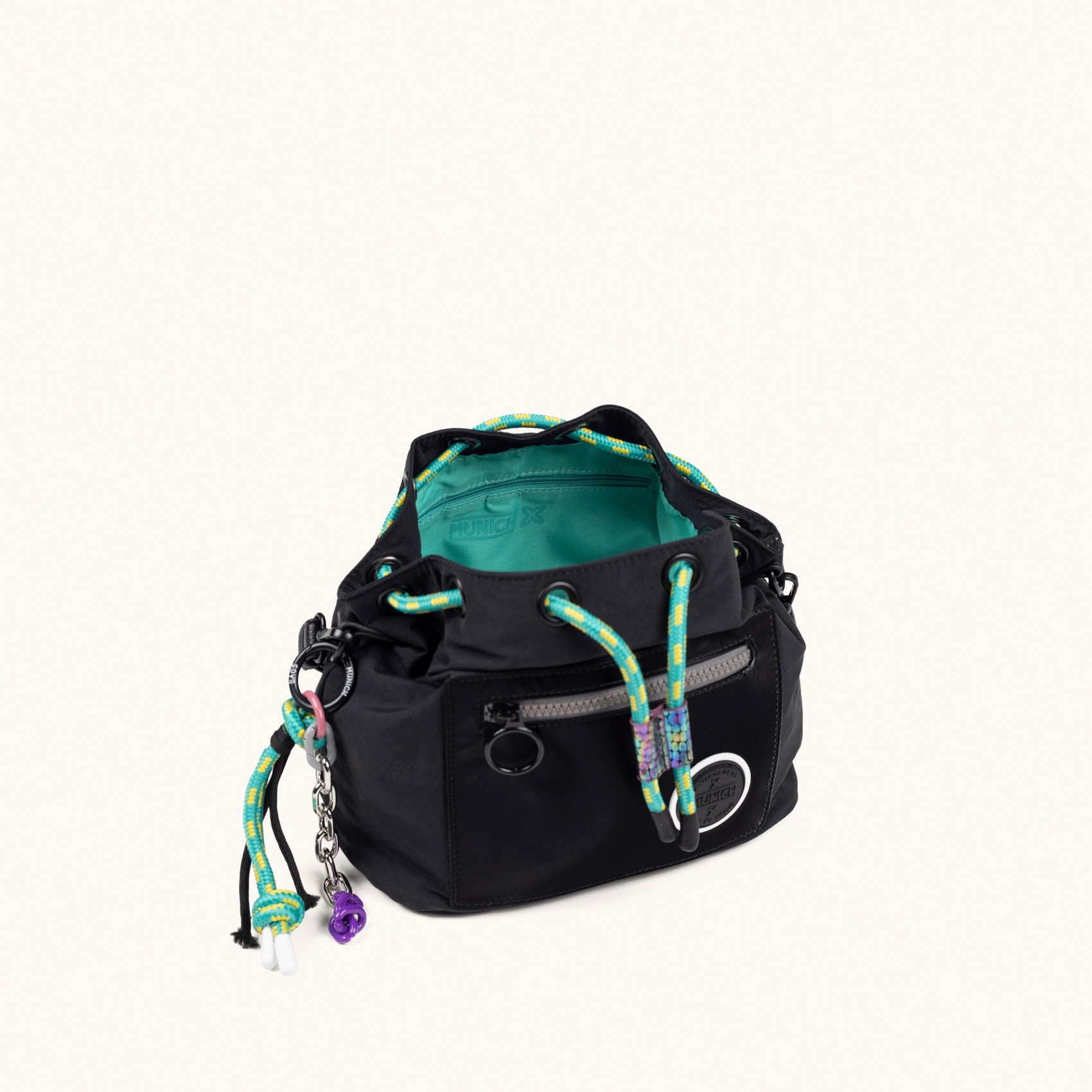 Bolso bucket fabricado en poliamida reciclada. Compartimento principal con cierre por ceñidor. Bolsillo frontal con cremallera. Llavero extraible fabricado con cuerdas y cadenas. Interior con bolsillo con cremallera. Asa de mano de y asa bandolera extraíbles y regulables.