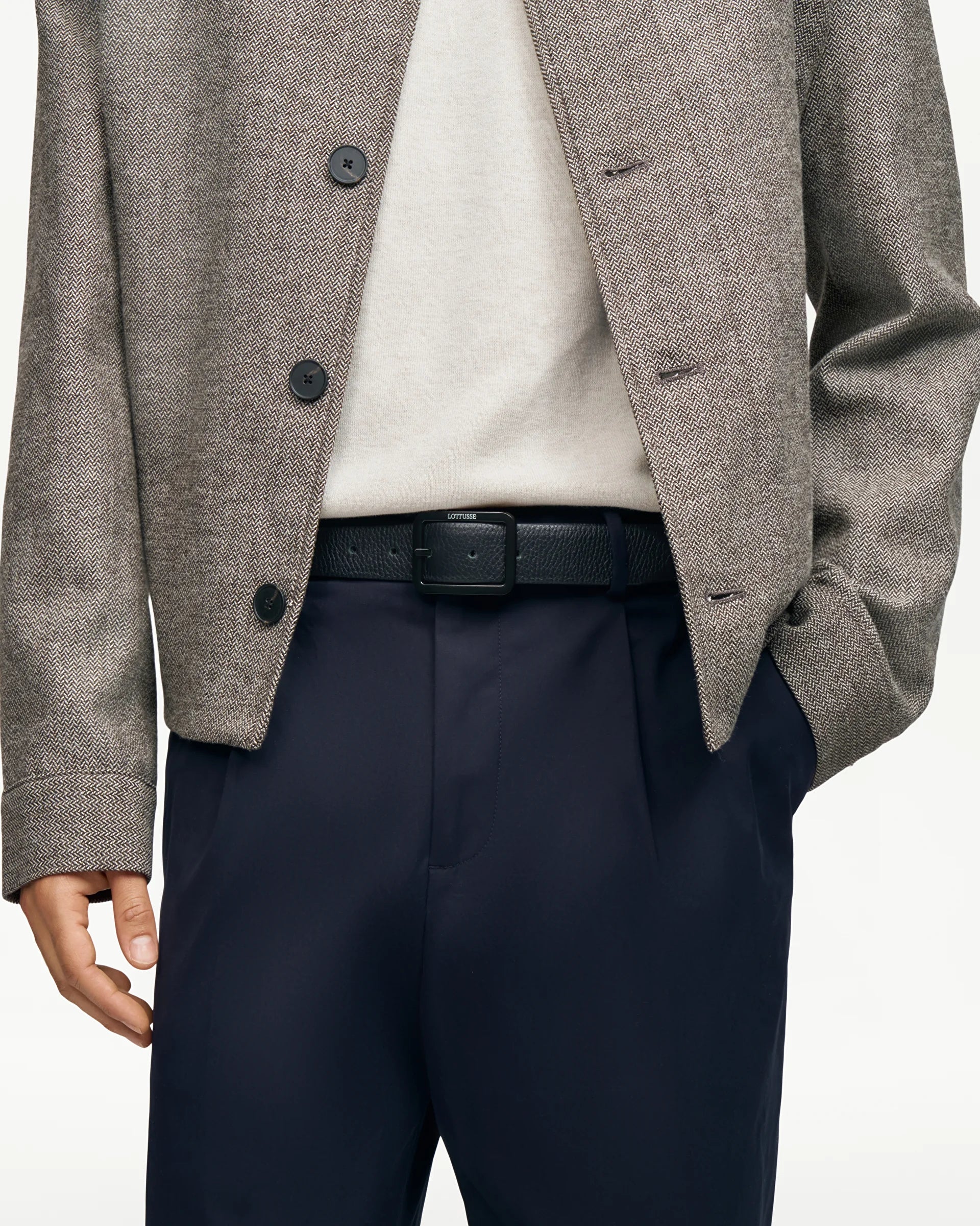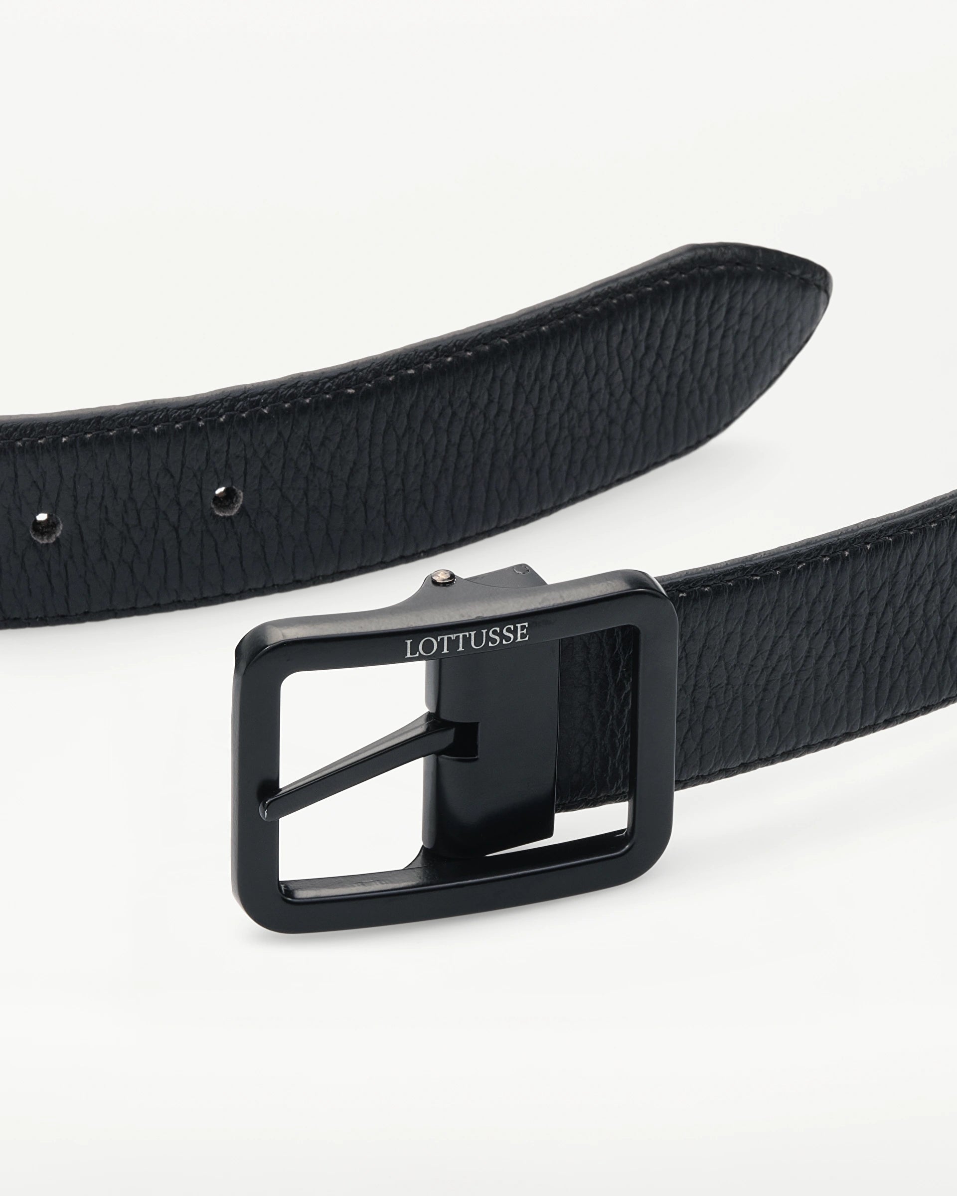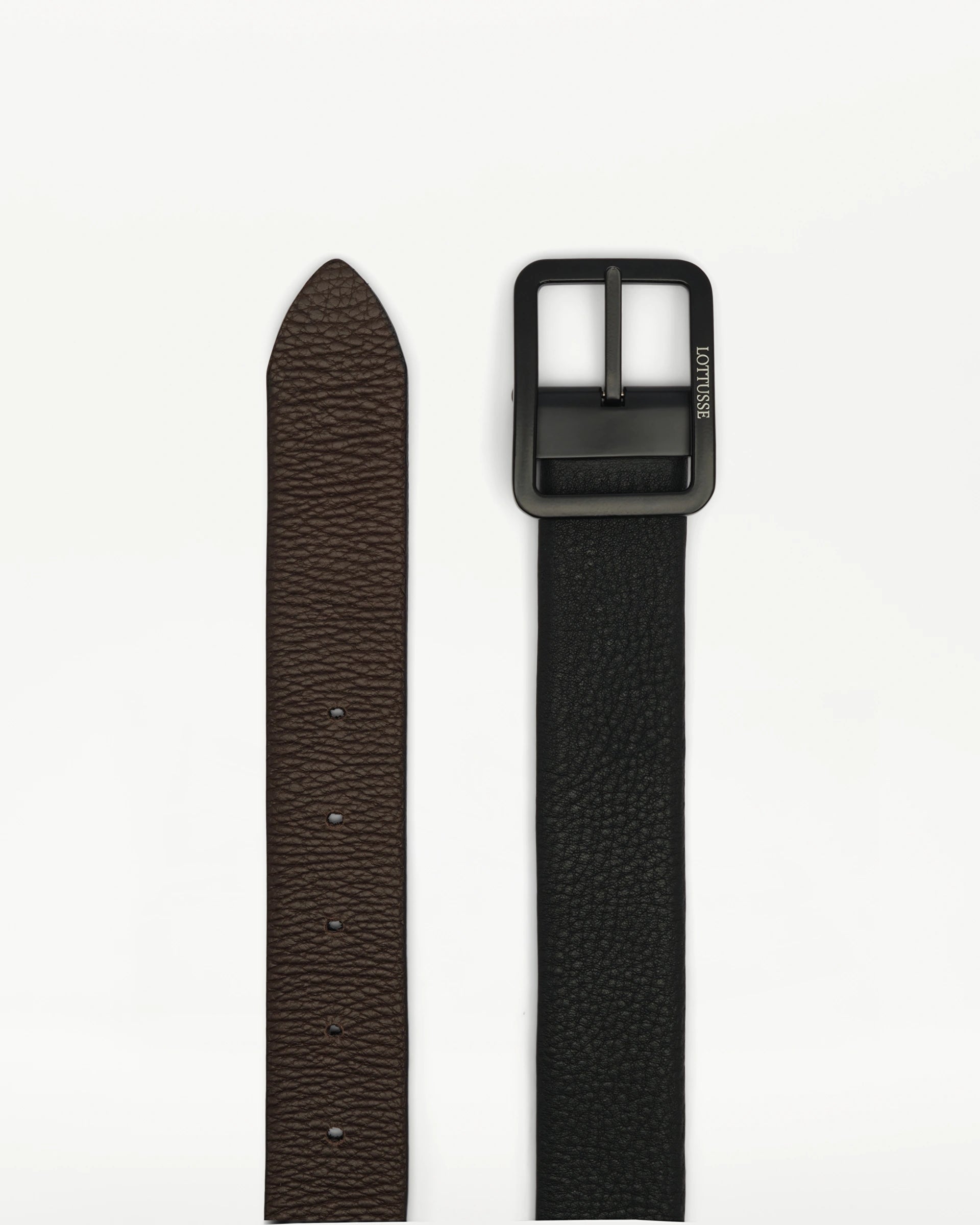 Descripción del producto: Sofisticado y versátil, este cinturón para hombre ofrece infinitas posibilidades de uso. Está hecho a mano con piel de becerro granulada con una textura y una pátina parecidas a las del alce. Para aumentar las opciones de estilo, el cinturón es reversible, con dos lados, uno negro y otro azul marino. Está acabado con una hebilla de metal en el mismo tono, con la marca Lottusse sutilmente grabada.