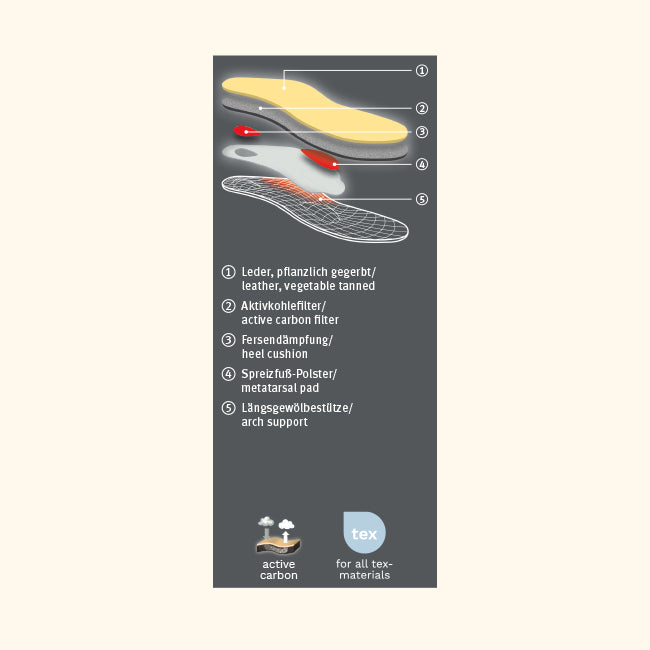 pedag Viva® を一度履いたら、もう手放せなくなる必需品です。植物タンニンなめしの本牛革を使用した薄型サポートは、履いていることをほとんど感じさせず、ファッショナブルな靴を履いた時でも、足を心地よく包み込みます。活性炭配合で、長い一日の終わりでもリラックスして靴を脱げます。