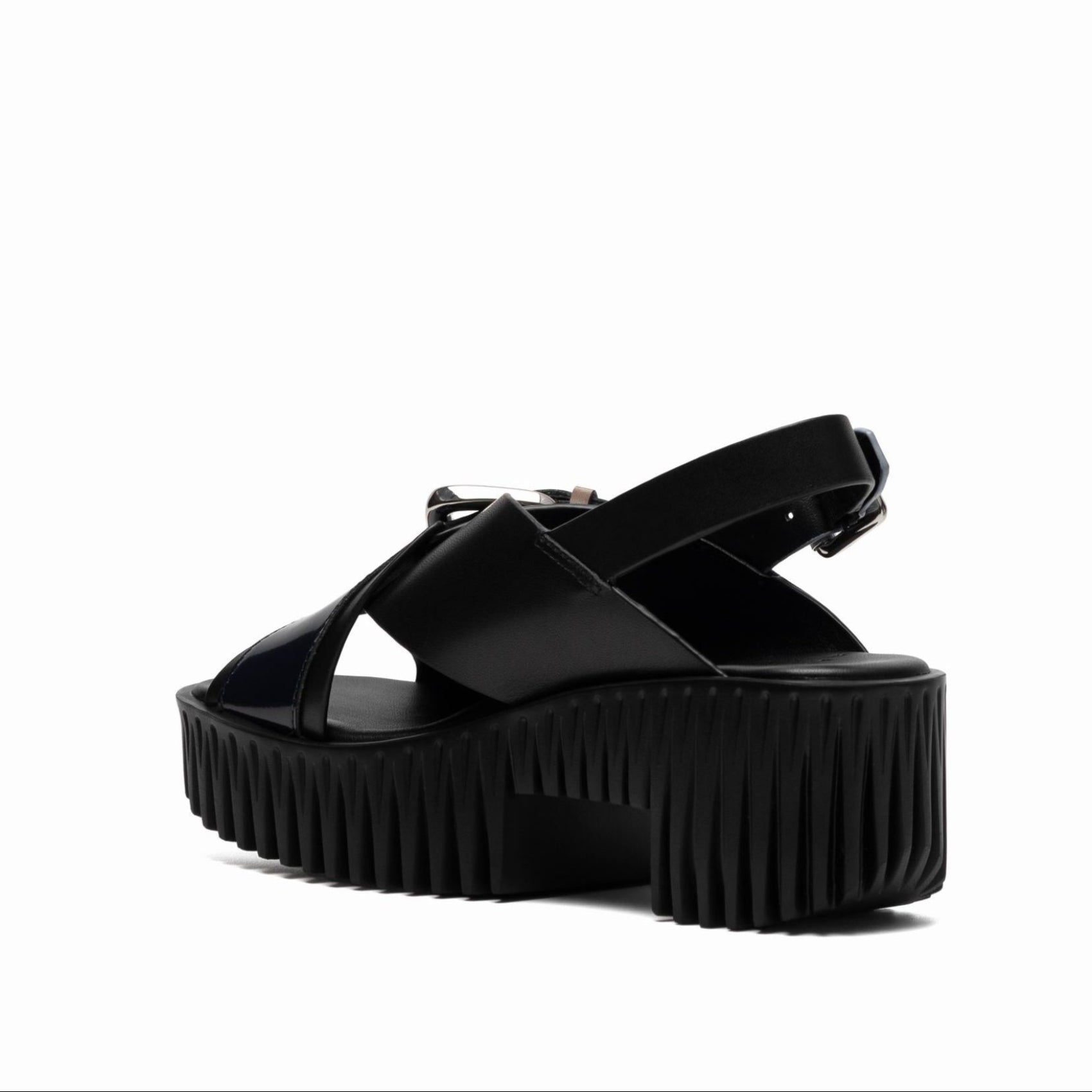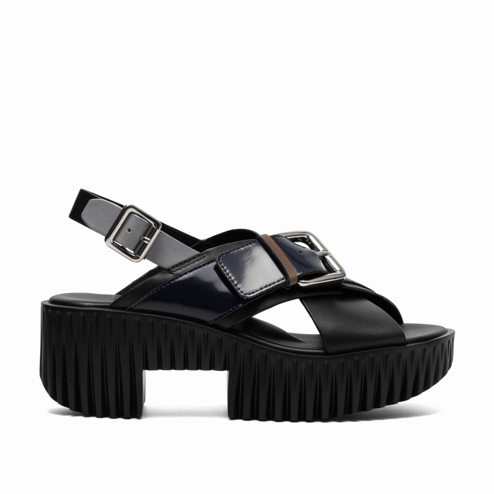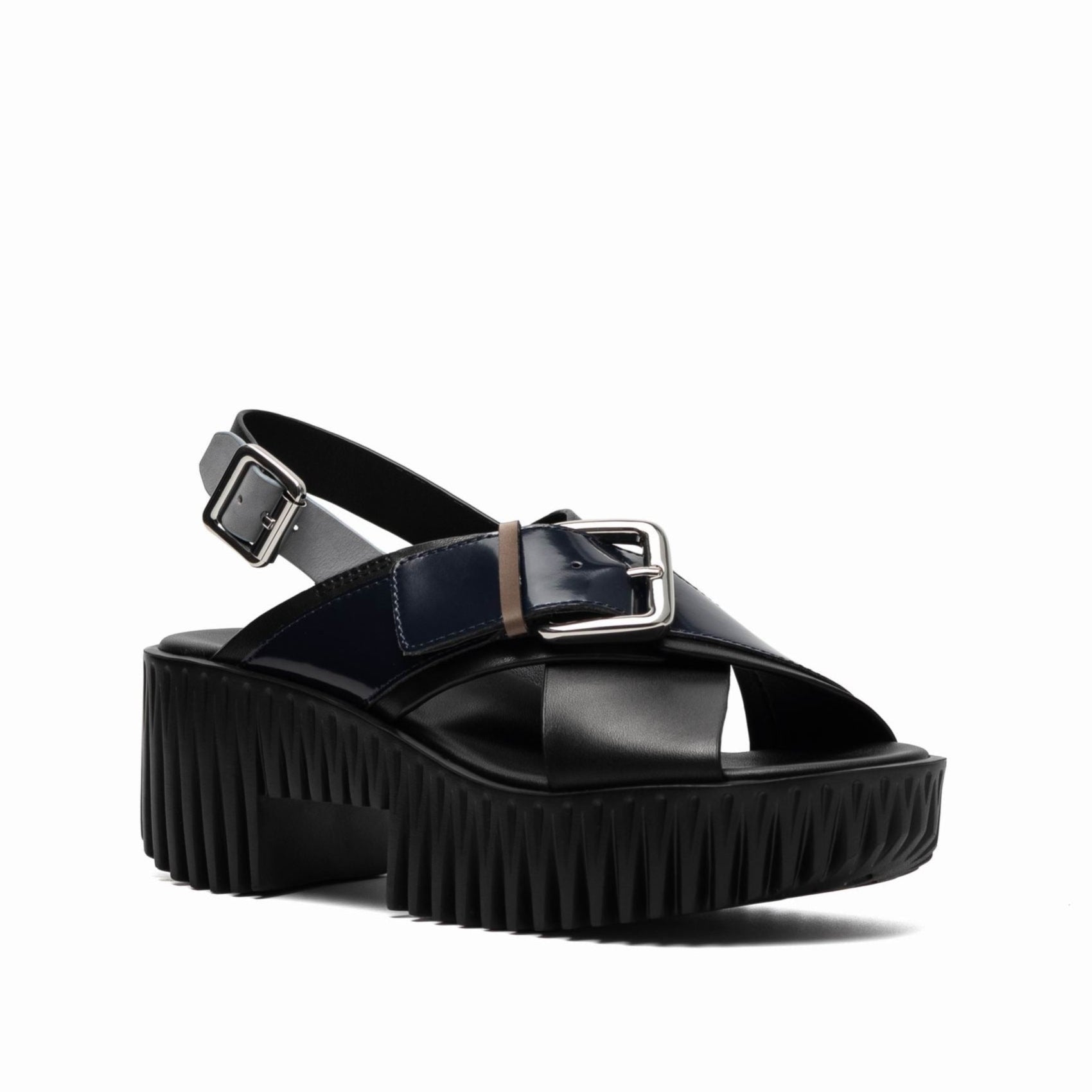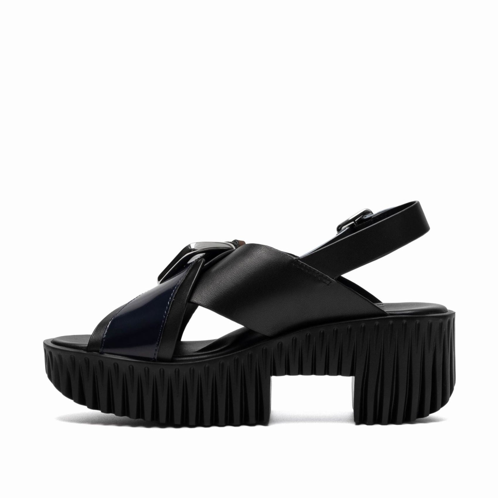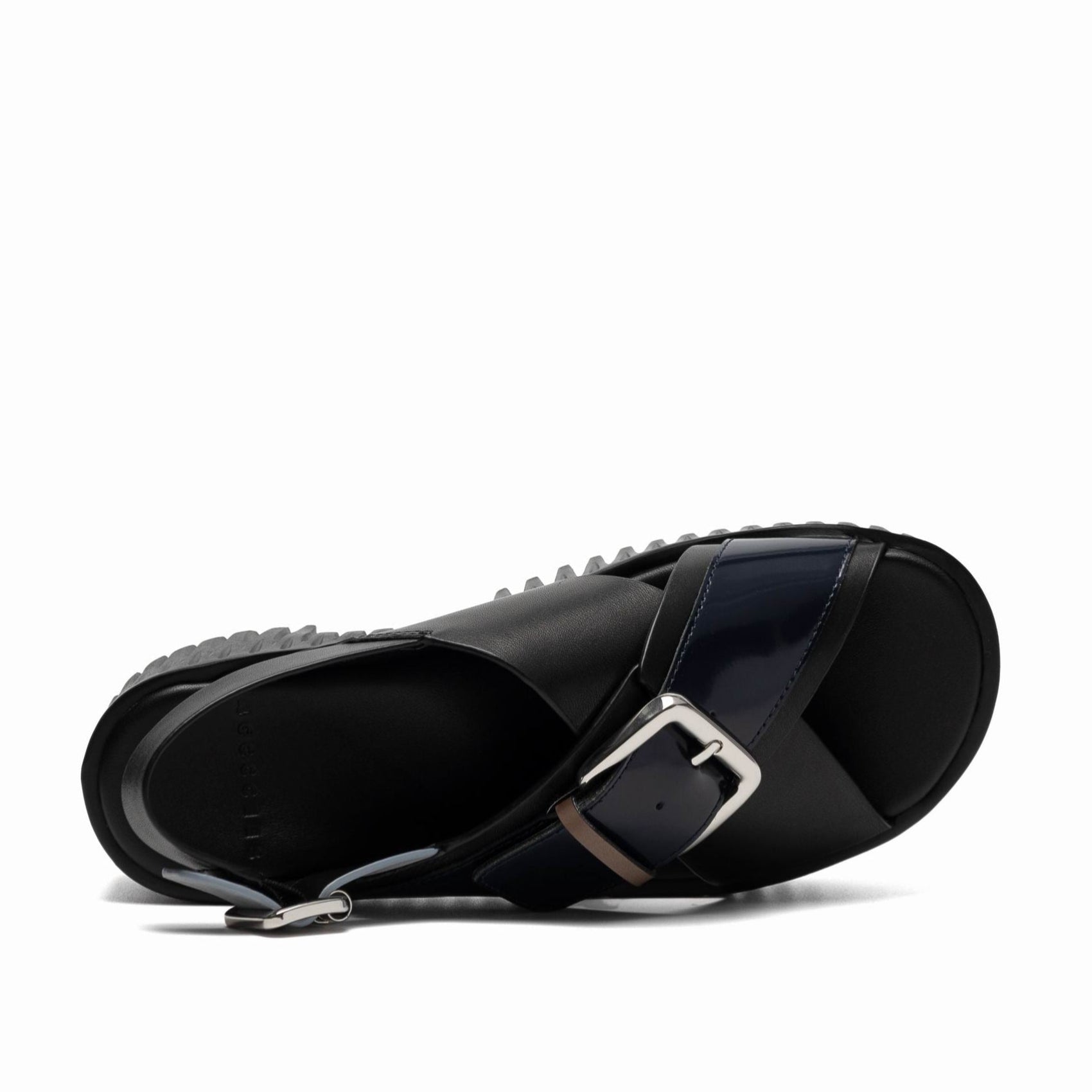 幅広ストラップのクリスクロスサンダルは、控えめなシルエットに遊び心のあるディテールが魅力です。鮮やかなカラーと大胆なメタルバックルの組み合わせにより、ドレスアップにもカジュアルにも合わせやすい一足です。