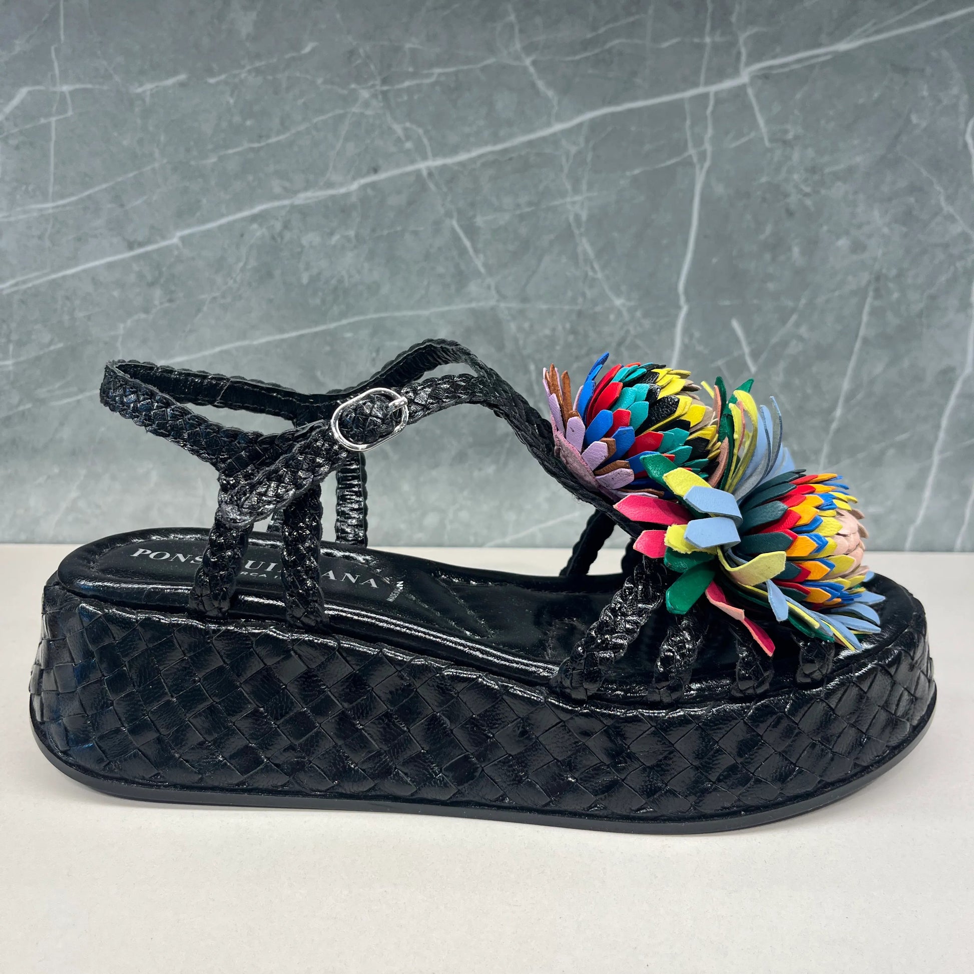 マウイ プラットフォームサンダルは、靴の形をした芸術作品です。鮮やかなルビー色のレザーを手編みで仕上げ、エレガンスとフレッシュさを融合させたこのサンダルは、ハンドメイドで仕上げたマルチカラーのレザーフラワー装飾が、個性的で洗練された雰囲気を添えています。