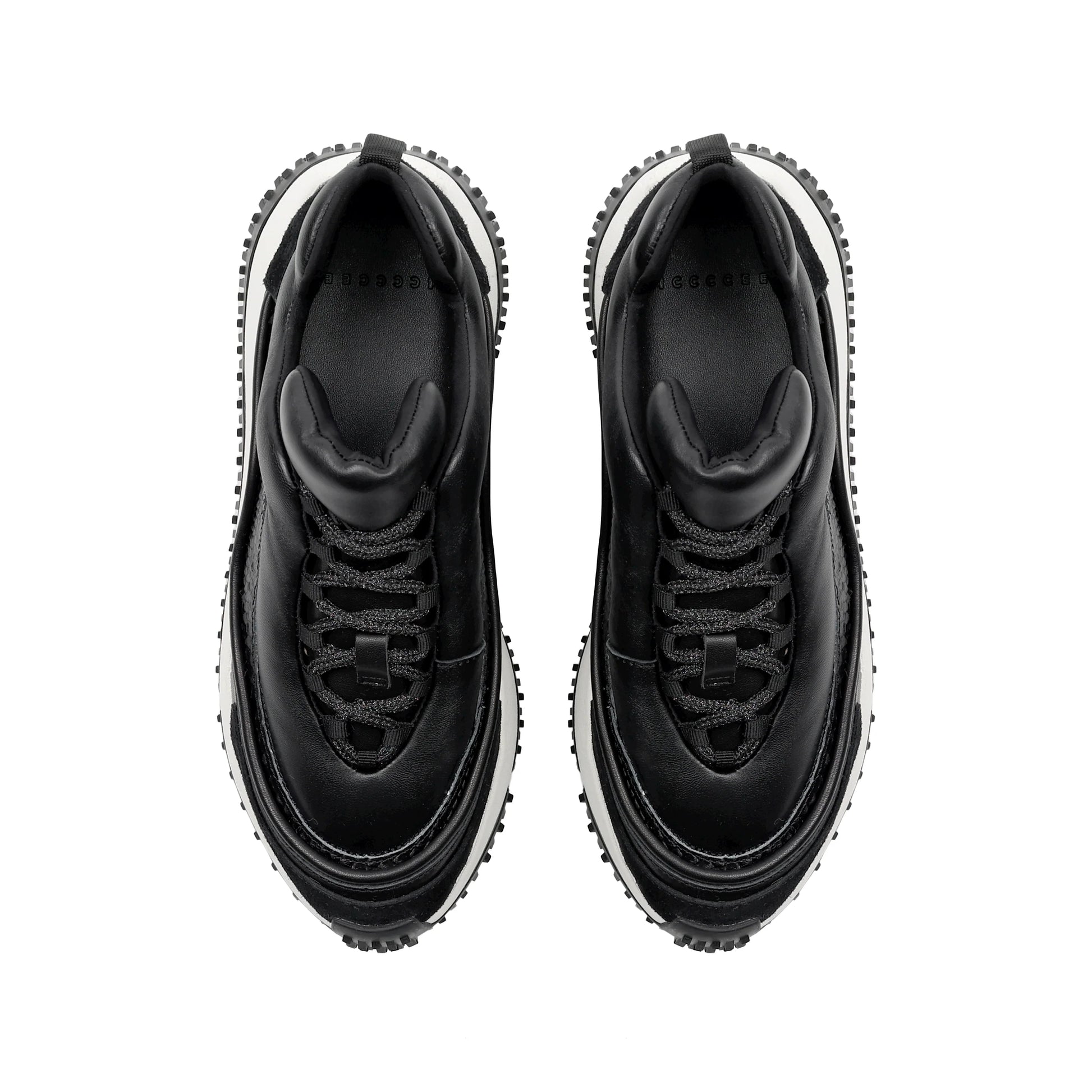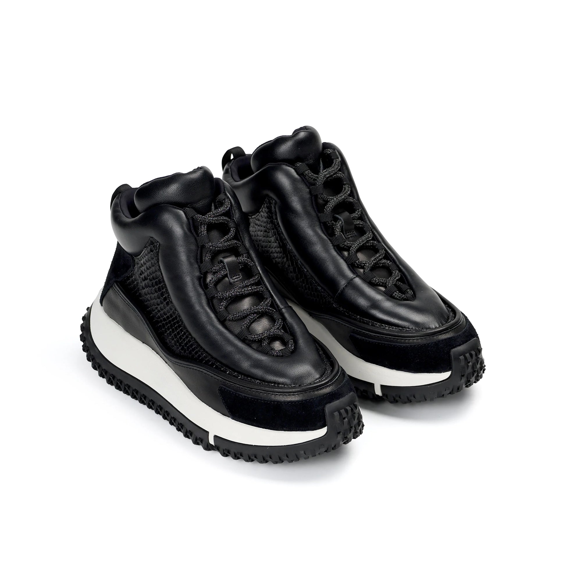 Los botines Kapok Goni Oreo de 4CCCCEES exploran formas inspiradas en la naturaleza, con una silueta que evoca los movimientos de expansión y contracción de los elementos orgánicos. Su diseño combina piel de oveja, ante y estampado de serpiente, creando un equilibrio entre texturas suaves y materiales resistentes.