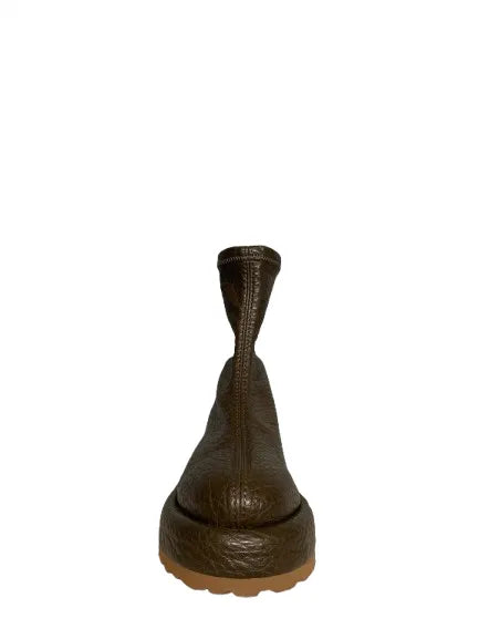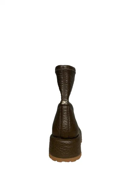 Botín en color negro con textura marcada, caña media y plataforma. Su diseño contemporáneo y ajustado lo convierte en una apuesta moderna y juvenil.