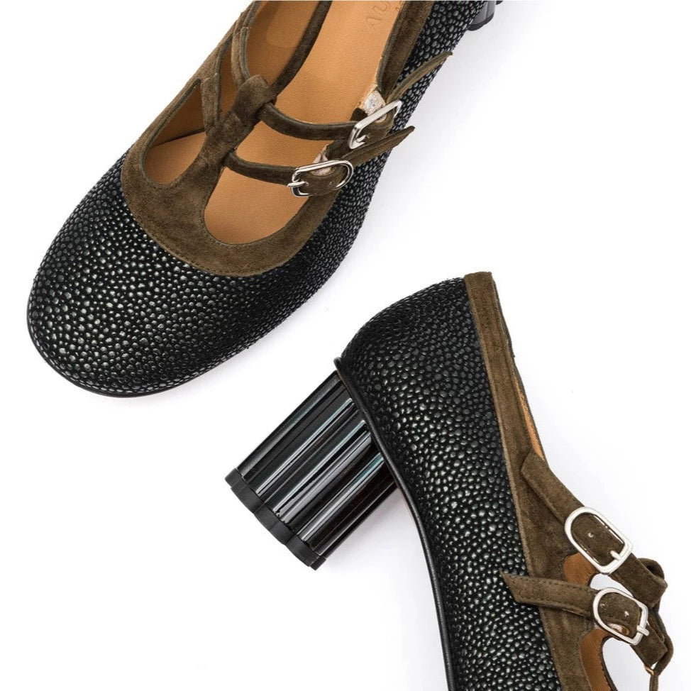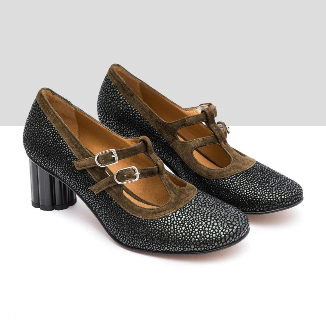 Zapato de tacón medio en piel de ante verde grabada y piel de ante verde caqui. Diseño estilo 'Mary Jane' renovado con pieza sobre el empeine con dos correas con hebillas en tono piel de ante verde caqui creando efecto contraste entre pieles. Ajuste perfecto sobre el pie dando máxima sujeción en el tobillo y talón. Puntera ligeramente redondeada y tacón especial en tono negro brillo de base ancha con absoluto confort. Forro en piel natural. Planta acolchado soft.