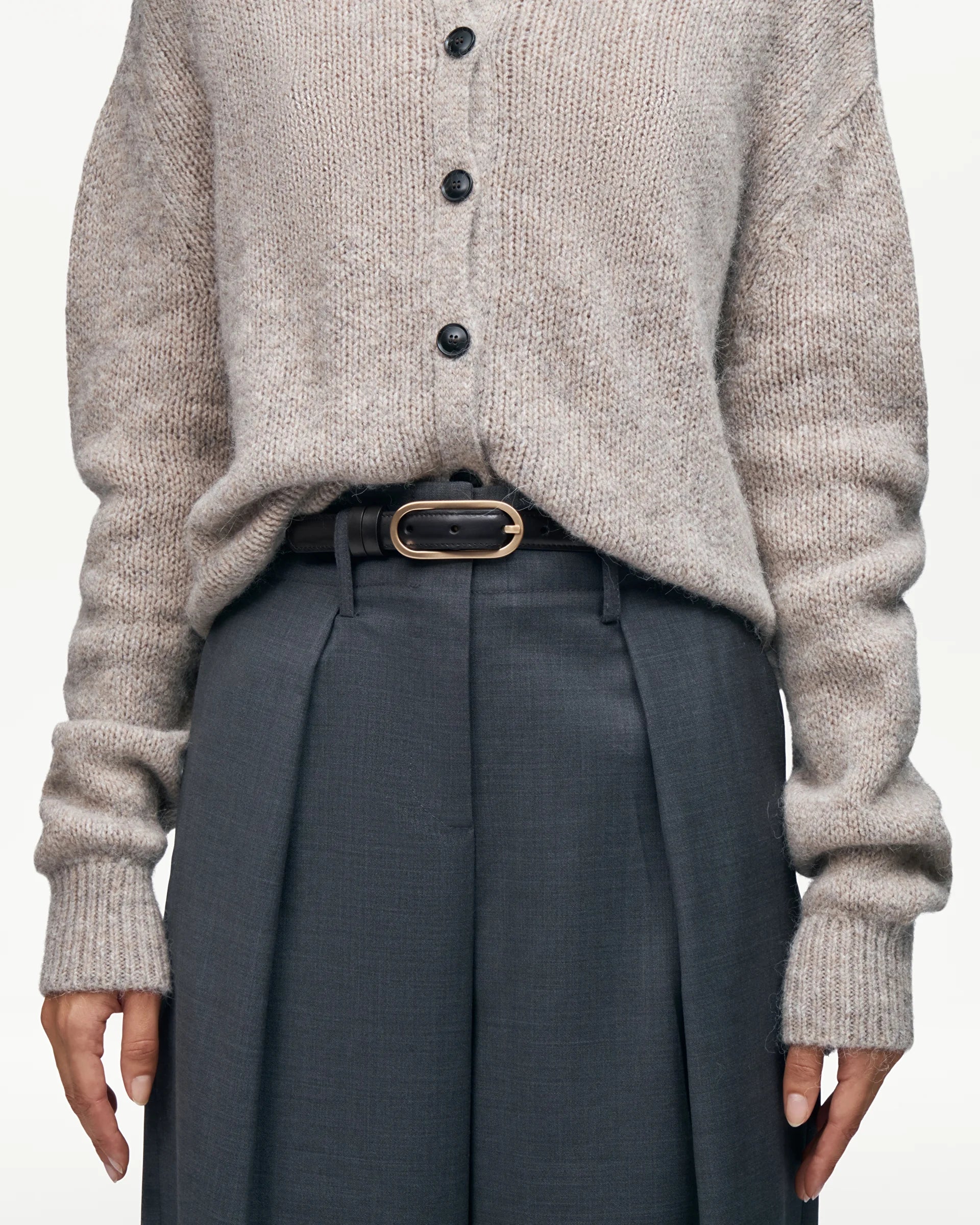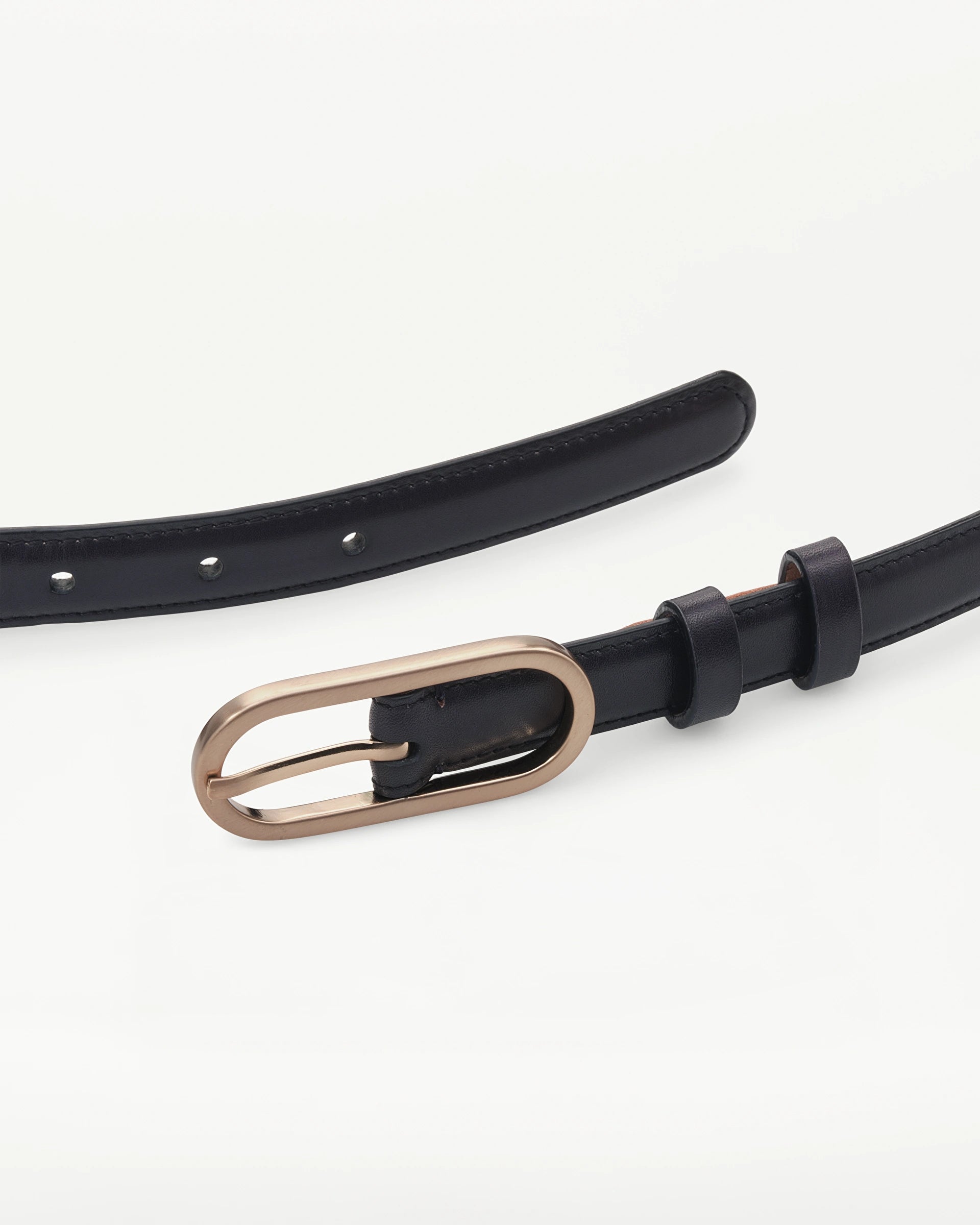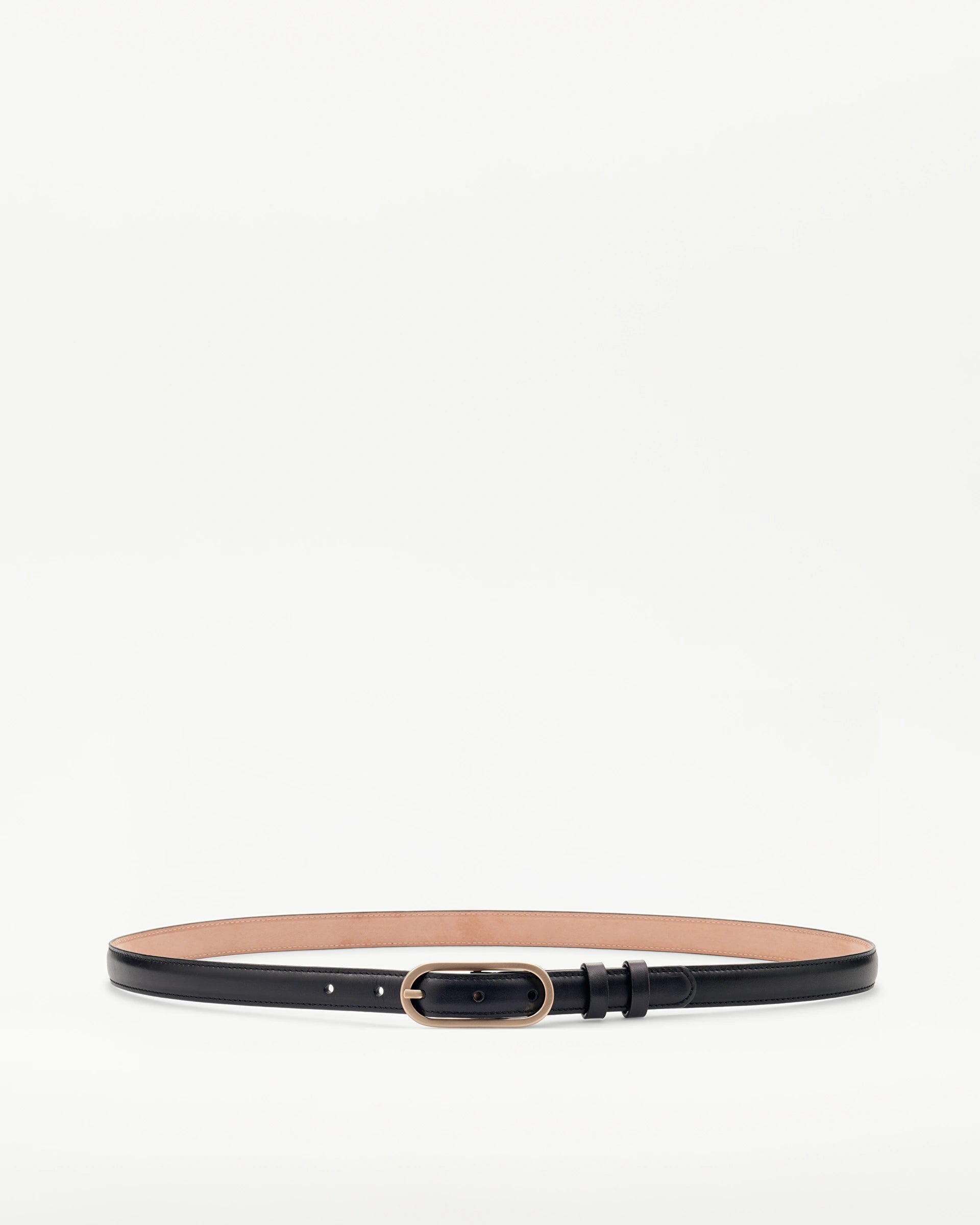 Descripción del producto: Este sofisticado cinturón Lottusse está confeccionado con la mejor piel de becerro, teñida a mano en azul marino para un acabado único. Su forma estrecha la hace ideal para envolver prendas de corte holgado o para realzar cualquier vestido. Está acabado con una elegante punta redondeada y una hebilla ovalada dorada.
