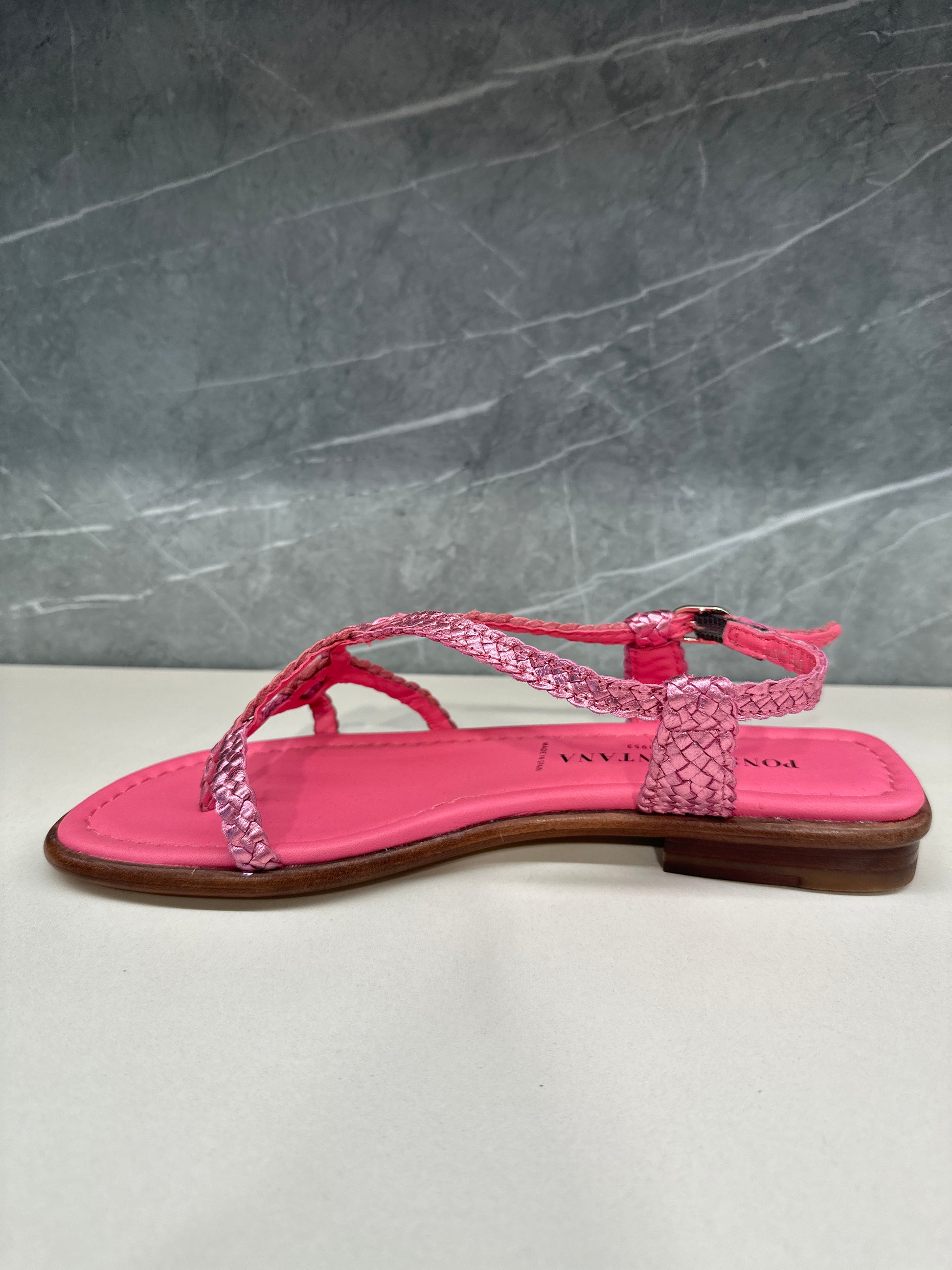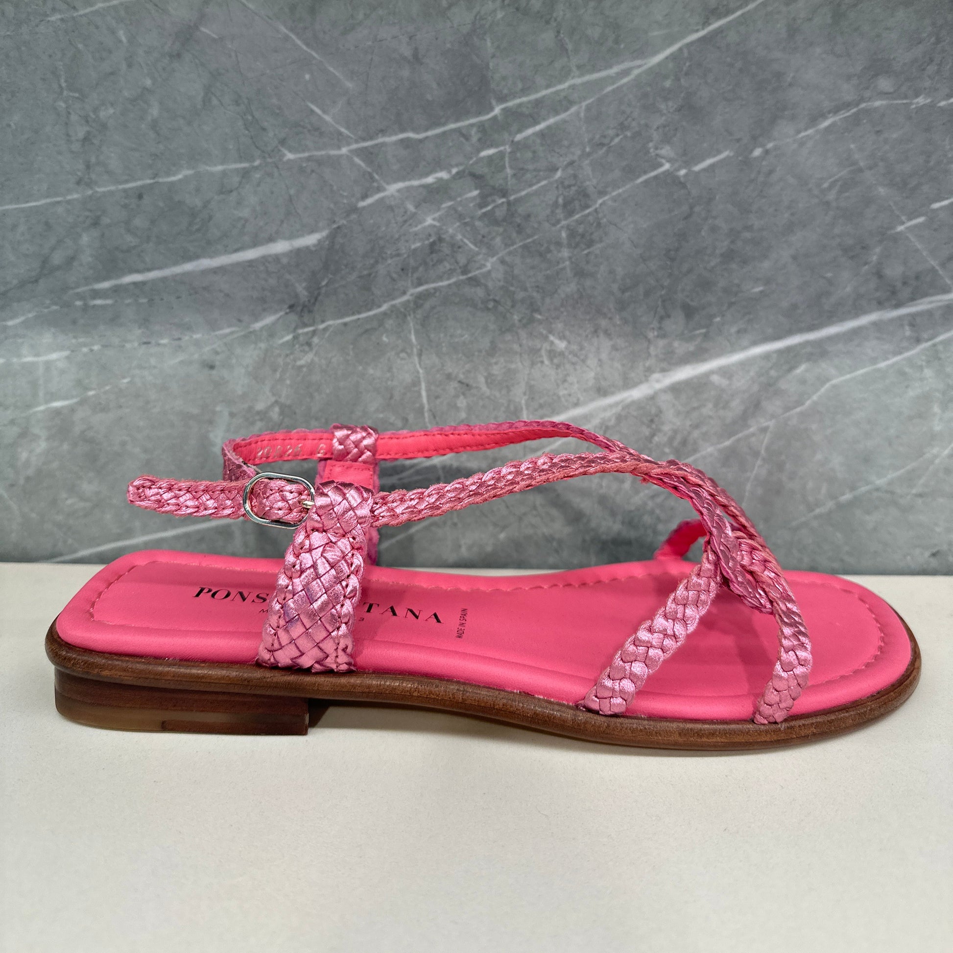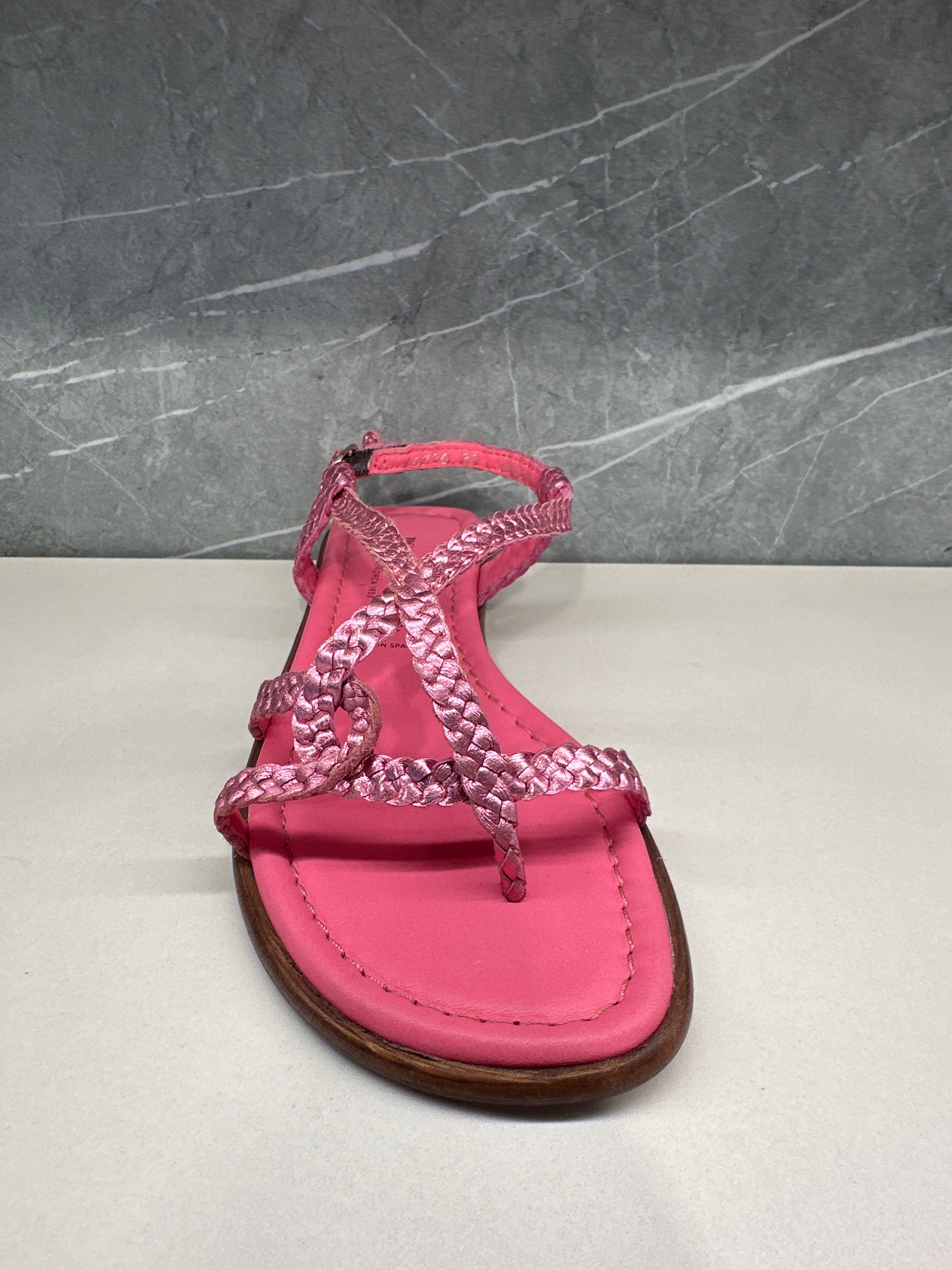 Sandalia plana Tina realizada en piel trenzada a mano color fuxia. Pala con diversas tiras alrededor del pie. Cierre mediante hebilla en el tobillo. Piso de goma antideslizante. Altura 2,5 cm.