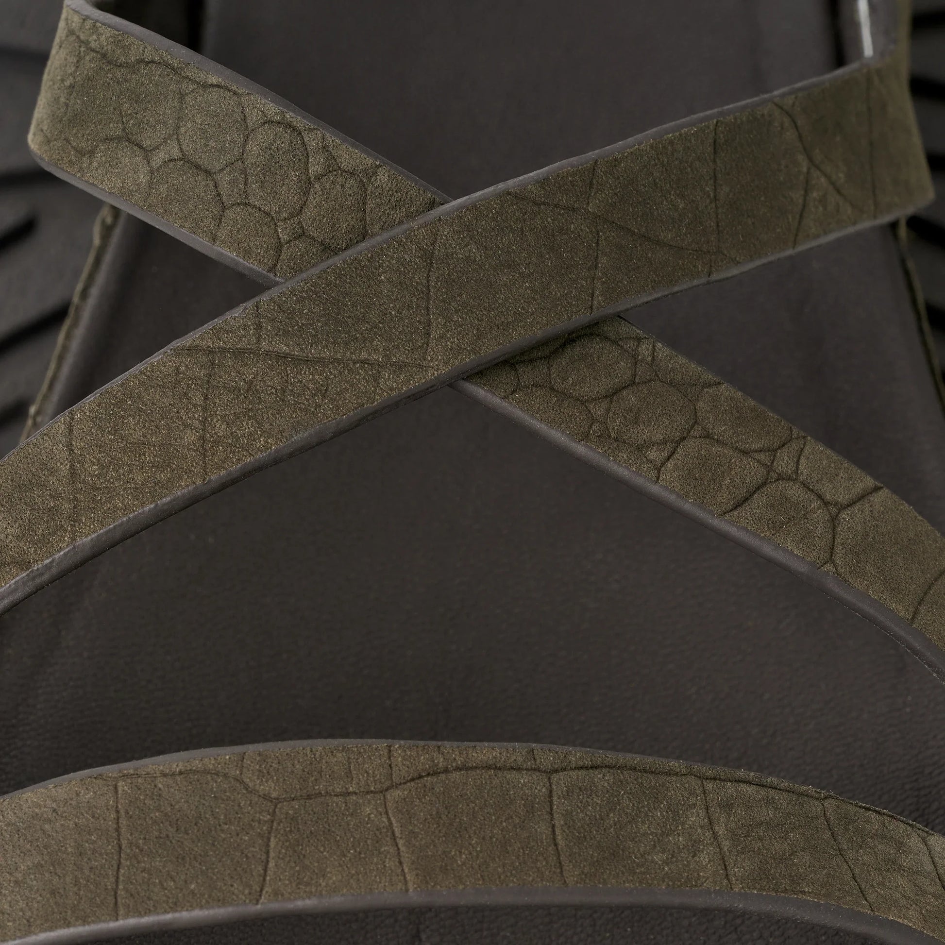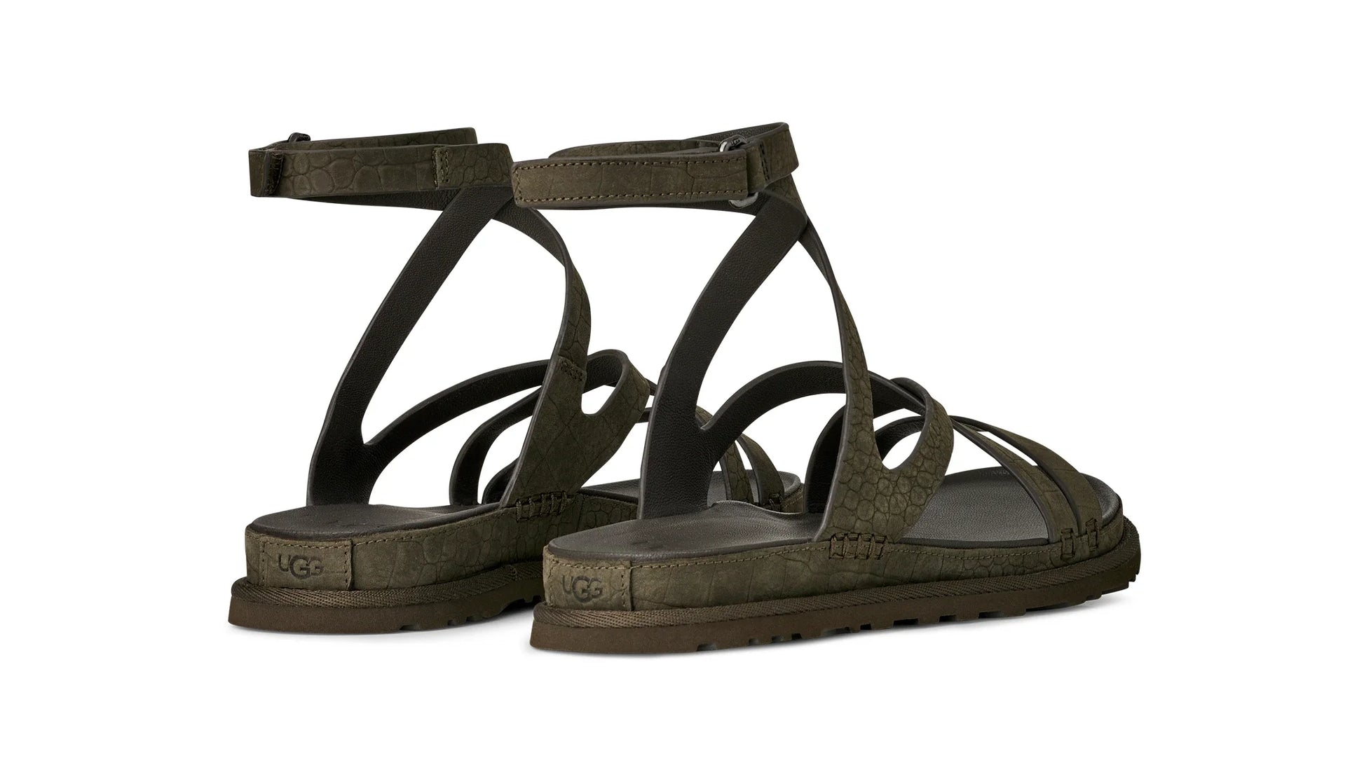 Las sandalias UGG GoldenGaze Embossed Ankle Wrap en color dense smoke (gris) destacan por su estética elevada y distintiva, pensada para quienes buscan un calzado especial con carácter. Su piel con grabado efecto cocodrilo convierte cada par en único, aportando textura y sofisticación a cualquier look.