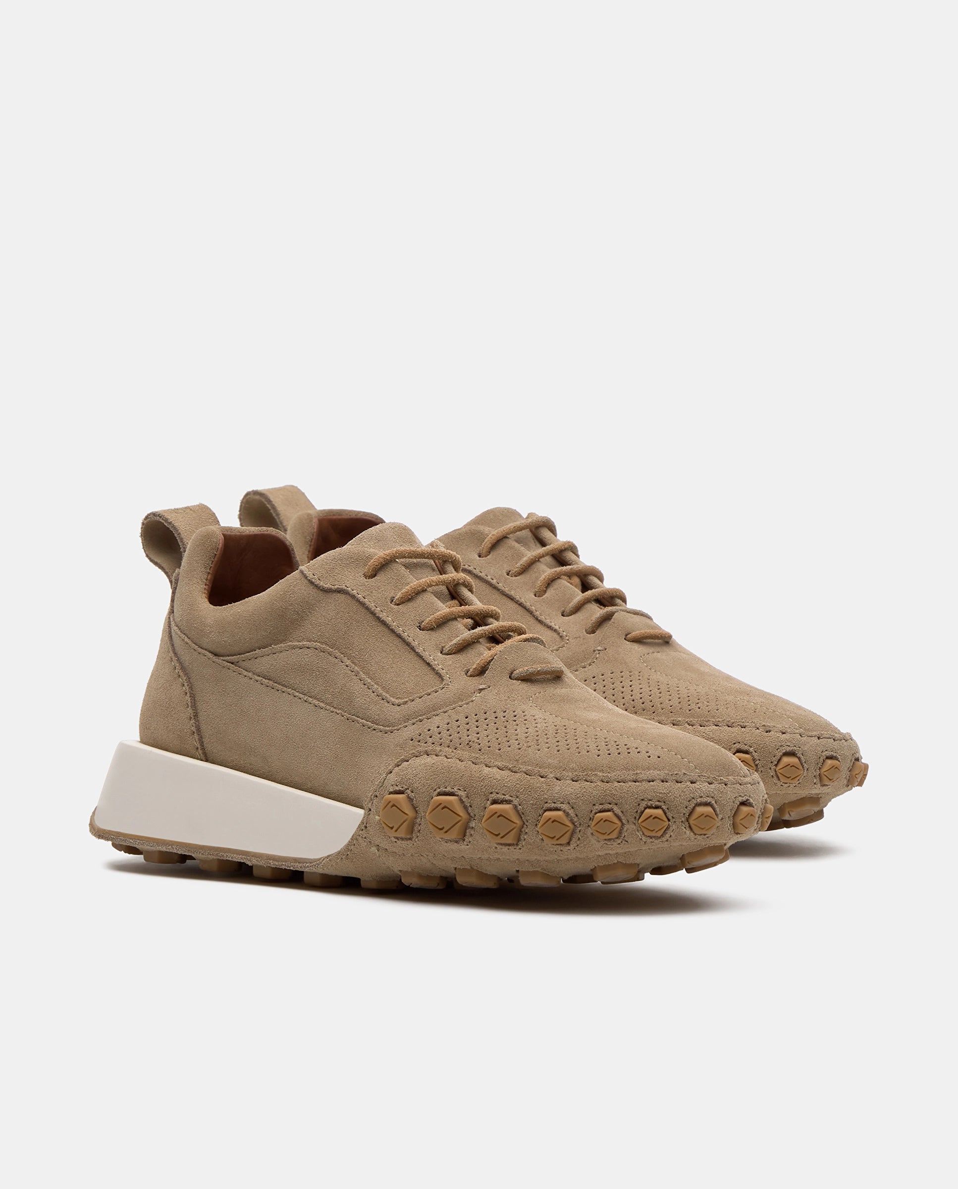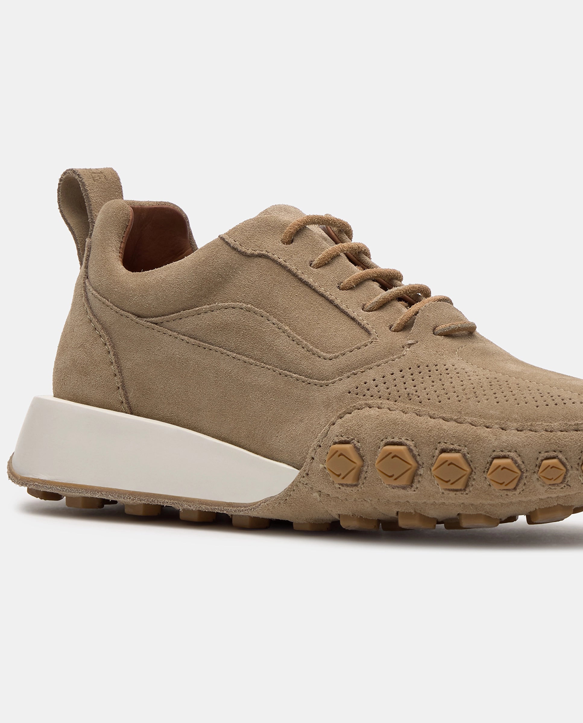 Las sneakers de vestir Lottusse ss02026-005 son una fusión perfecta entre elegancia y comodidad. Diseñadas en gamuza beige, destacan por su silhouette moderna y detalles únicos, como las perforaciones en el empeine y los cordones en tono crudo, que aportan un toque sofisticado y versátil. La suela blanca con inserciones hexagonales en goma marrón no solo aporta un diseño llamativo, sino también estabilidad y agarre. Además, la plantilla acolchada y el talón reforzado garantizan comodidad durante todo el día, haciendo de estas sneakers una opción ideal para looks casuales y semi-formales.